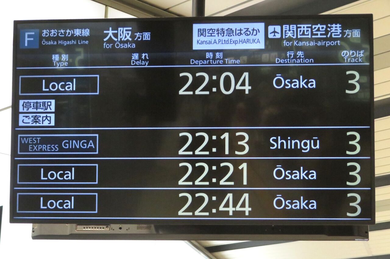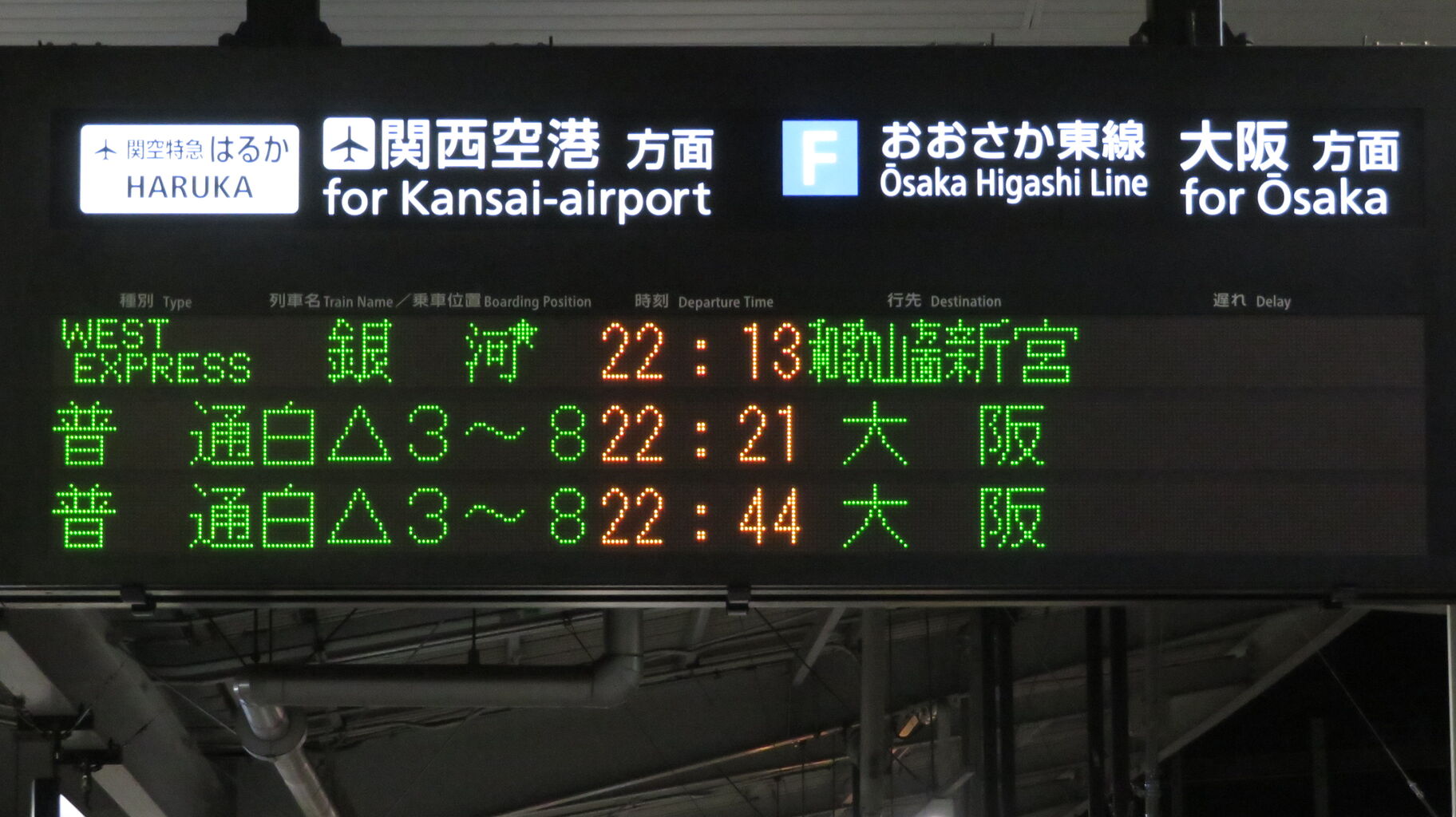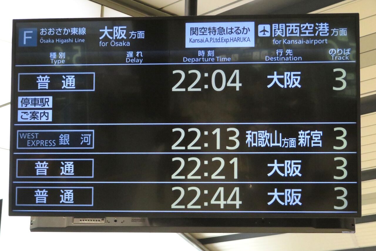 21時37分発の特急はるか56号 京都行きが発車すると、銀河の新宮行きが表示されました!