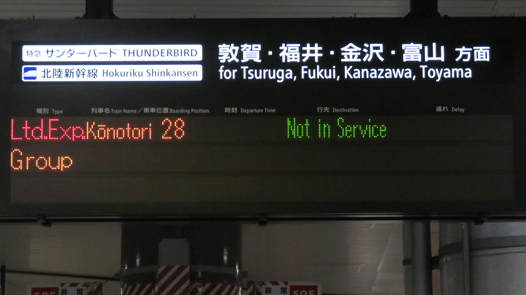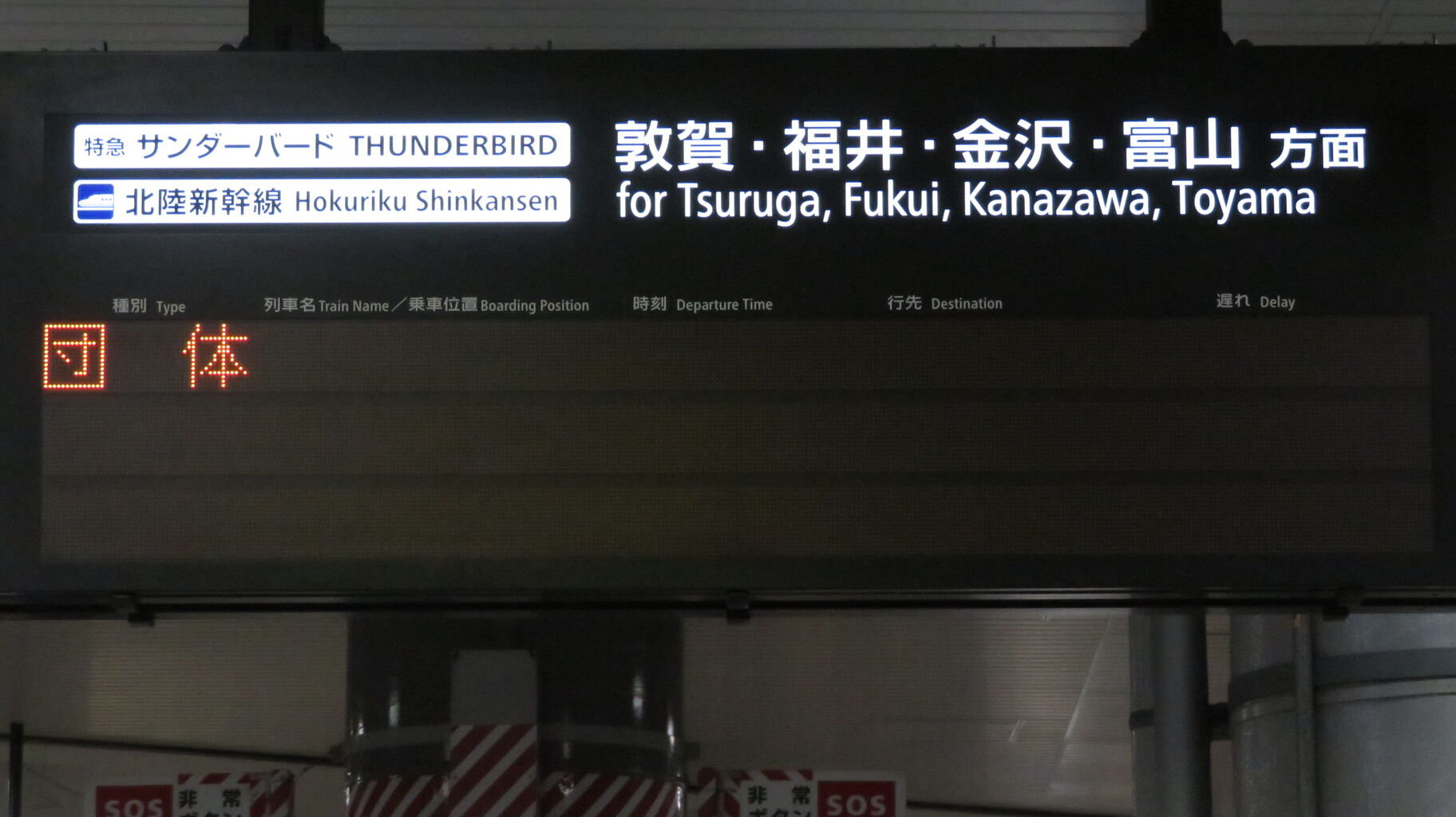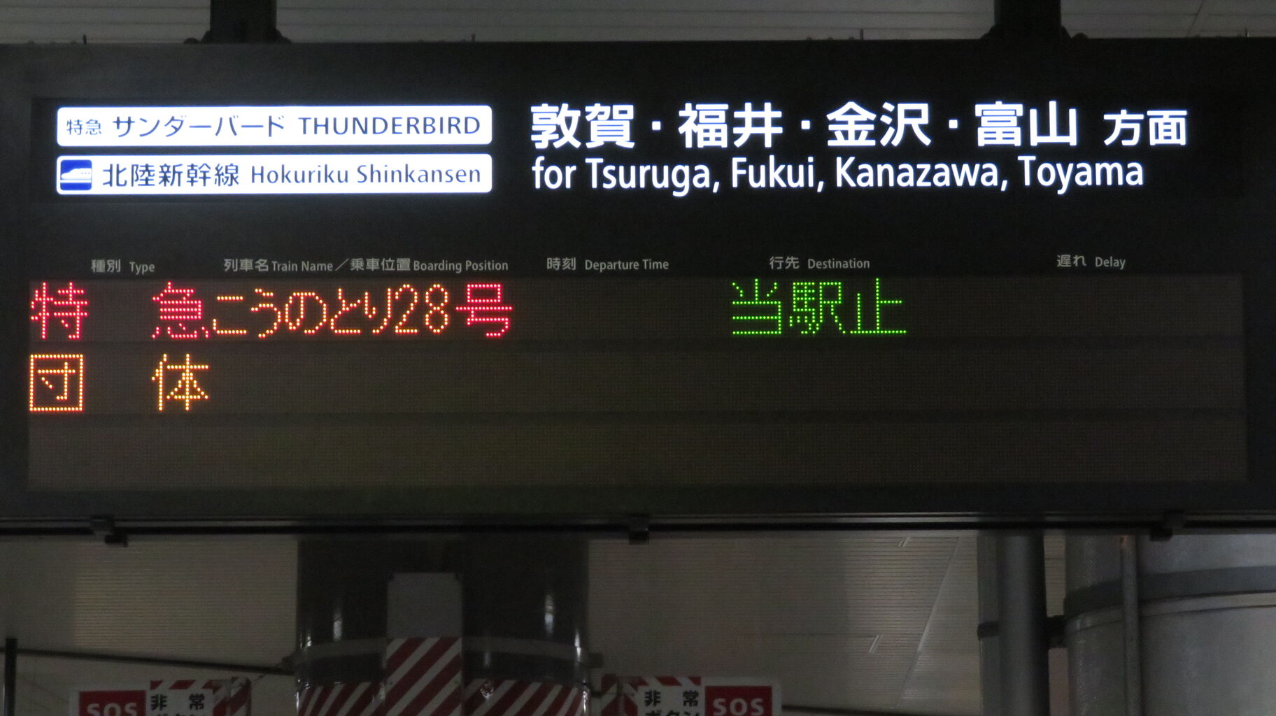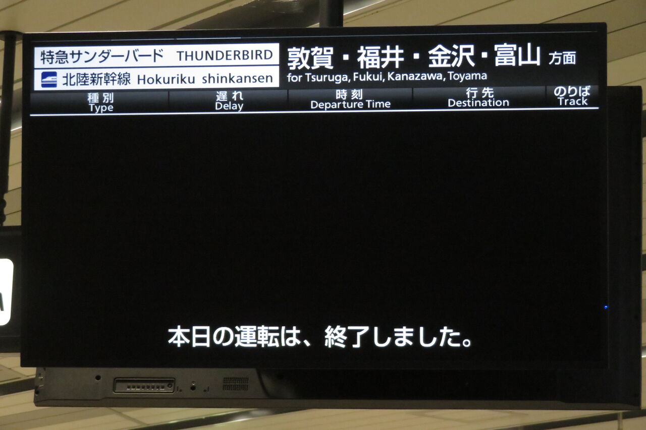 敦賀行きの銀河は 22時48分頃に新大阪駅を発車しますが、この発車標には表示されませんでした。