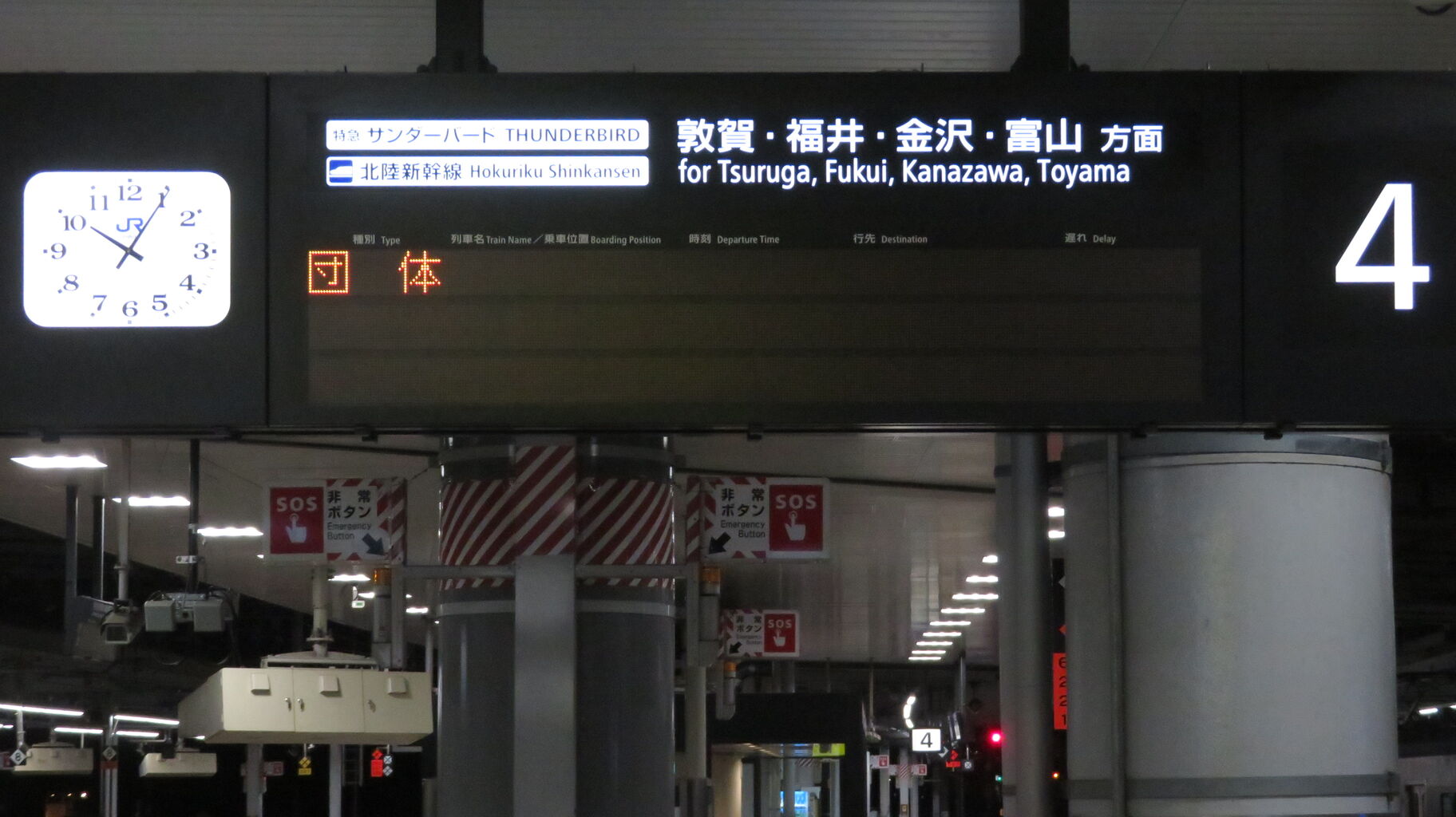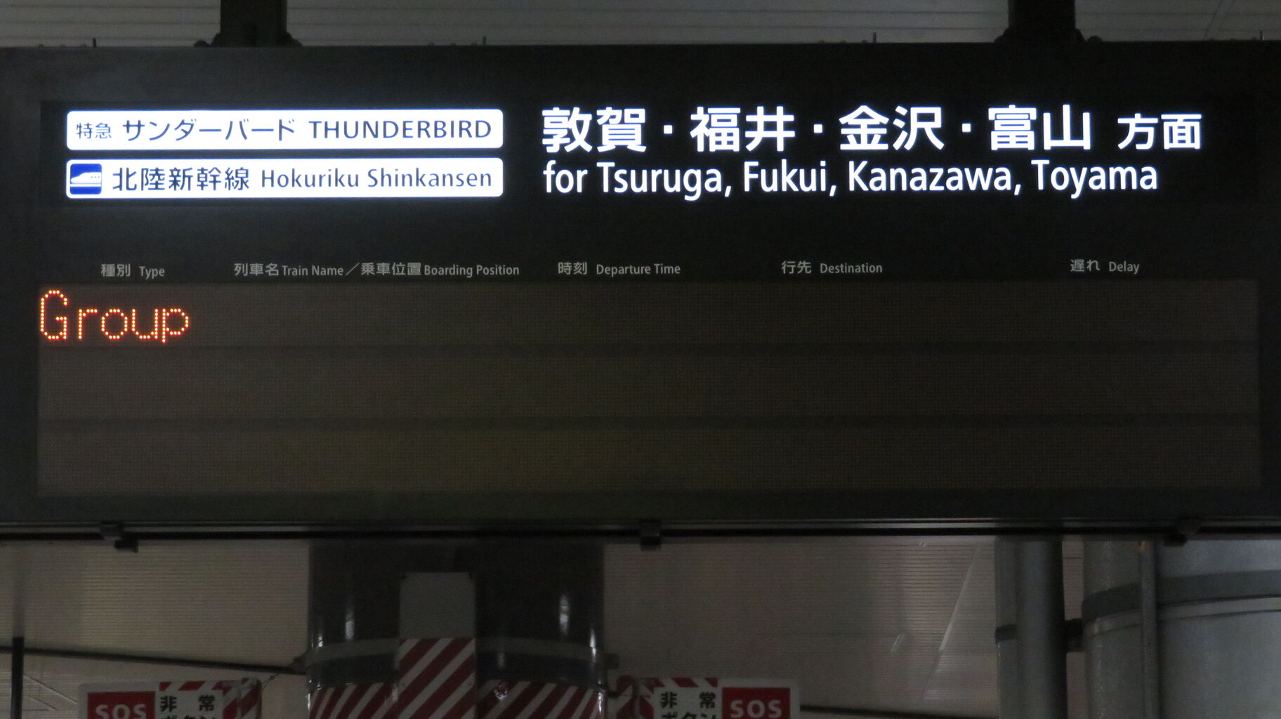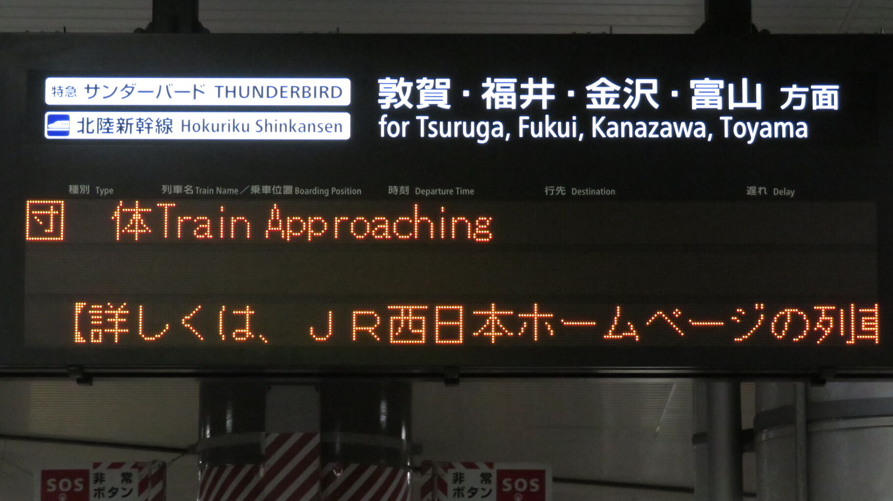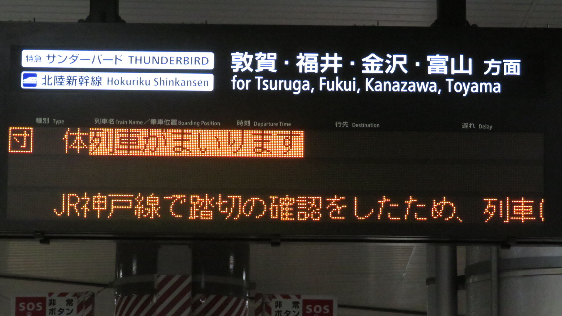 敦賀行きの銀河は 22時48分頃に新大阪駅を発車しますが、この発車標には表示されませんでした。