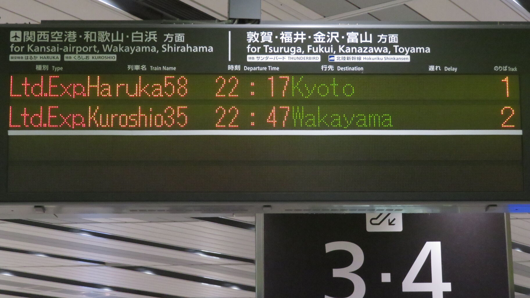 上の2段に1~3番のりばから発車する特急列車(はるか・くろしおなど)、下の2段に4番のりばから発車する特急列車(敦賀行きのサンダーバードなど)が表示されます。
