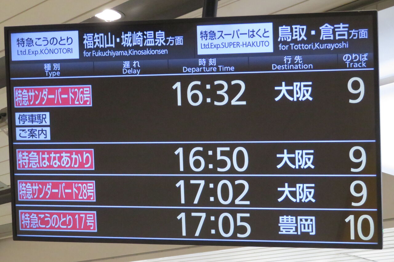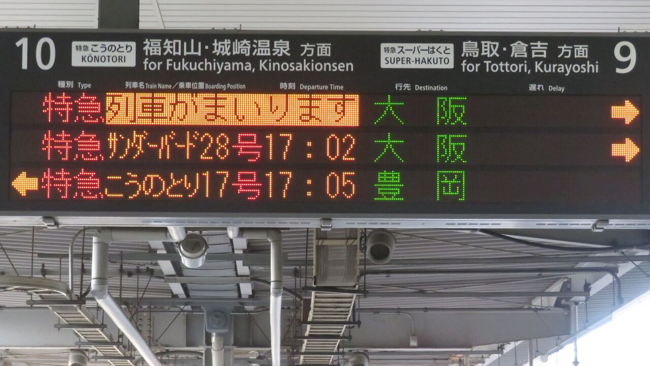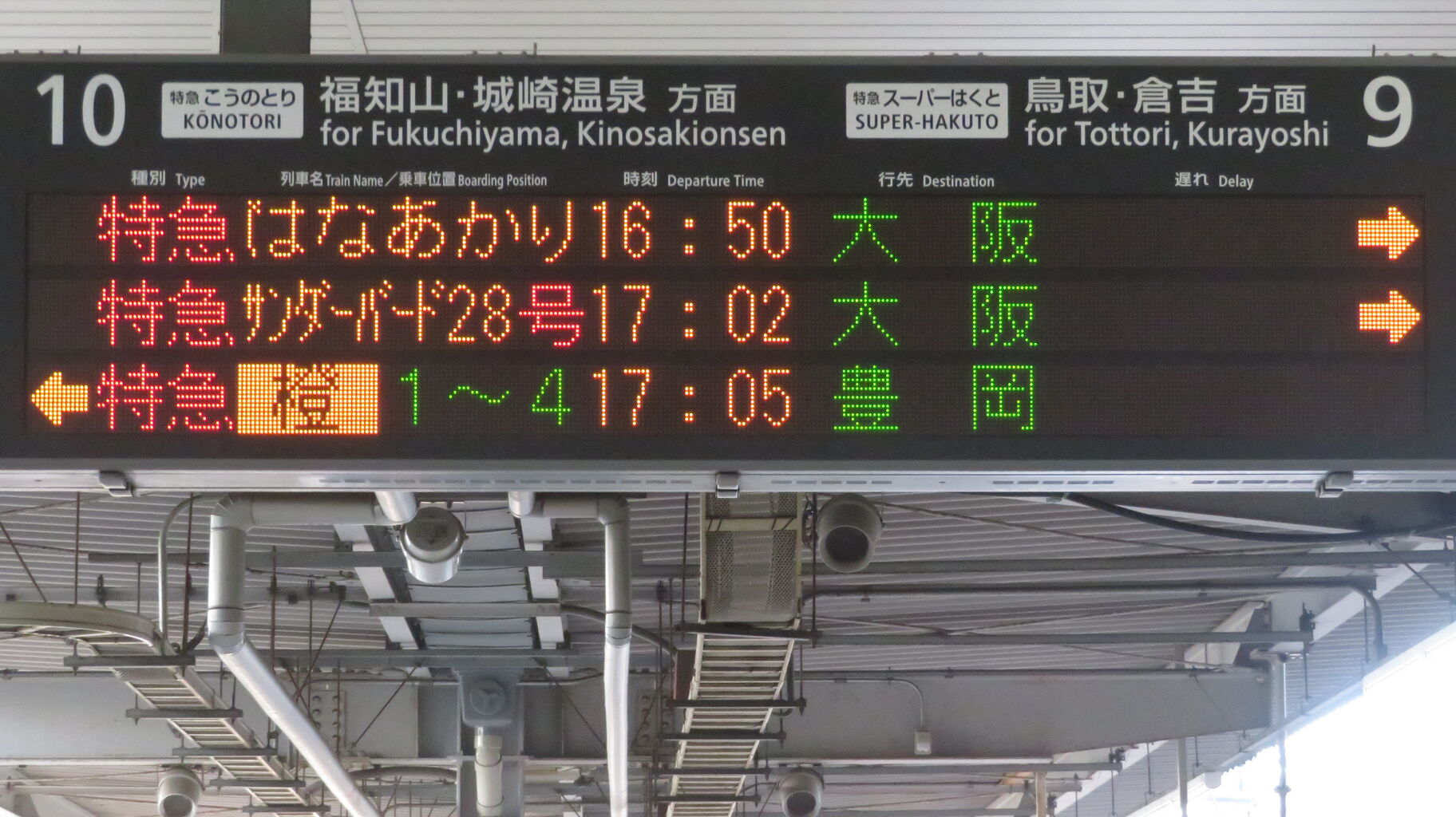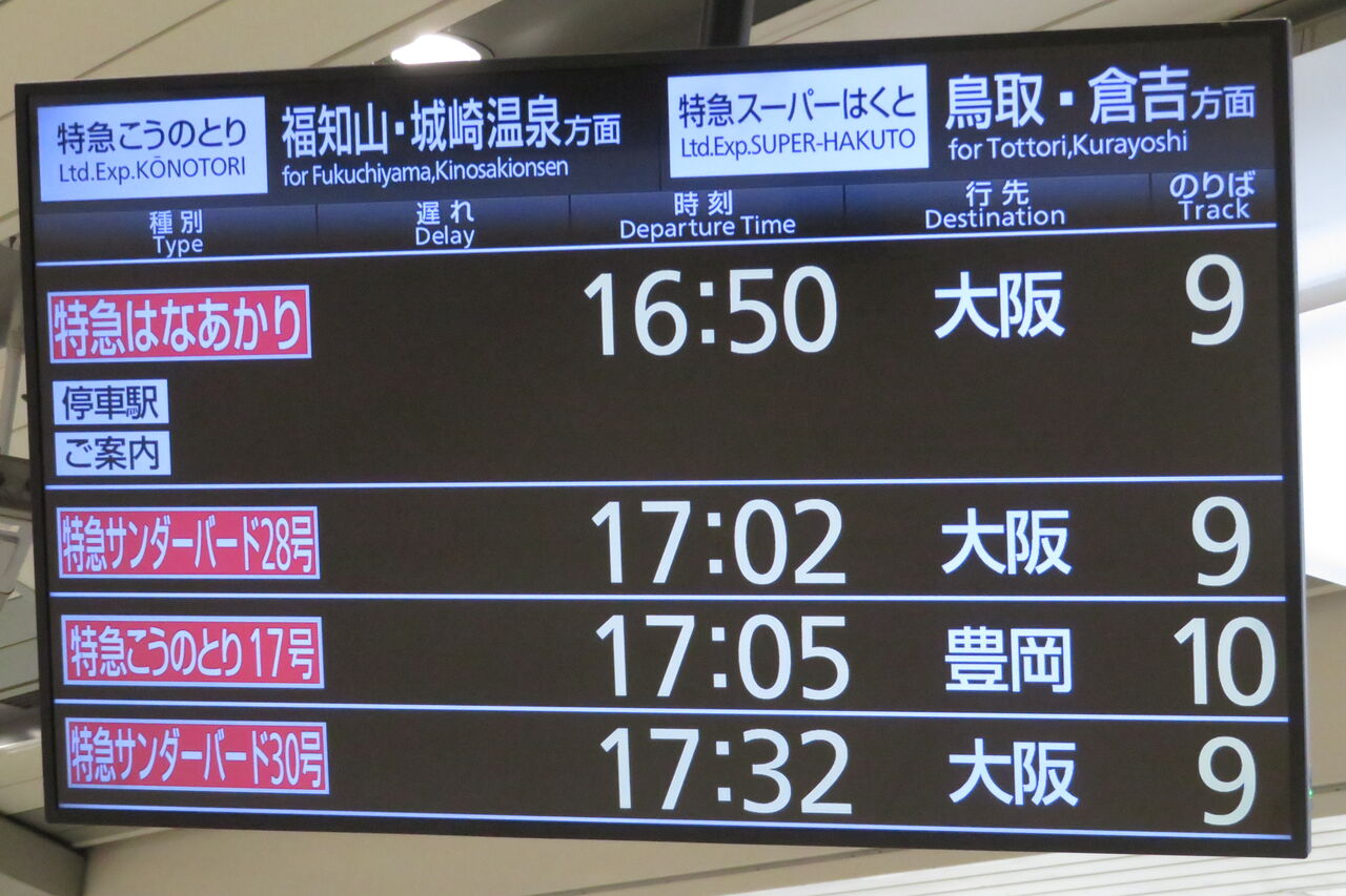 一番下の段には、特急こうのとり17号 「豊岡行き」 が表示されています。