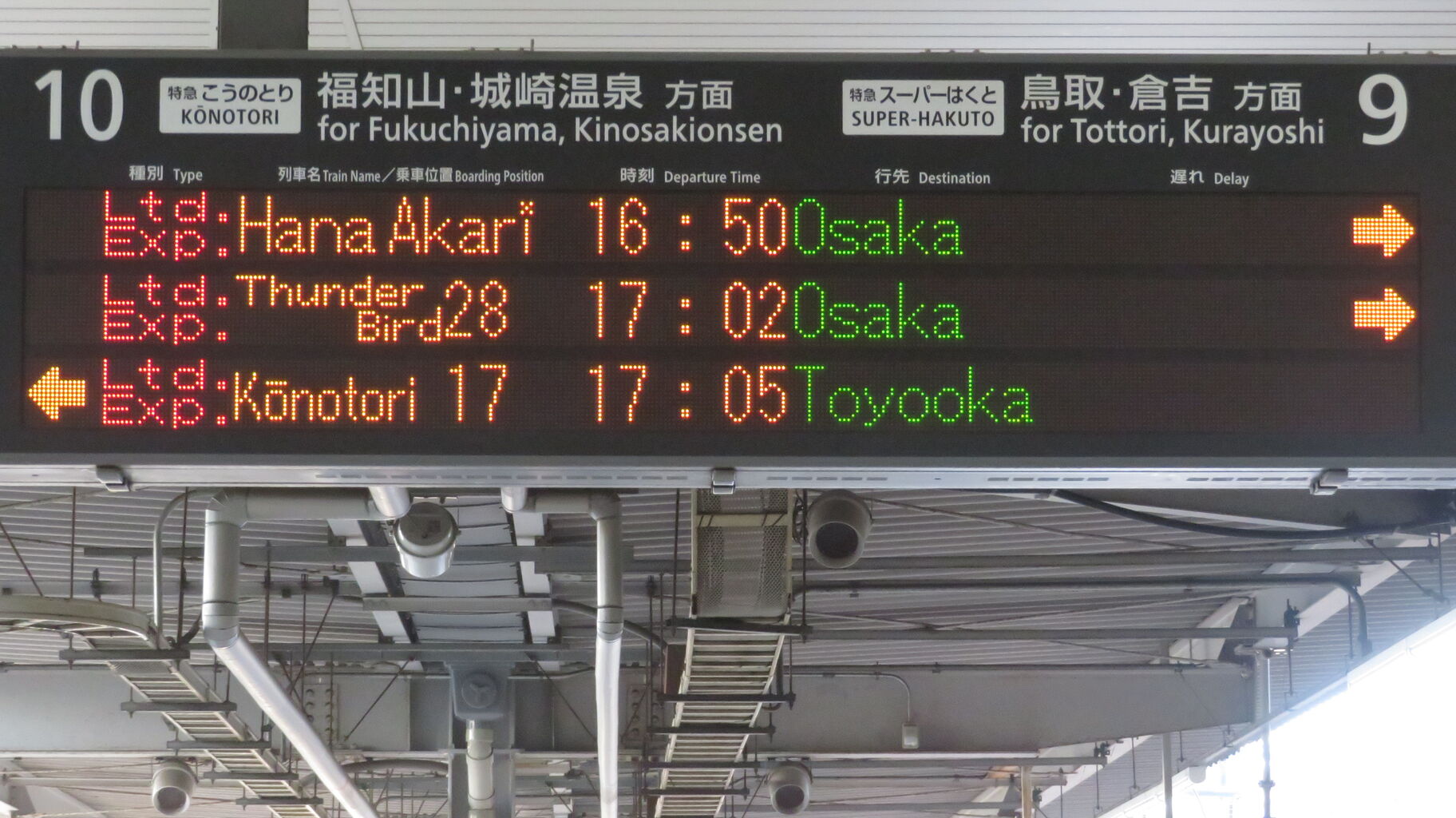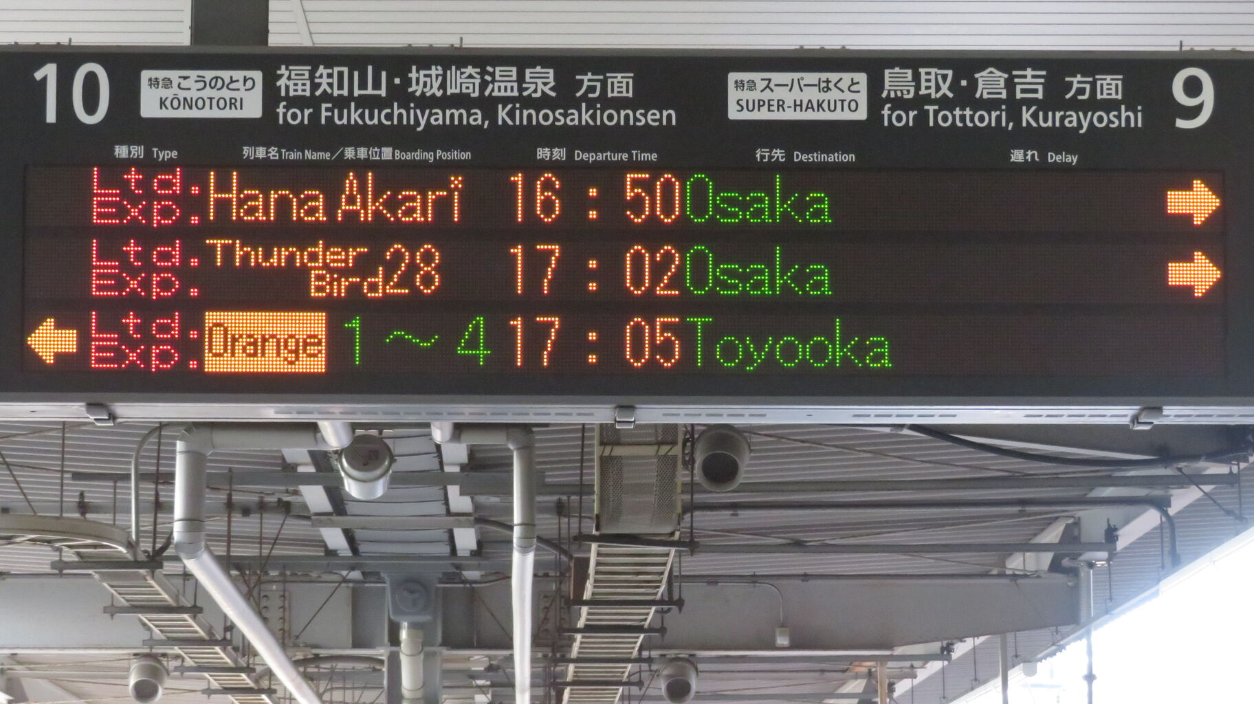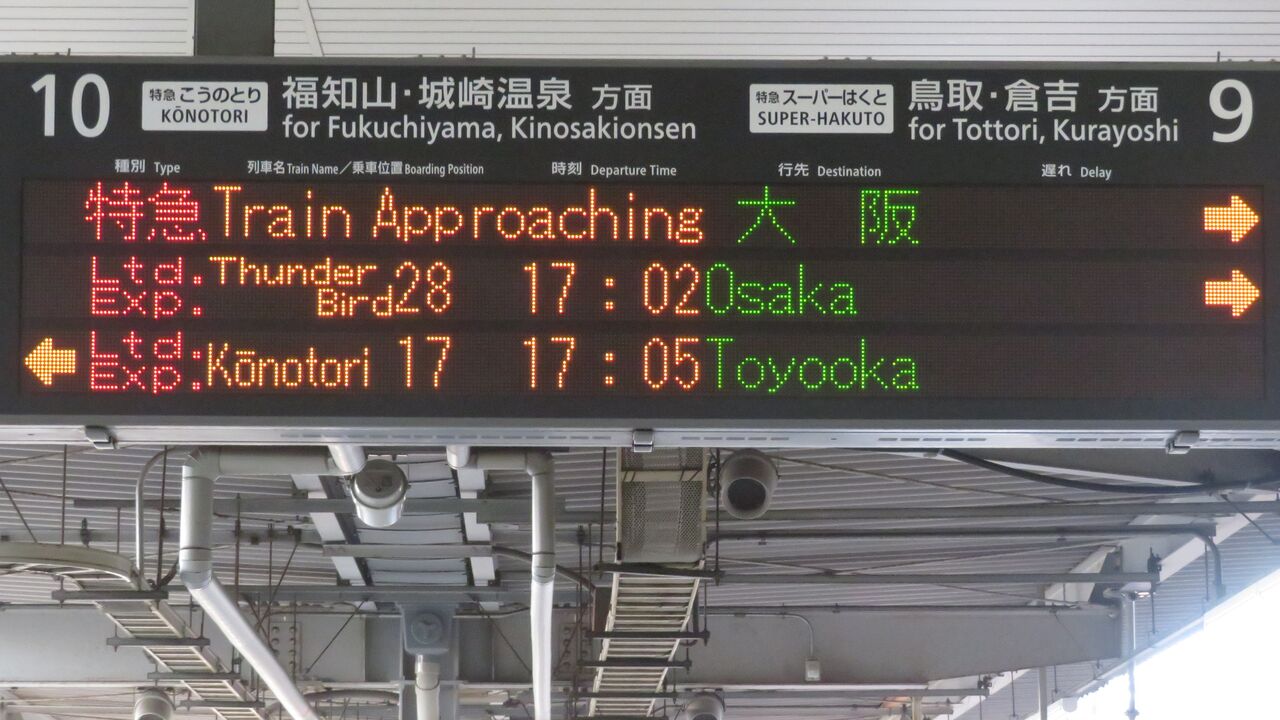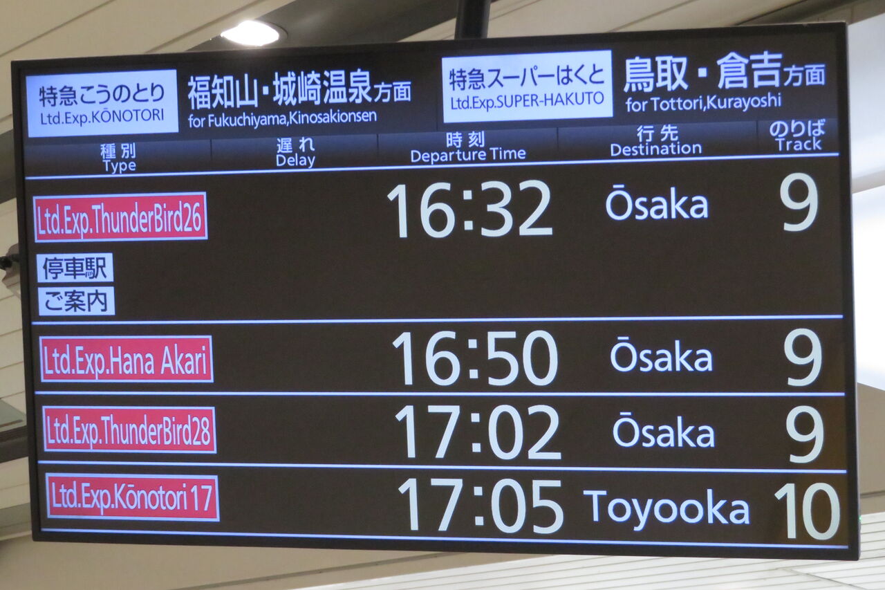 一番下の段には、特急こうのとり17号 「豊岡行き」 が表示されています。