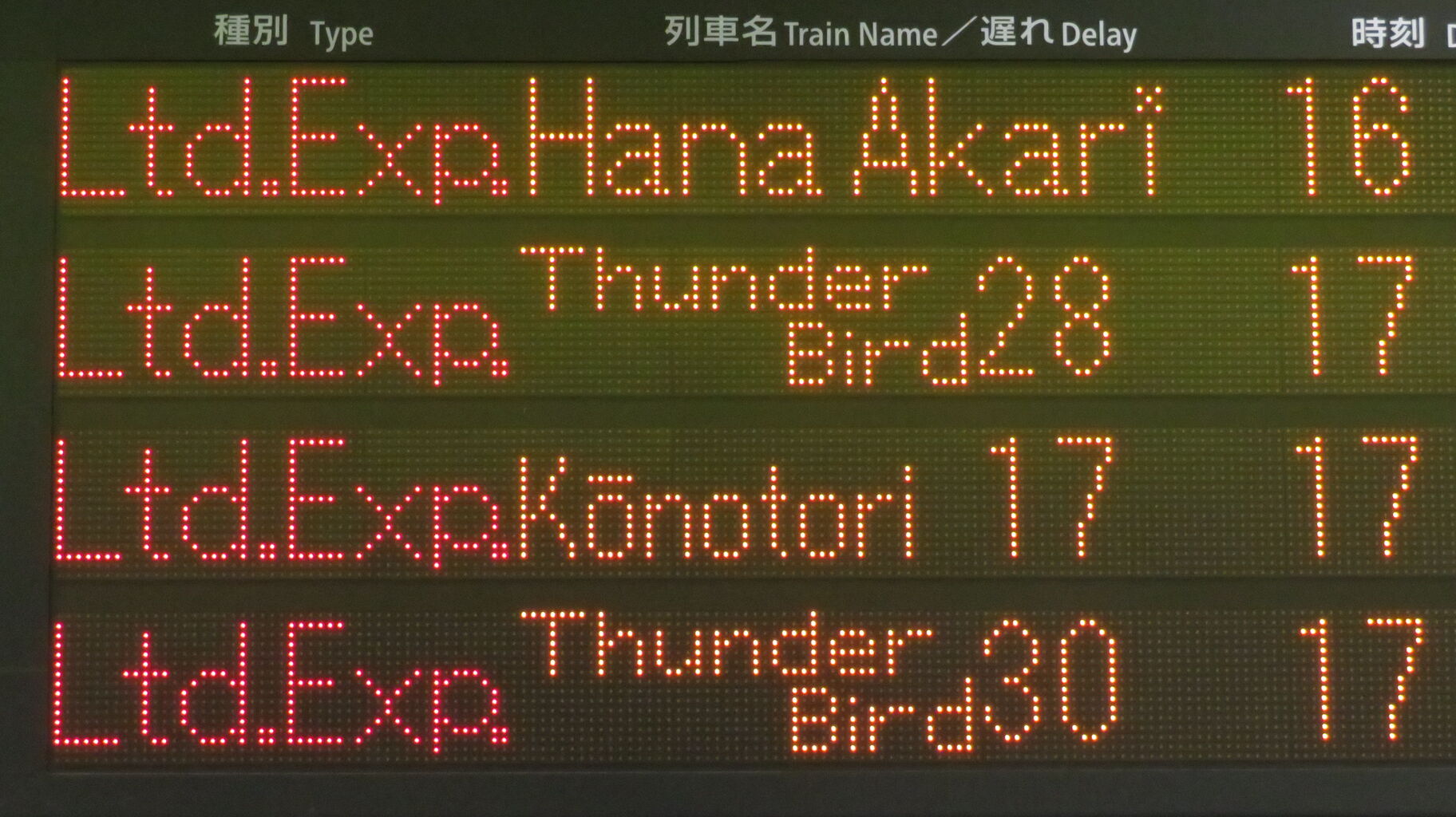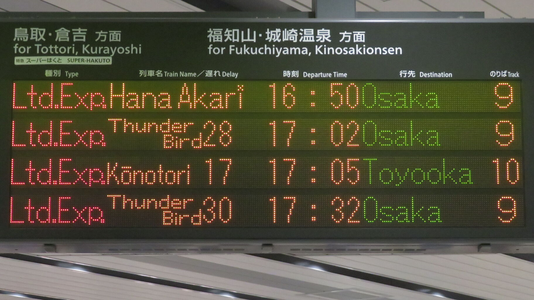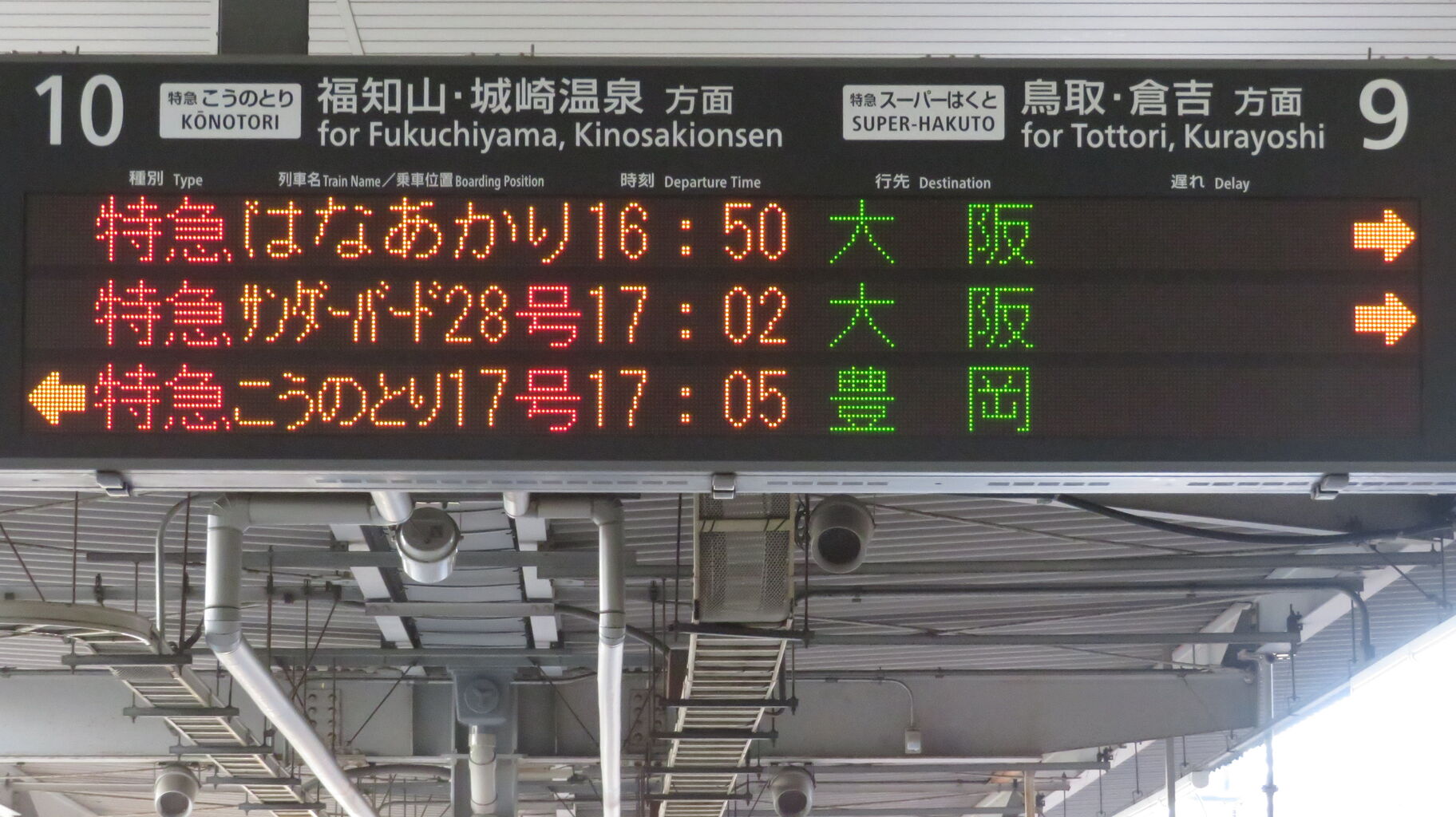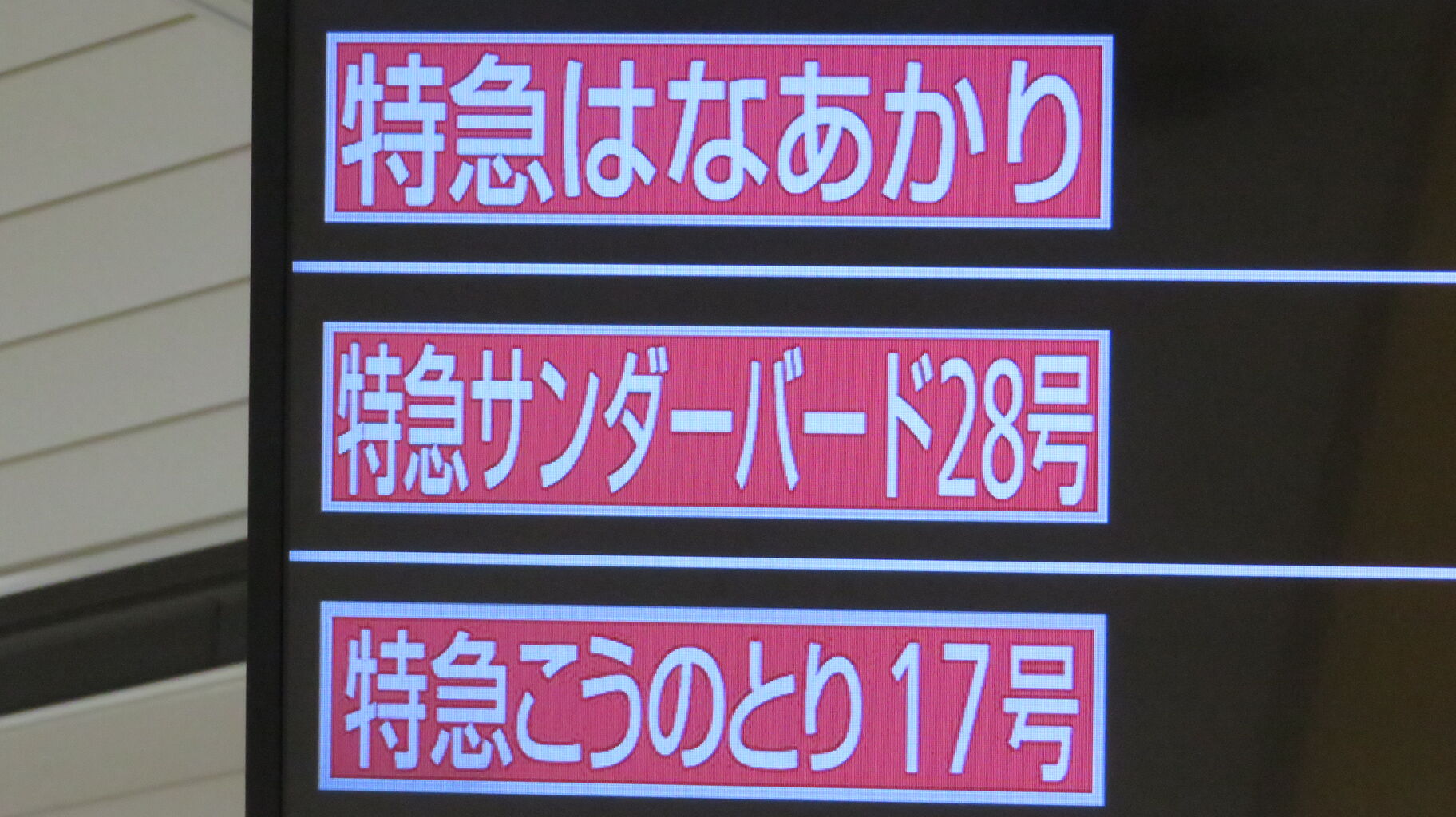 一番下の段には、特急こうのとり17号 「豊岡行き」 が表示されています。