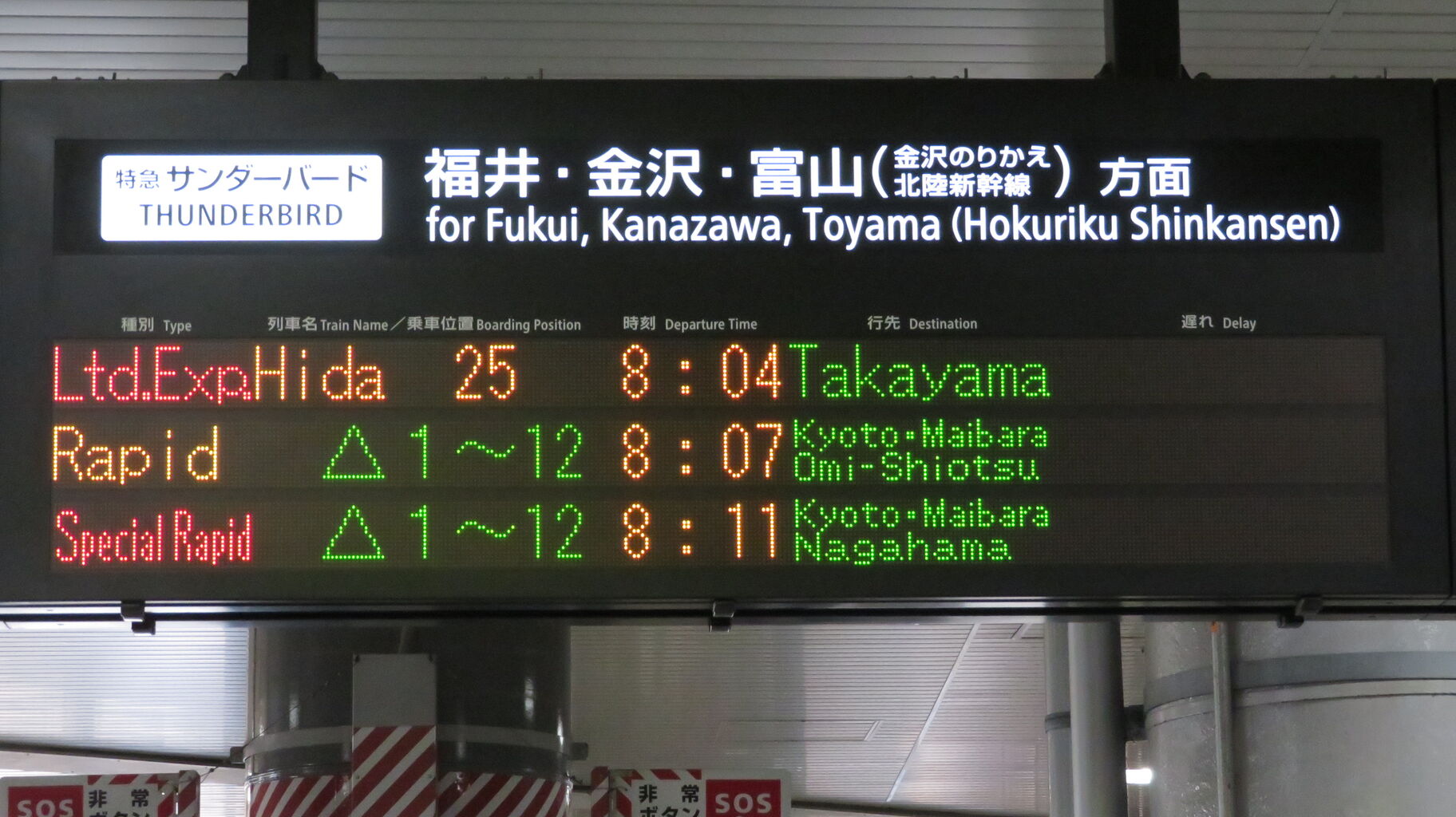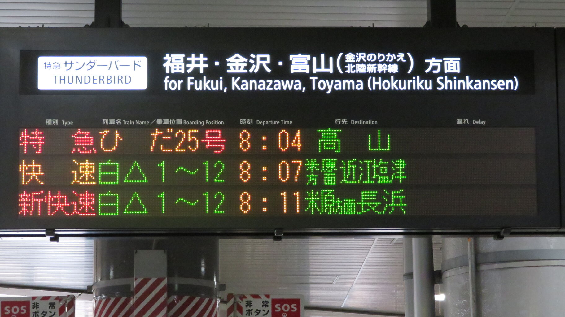 下の2段には 特急 「ひだ」 「サンダーバード」 「スーパーはくと」 といった 4番のりばから発車する特急列車が表示されます。