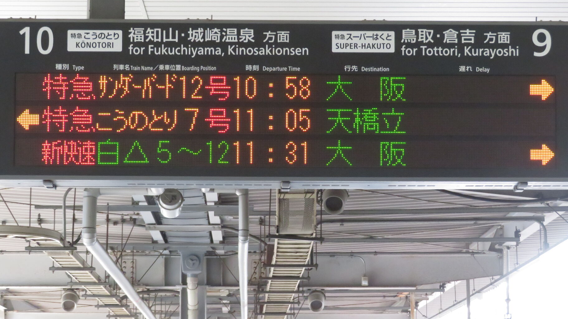 一番下の段には、その1時間後に発車する特急こうのとり9号 「城崎温泉行き」 が表示されています。