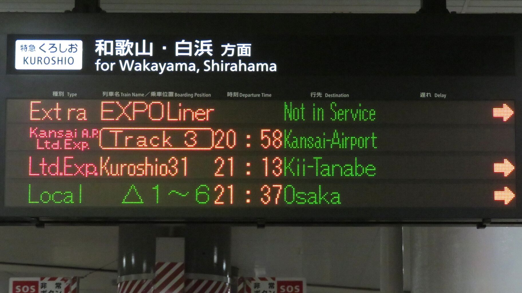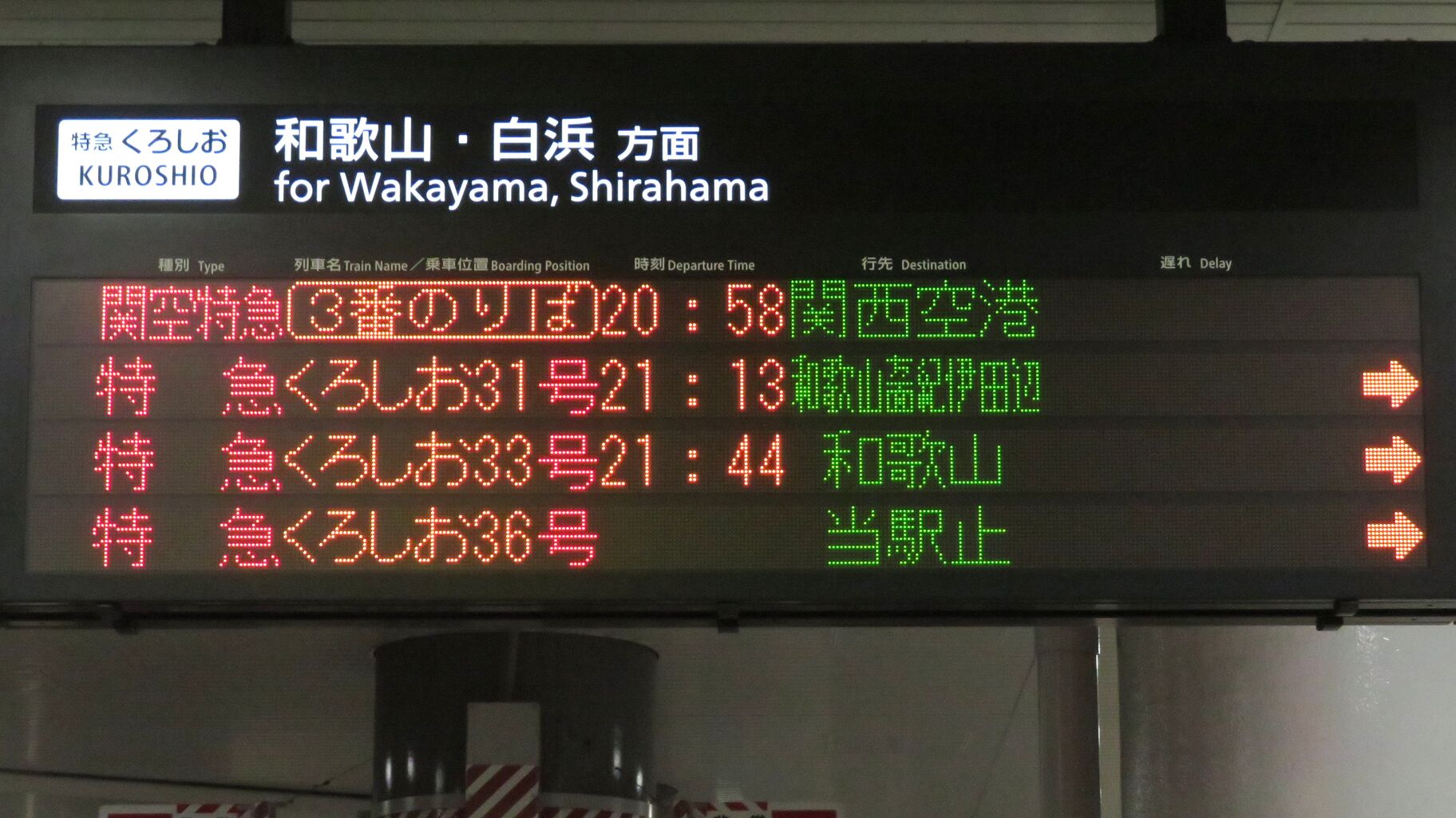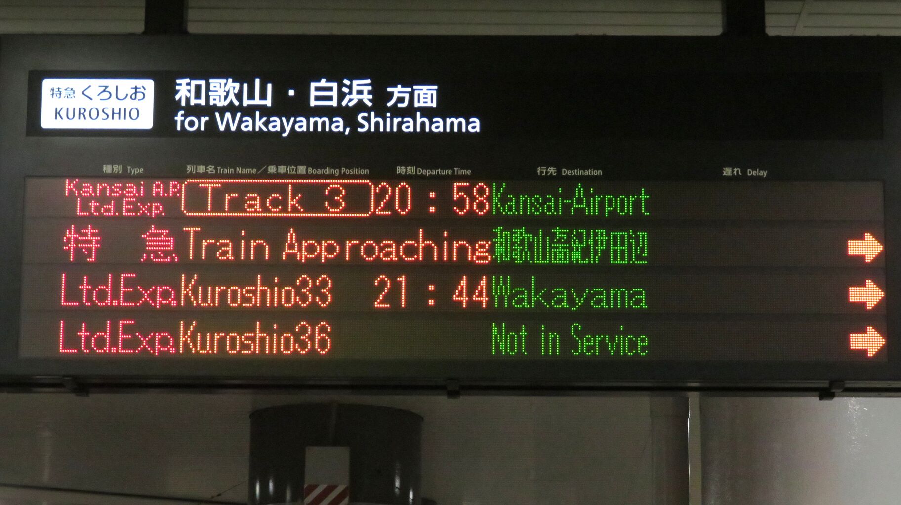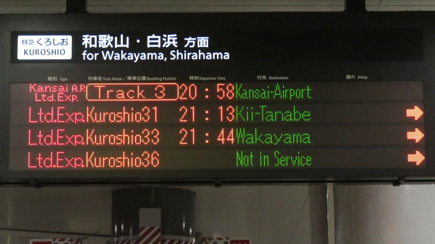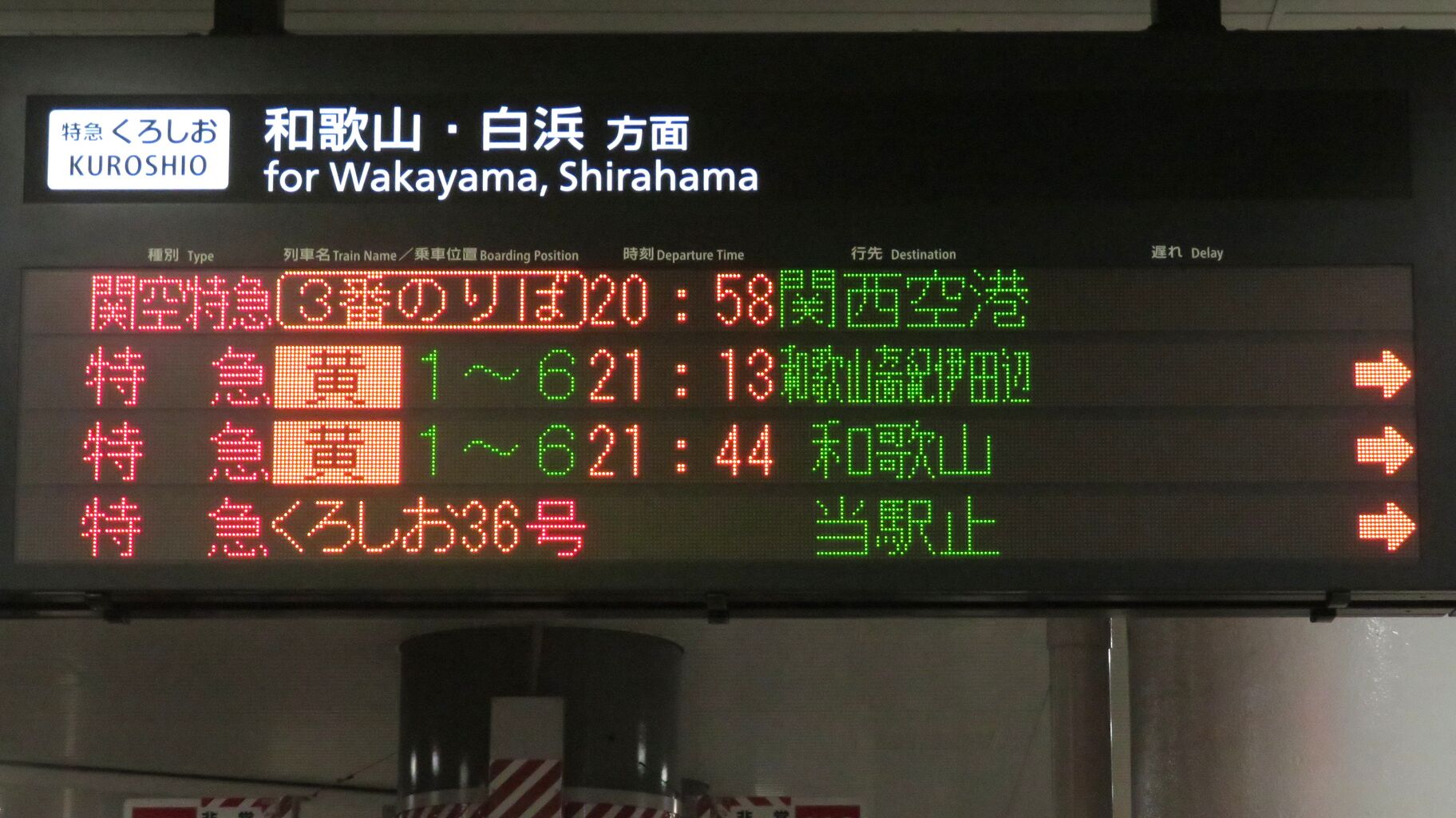 3番のりばの発車標に、隣のホーム・2番のりばから発車する特急くろしお 「紀伊田辺行き」 が表示されています。