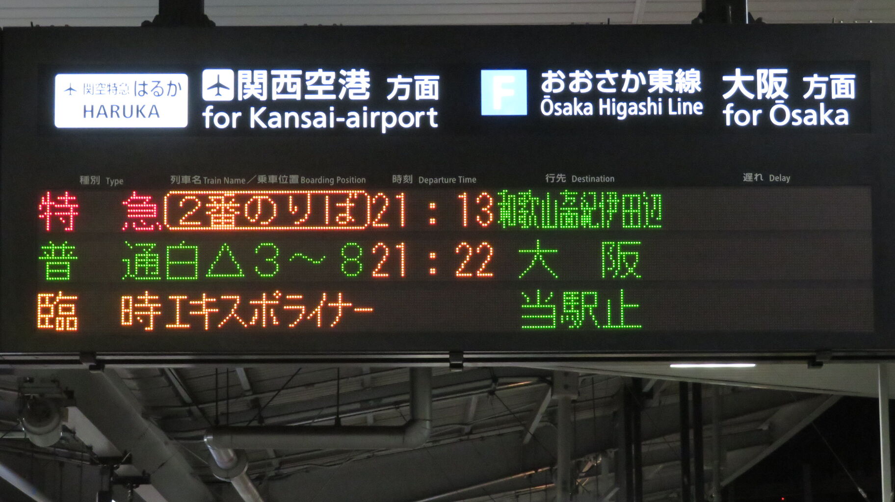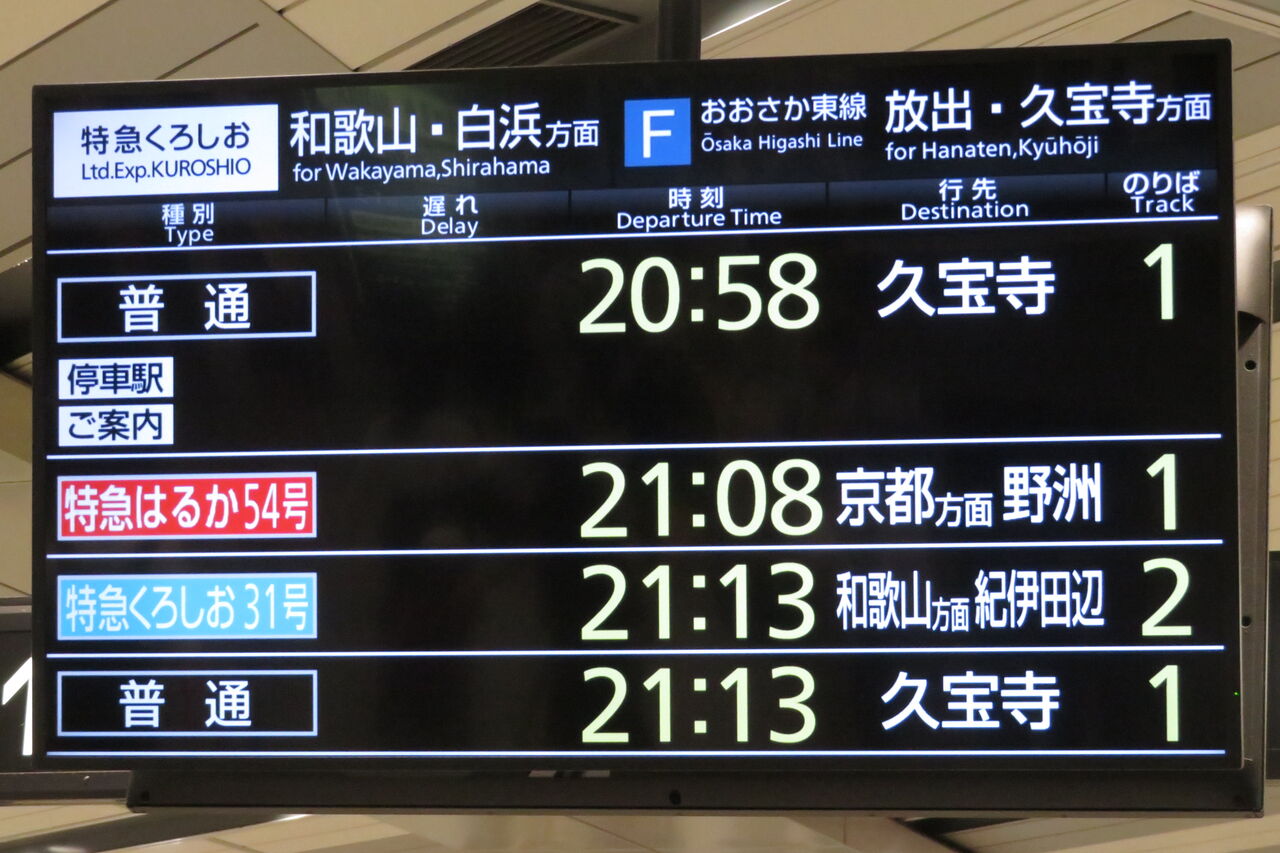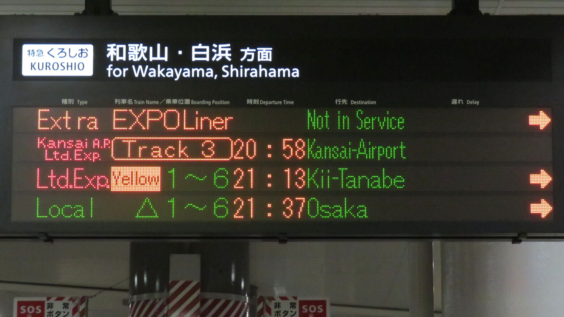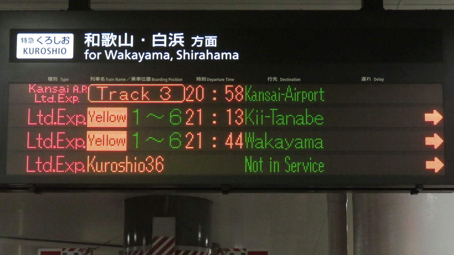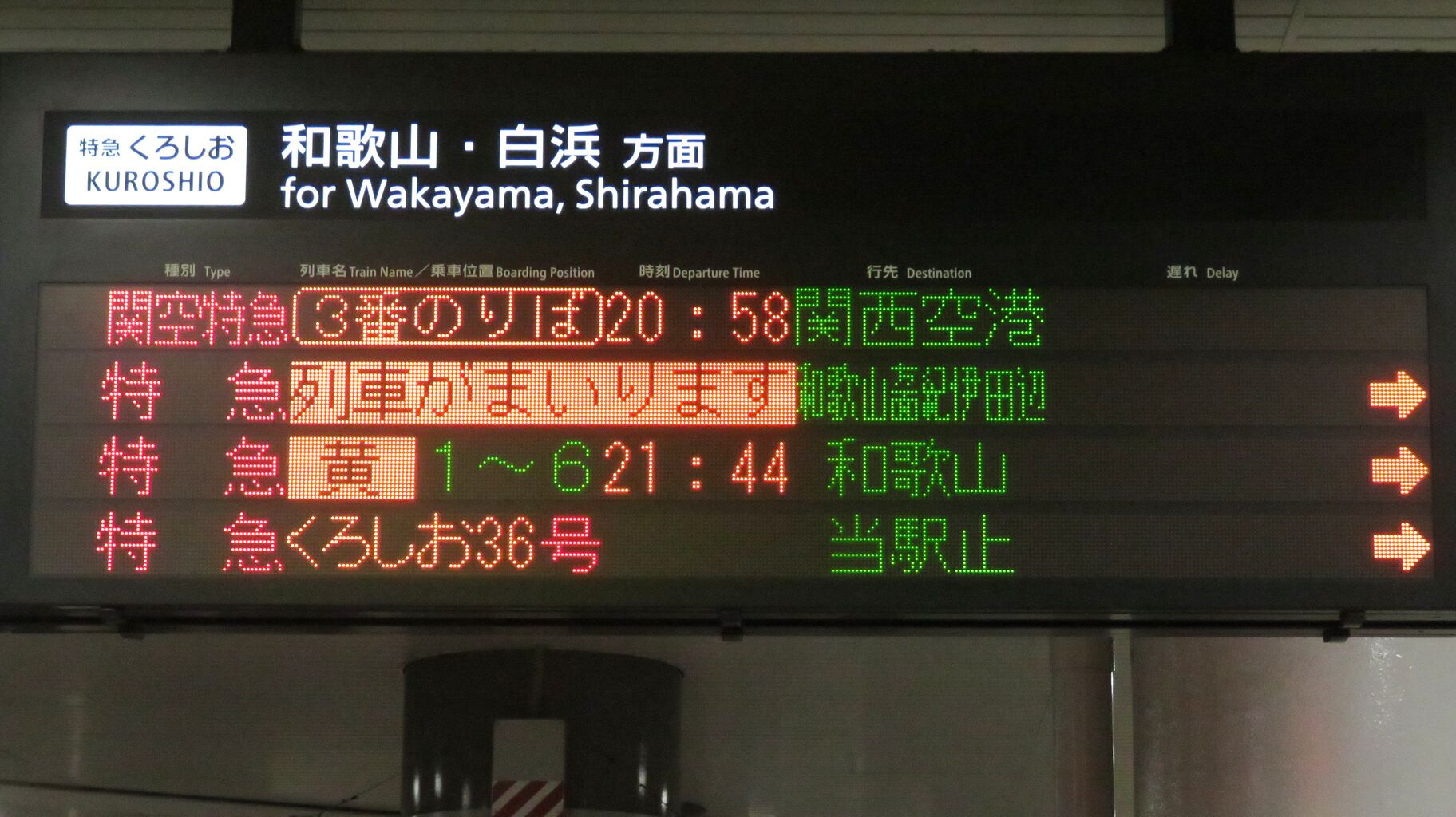 3番のりばの発車標に、隣のホーム・2番のりばから発車する特急くろしお 「紀伊田辺行き」 が表示されています。