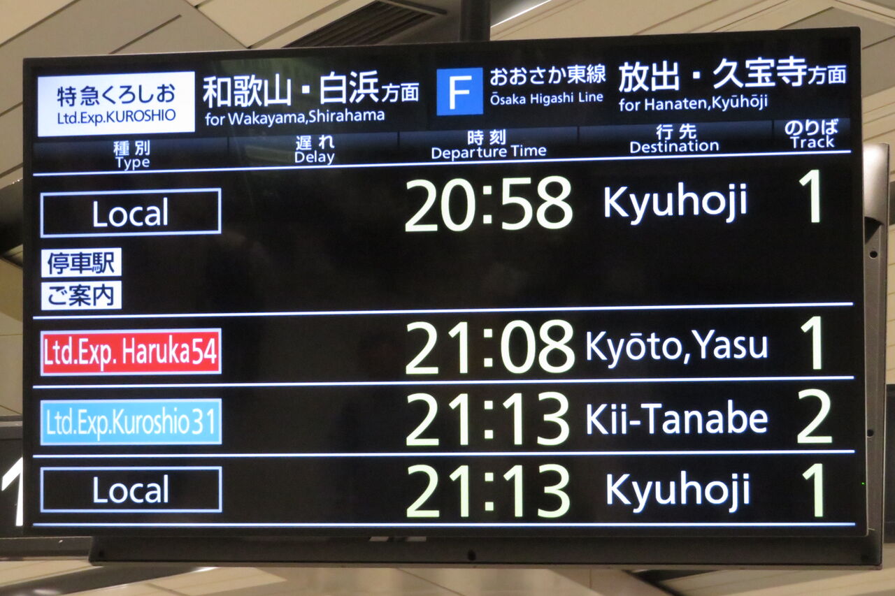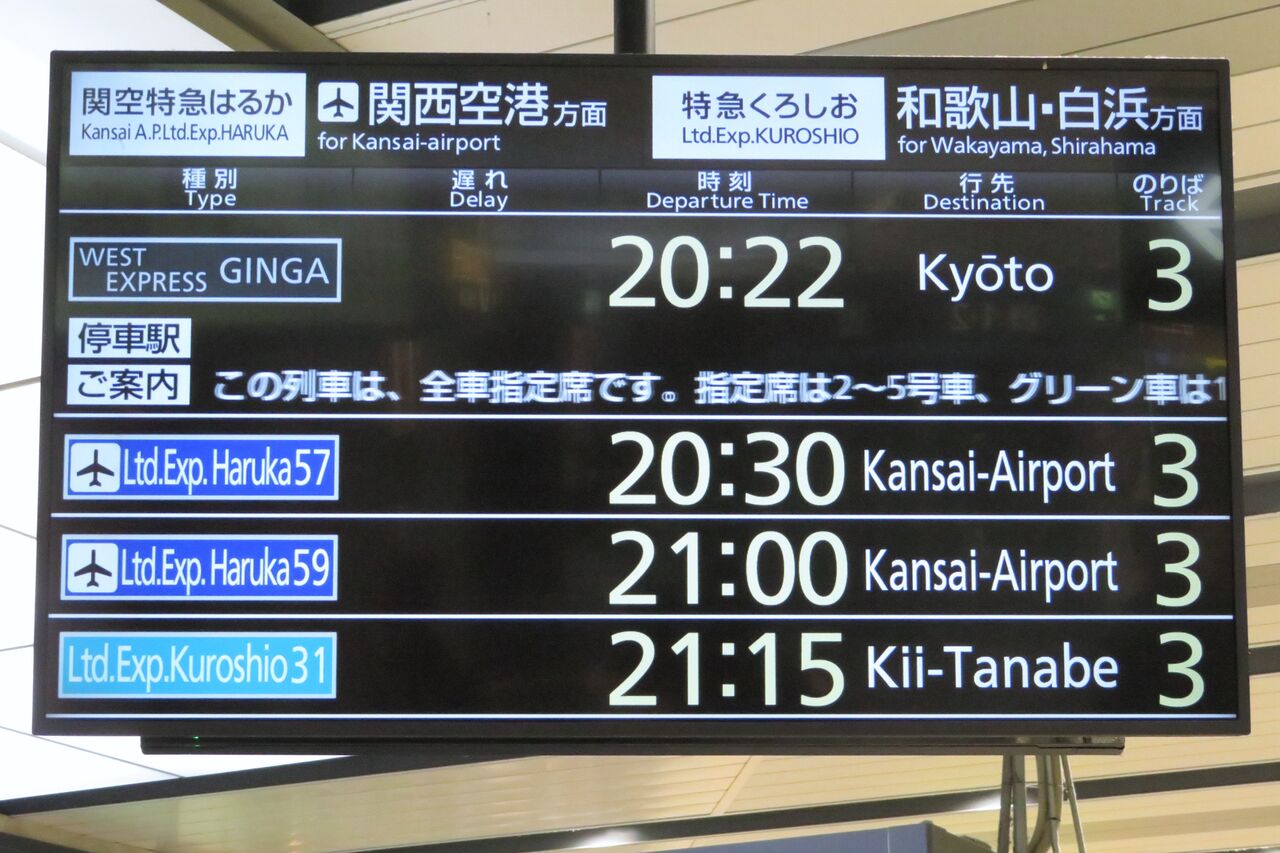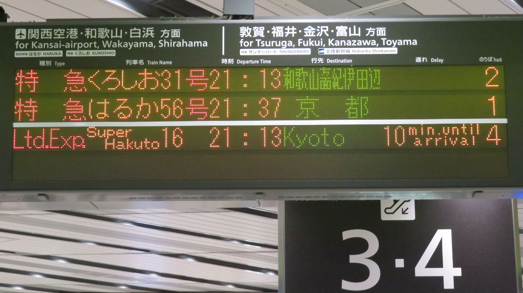 上の2段に1~3番のりばから発車する特急列車(はるか・くろしお・まほろば・らくラクやまとなど)、下の2段に4番のりばから発車する特急列車(サンダーバード・スーパーはくと・らくラクびわこ・ひだなど)が表示されます。