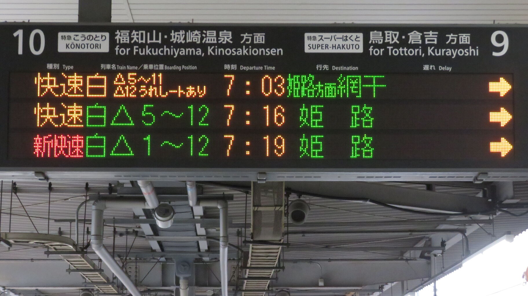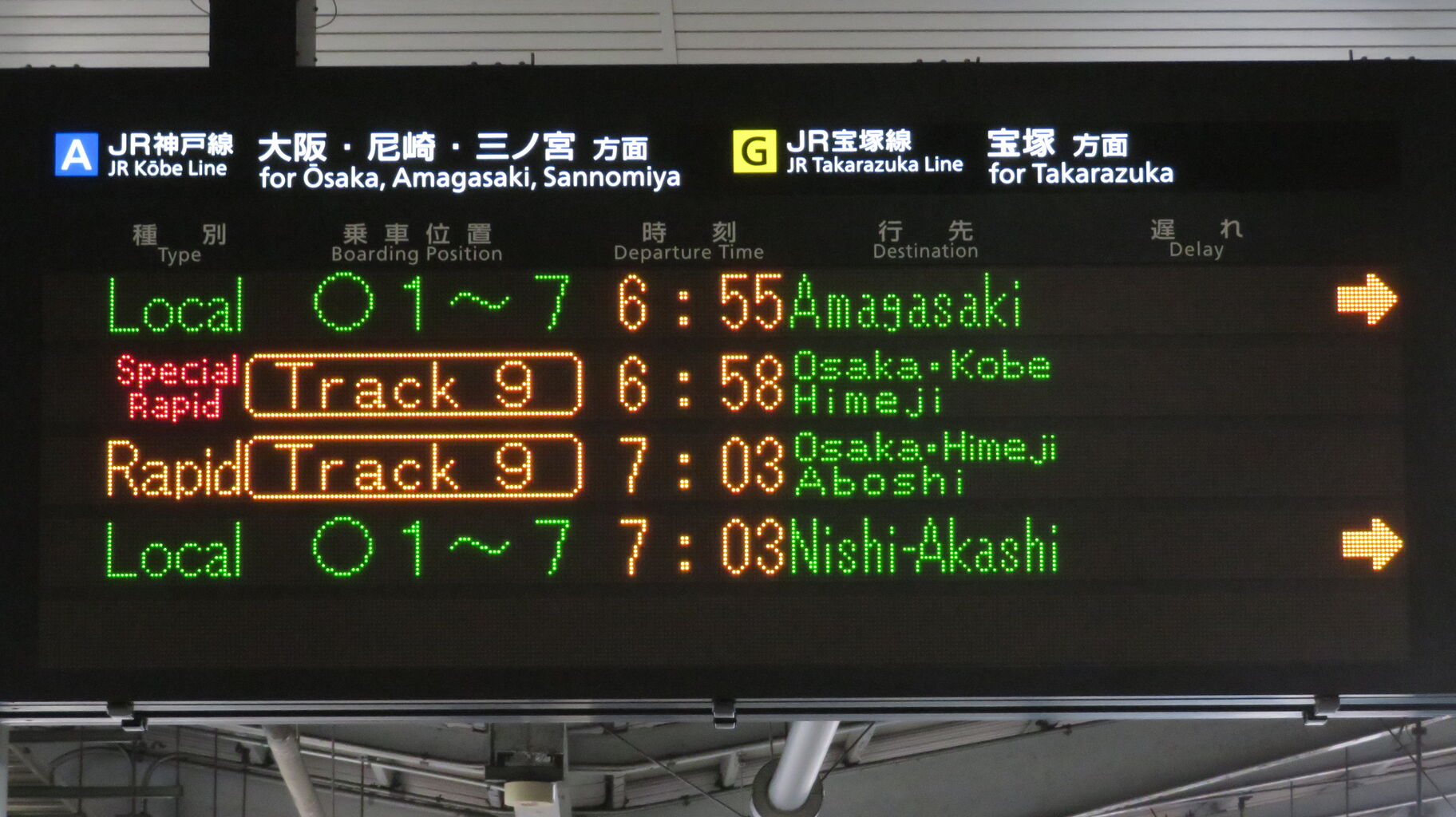 隣のホーム 9番のりばから発車する新快速や快速の案内も表示されます。