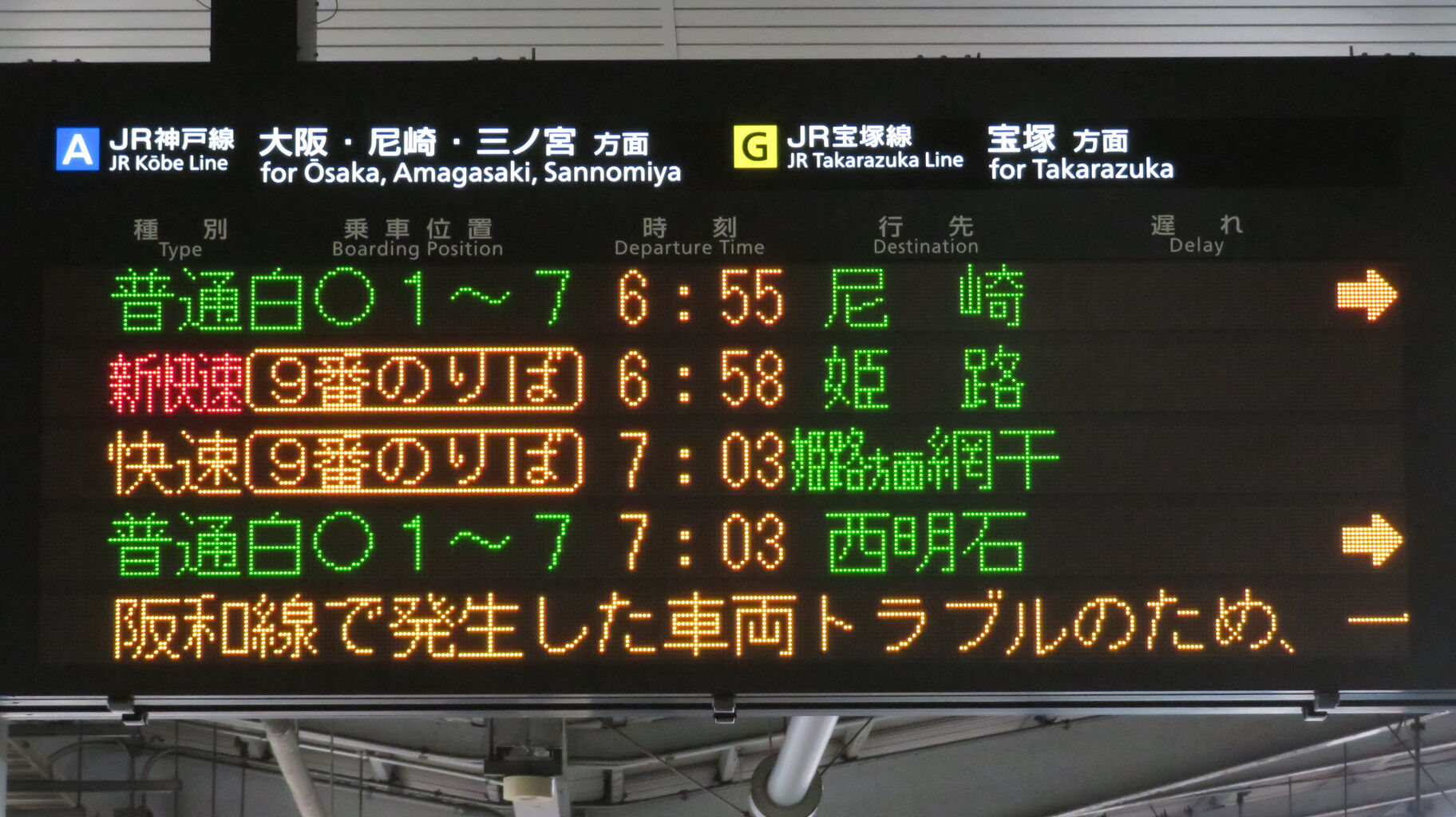 上から2段目には、朝の時間帯のみ運転される 「尼崎行き」 が表示されています。