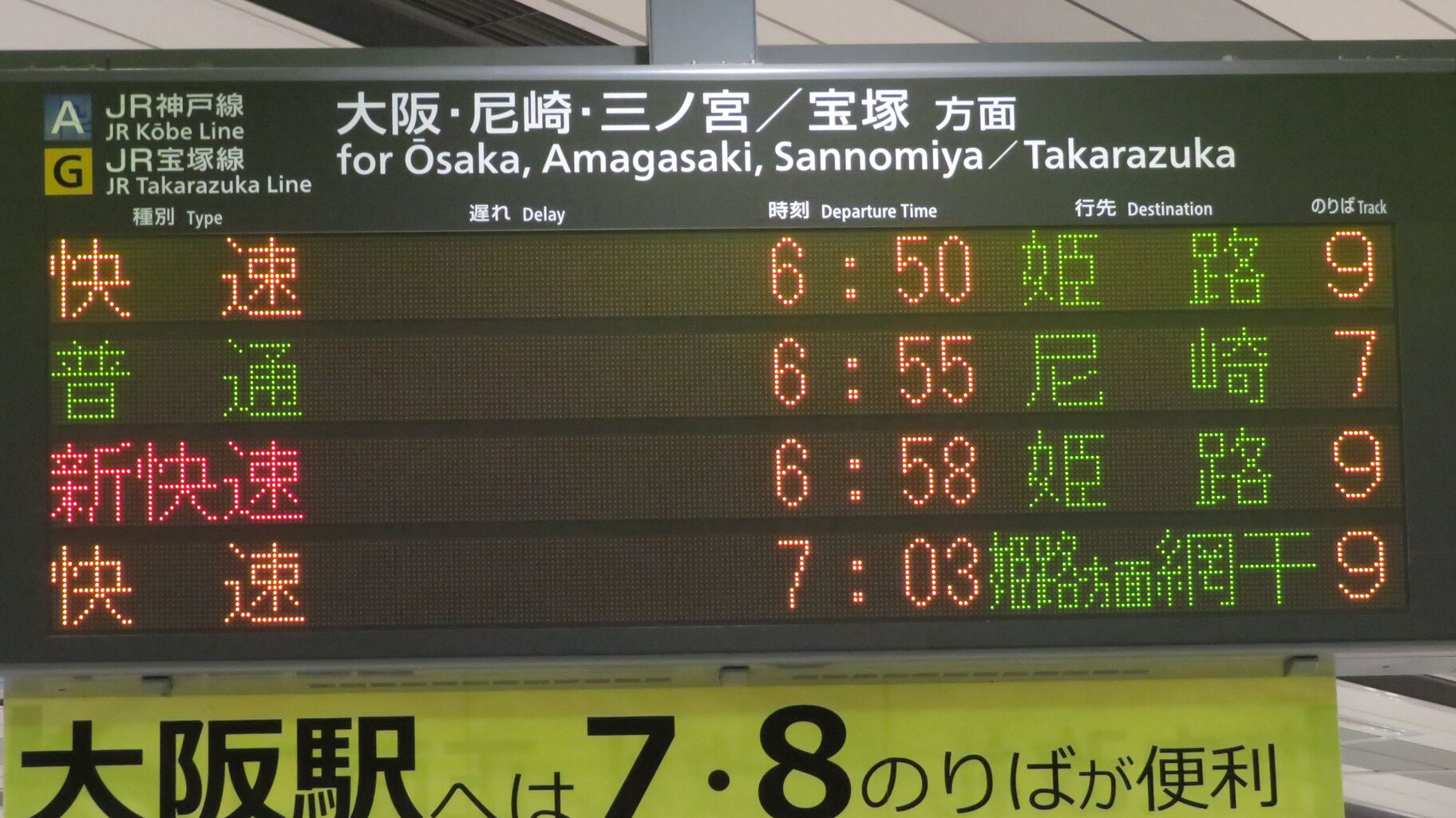 新大阪駅では、基本的に 大阪・三ノ宮方面へ向かう新快速と快速が8番のりば、普通電車が7番のりばから発車します。