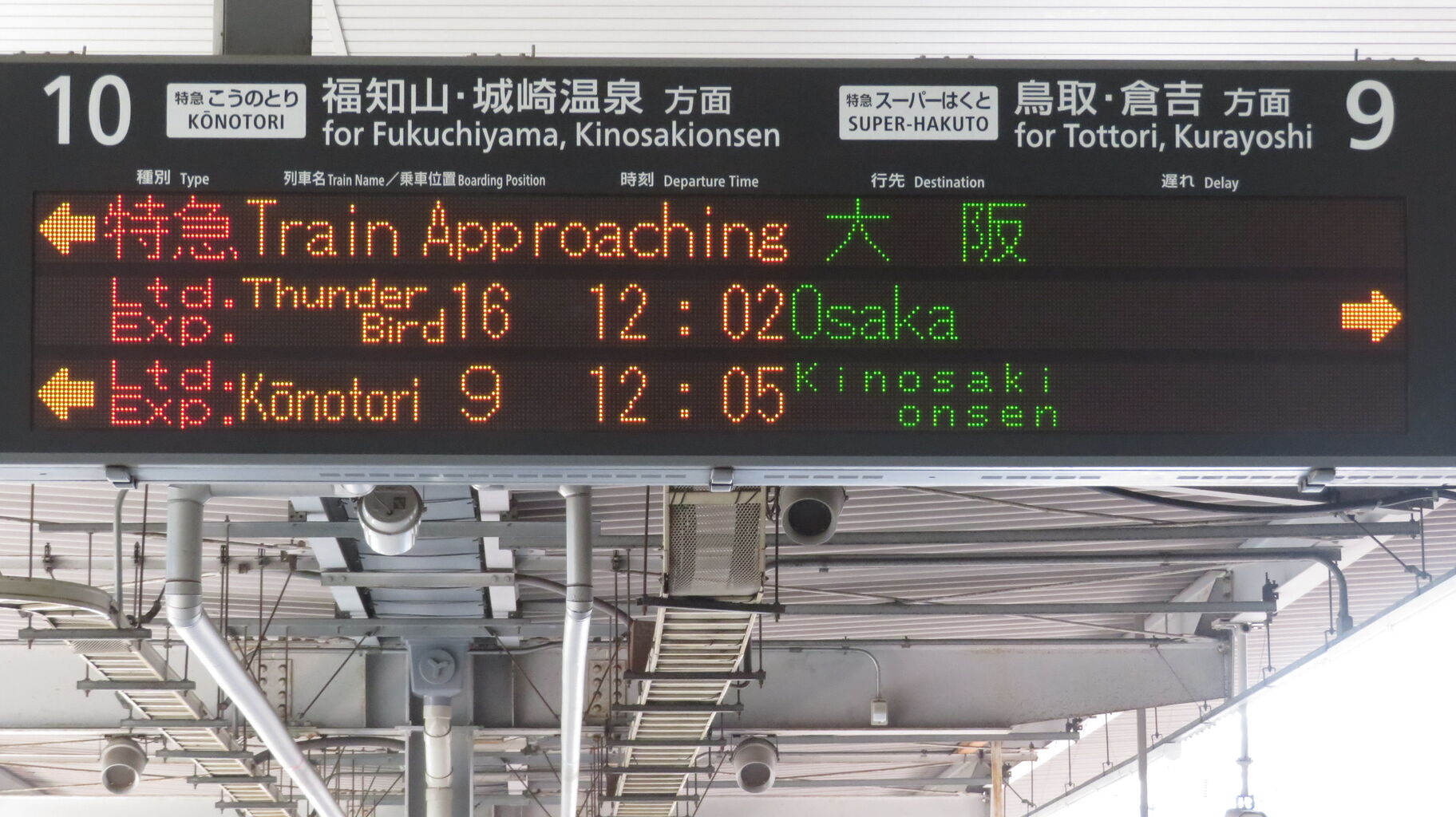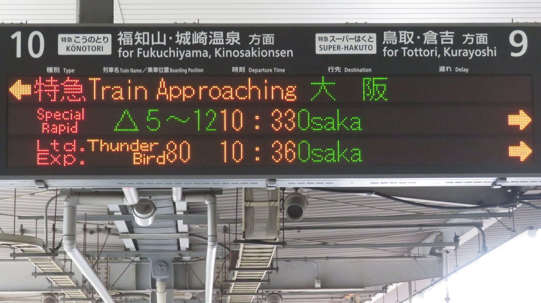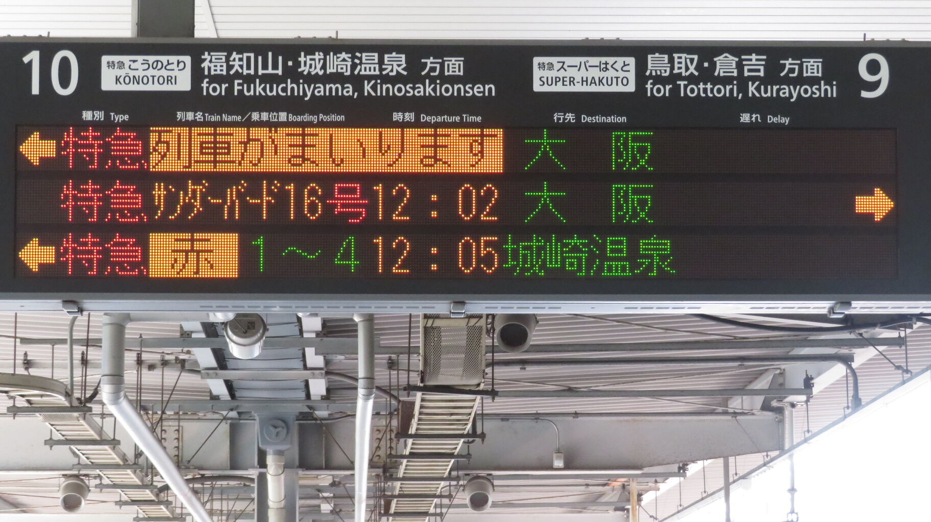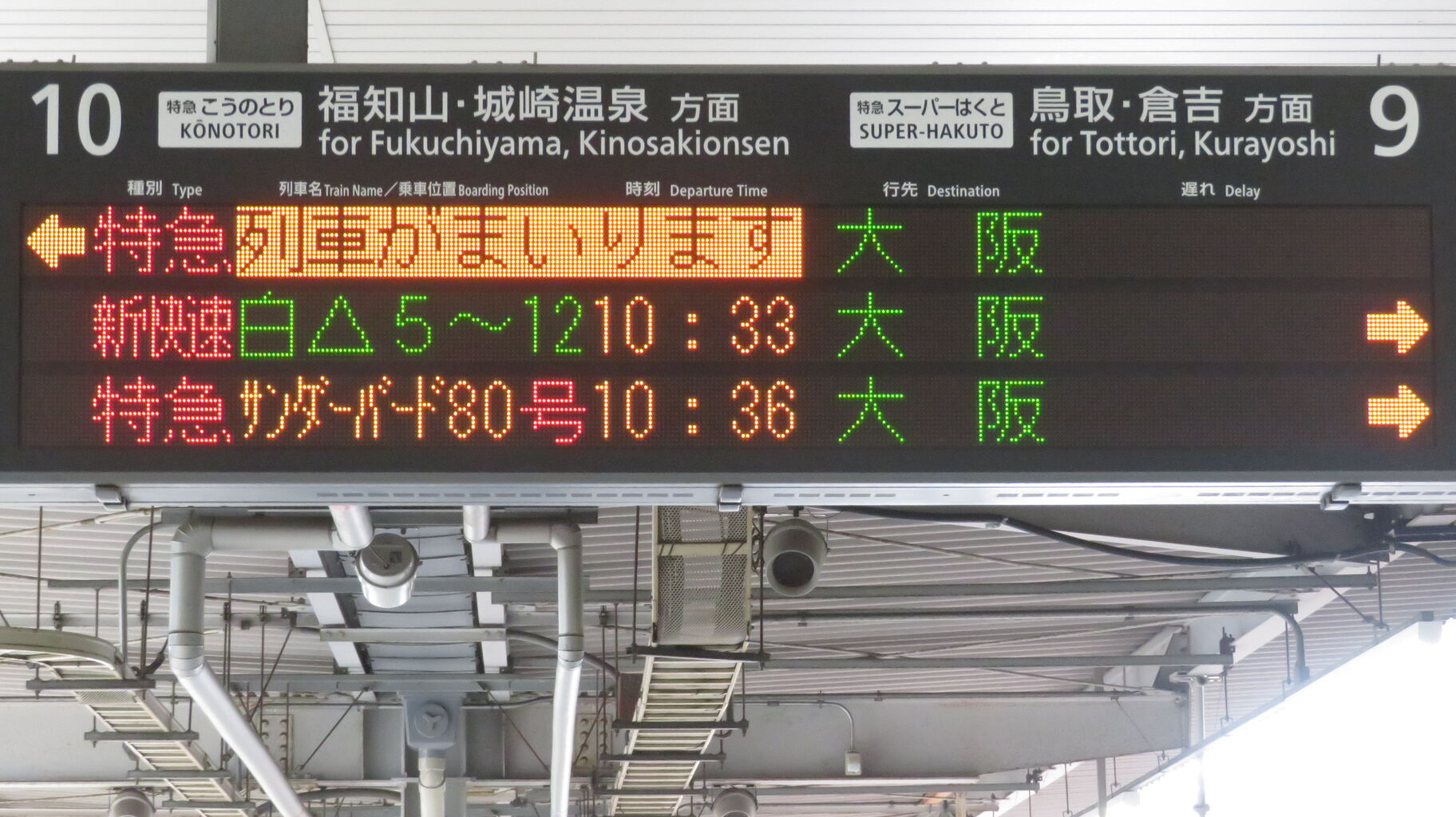 一番上の段に特急こうのとり 「天橋立行き」、その下に10番のりば発着の特急サンダーバードが表示されています。