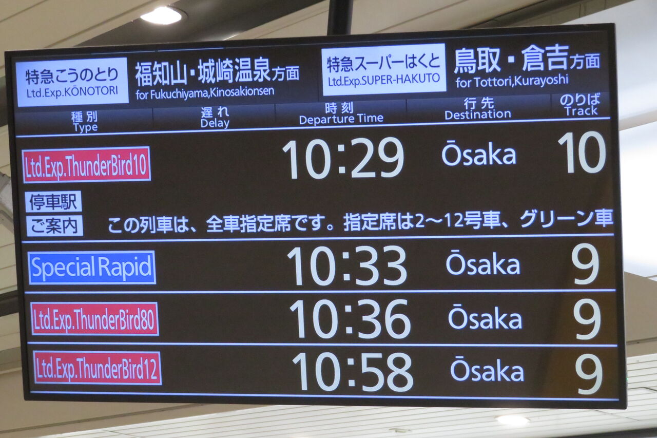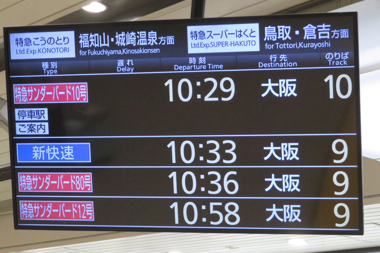 この日は特急こうのとり 「天橋立行き」 を撮るために新大阪駅を訪れていましたが、これを見て10番のりば発着のサンダーバードがあると知り、急きょ撮ることにしました。