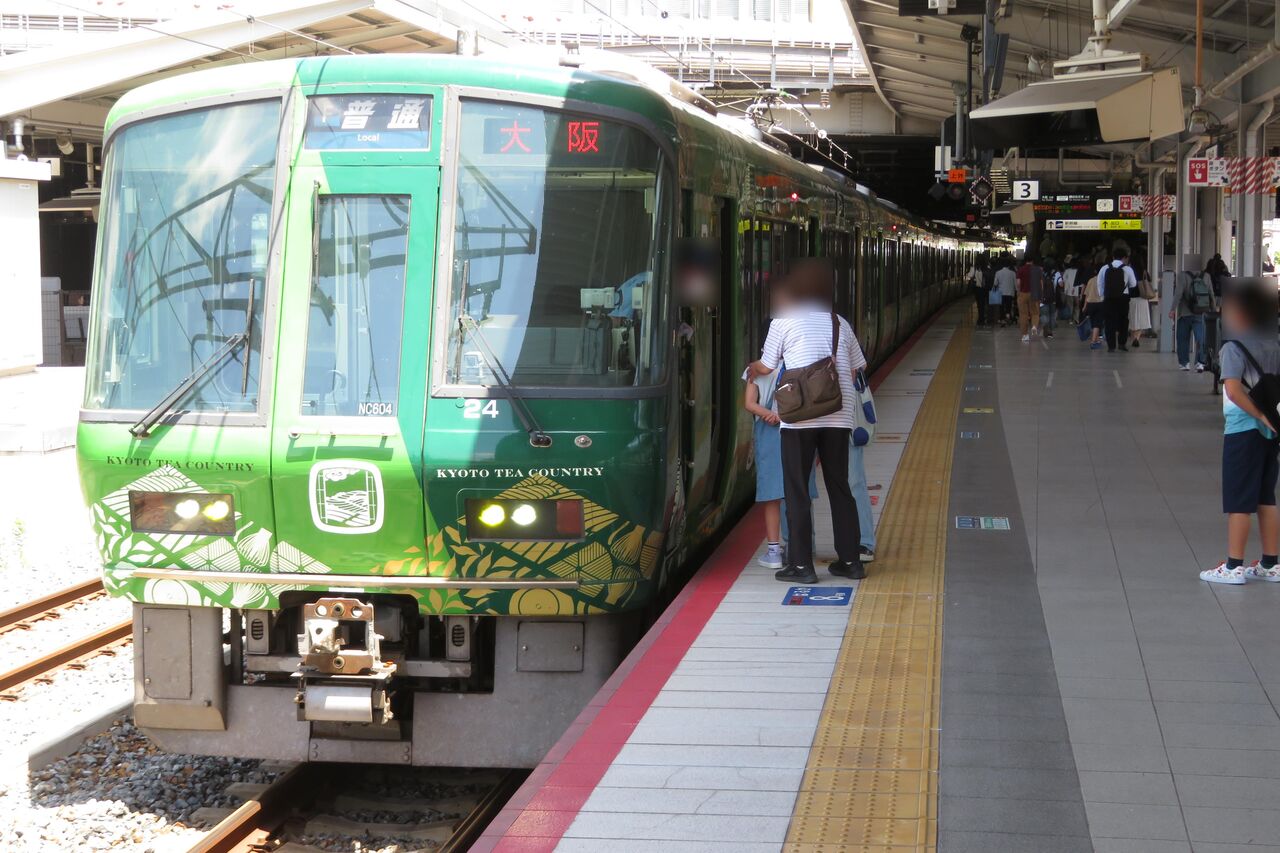 こちらは、3番のりばに停車中の普通 大阪行き(お茶の京都トレイン)を前から撮った写真。