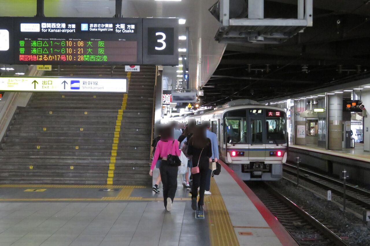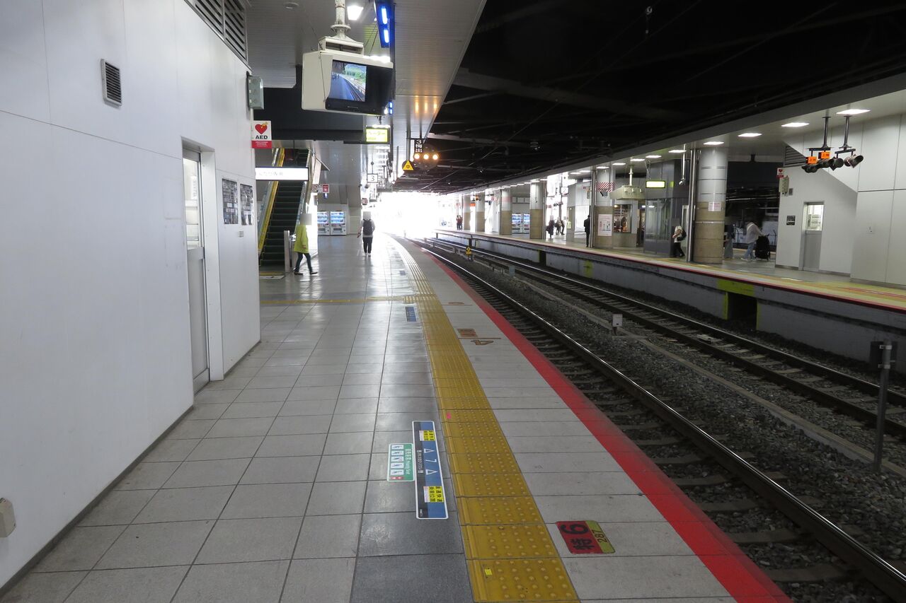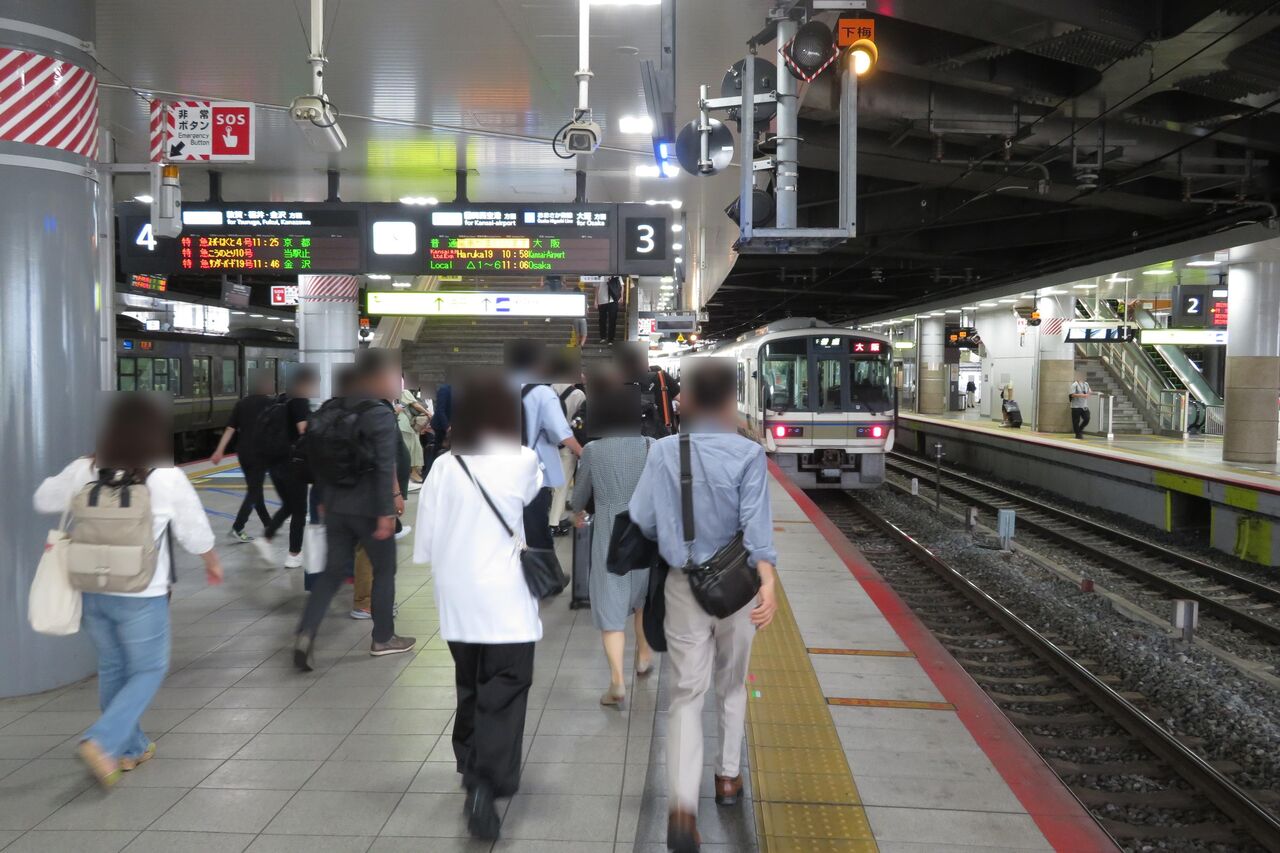 先頭車両は、大阪側の階段から離れたところに停車しているのが分かります。