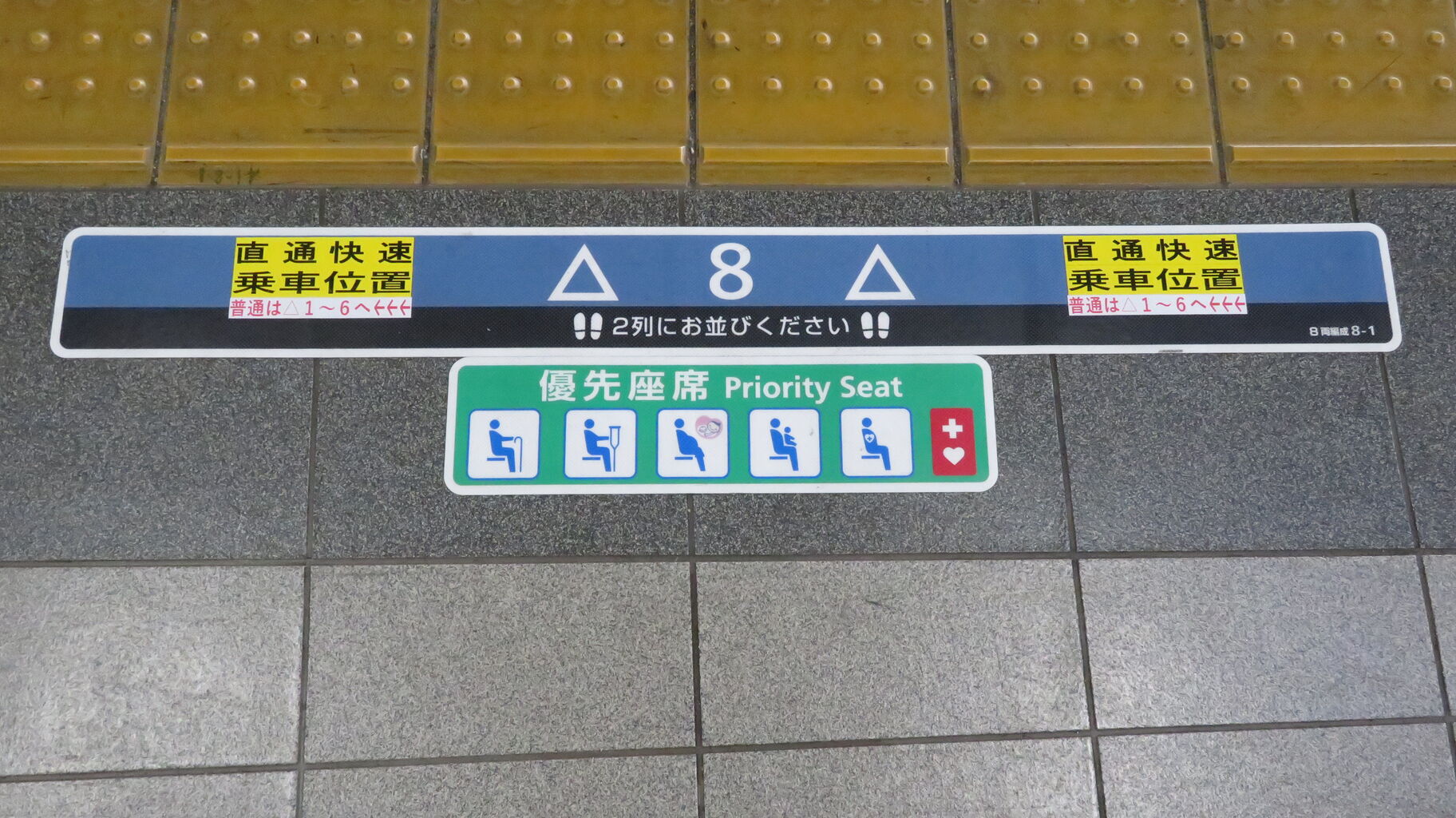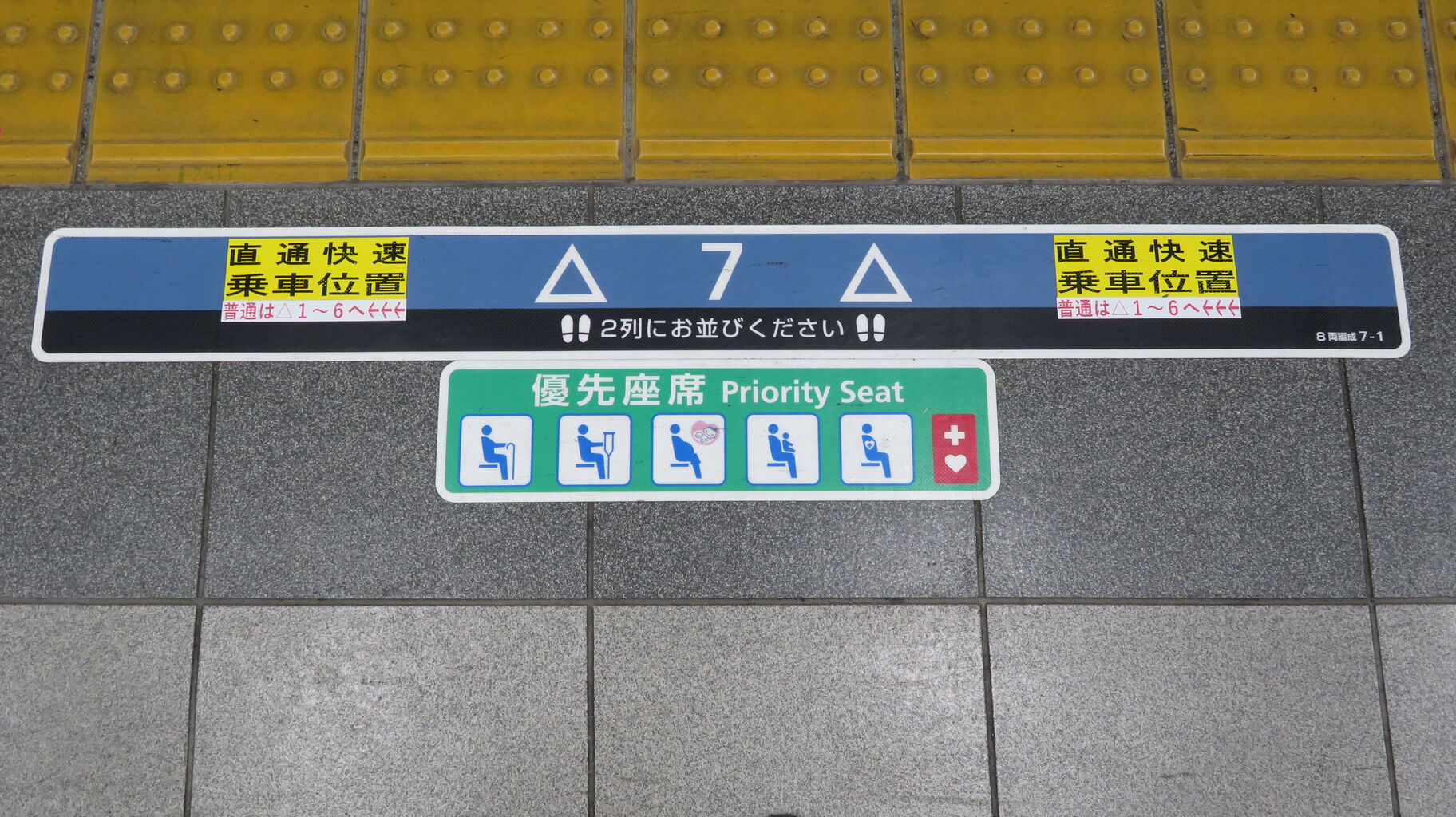 7番と8番の乗車位置には、「直通快速 乗車位置 普通は△1~6へ←←←」 と書かれています。