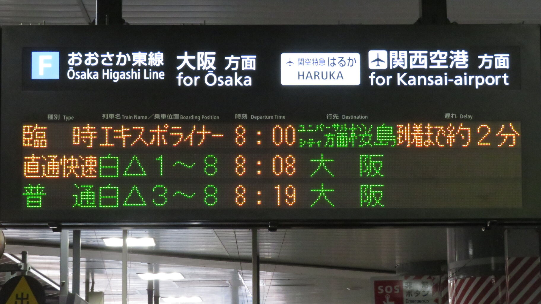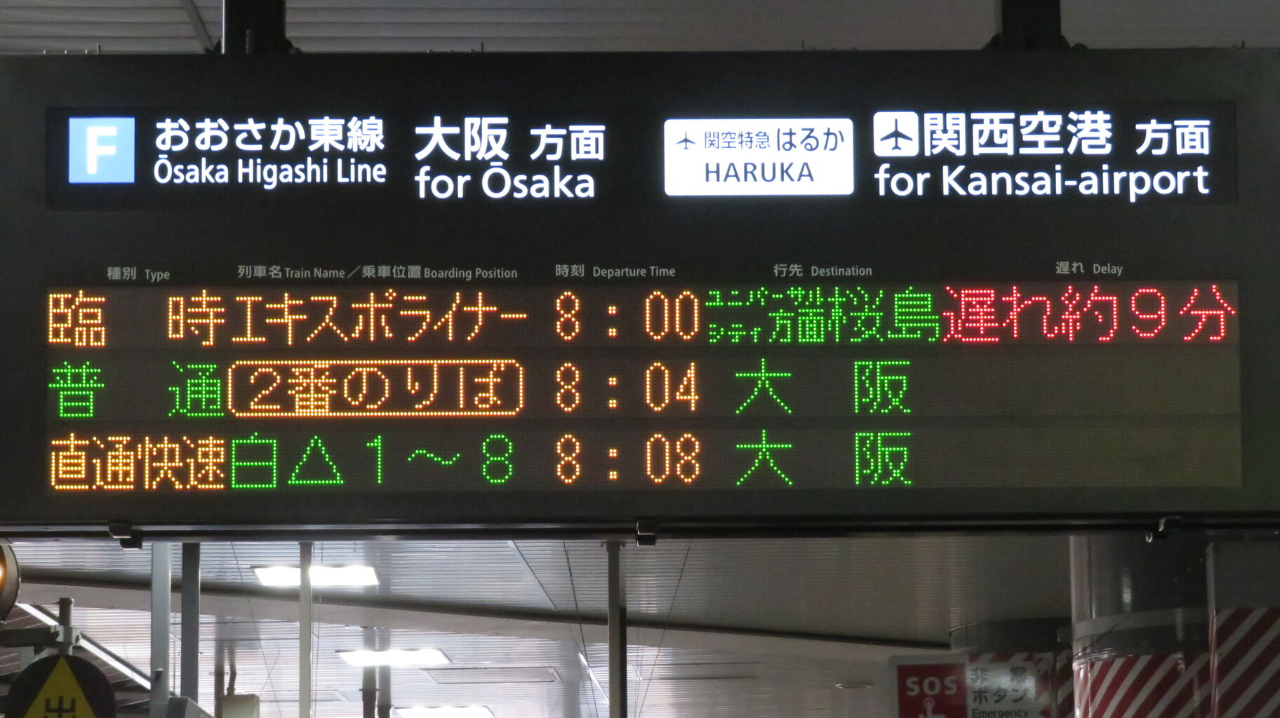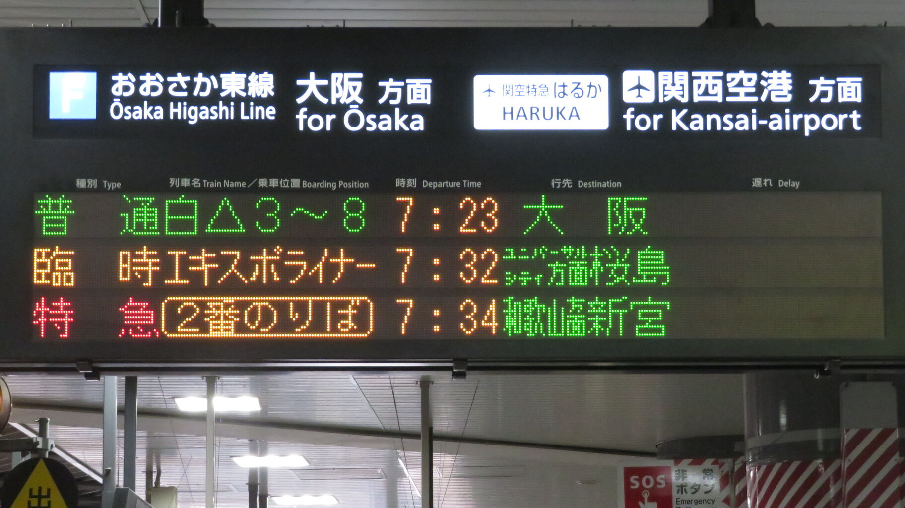 7時32分発のエキスポライナーは、2番のりばの発車標に表示されていません。
