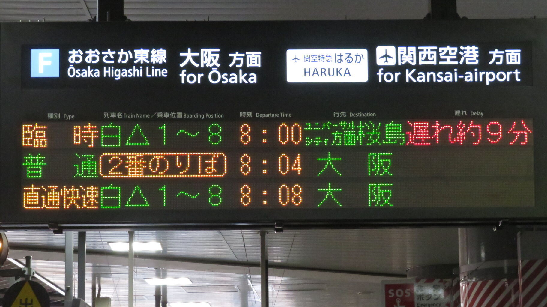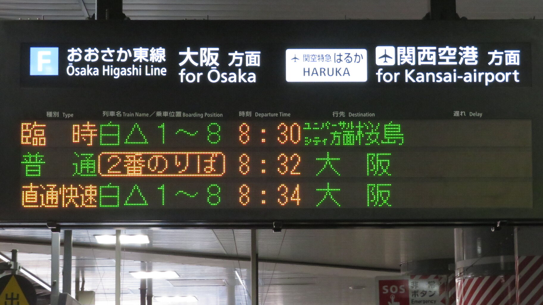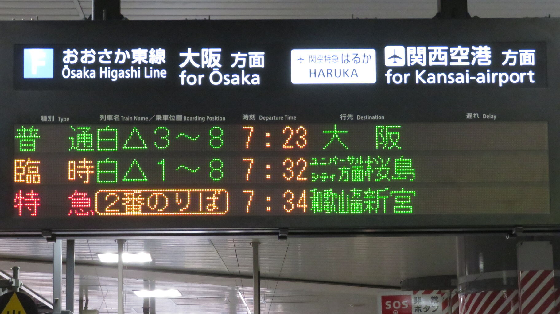 7時32分発のエキスポライナーは、2番のりばの発車標に表示されていません。