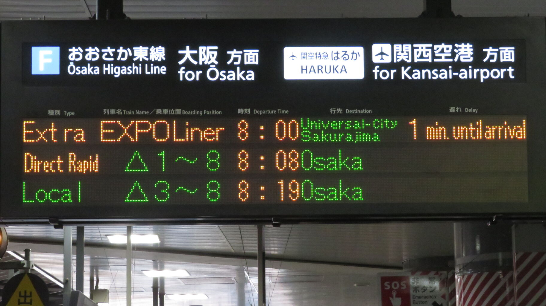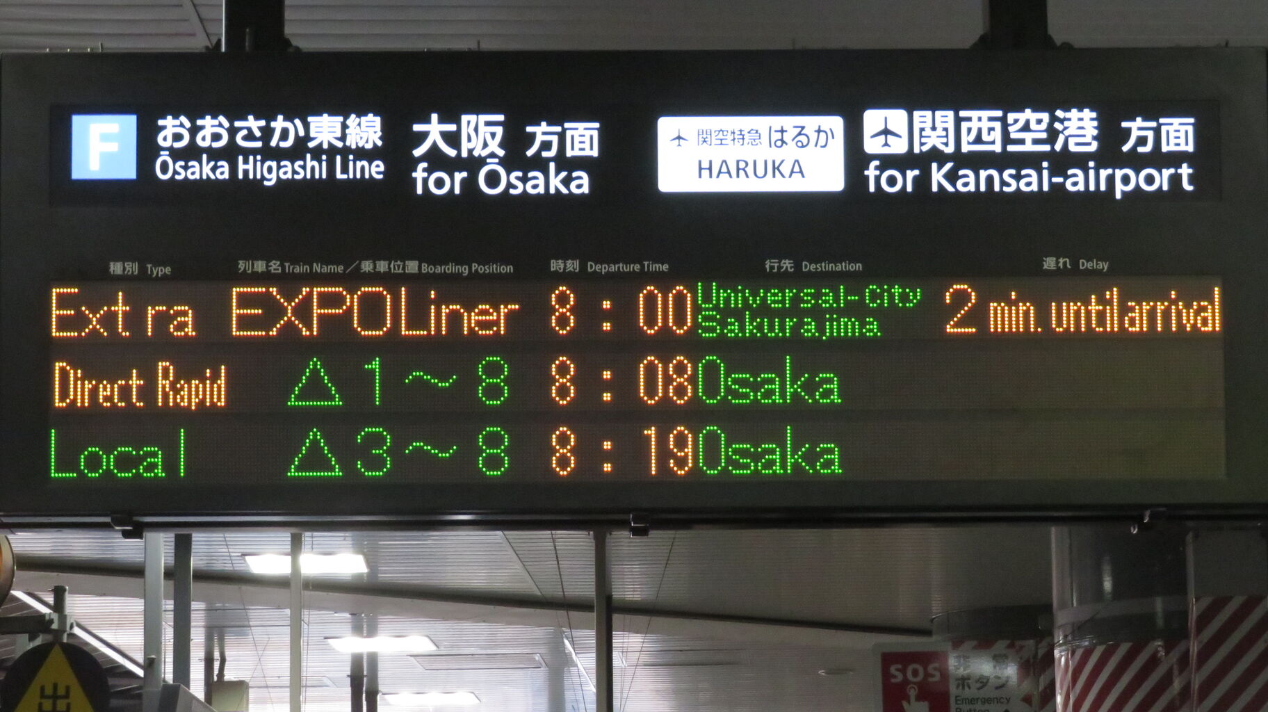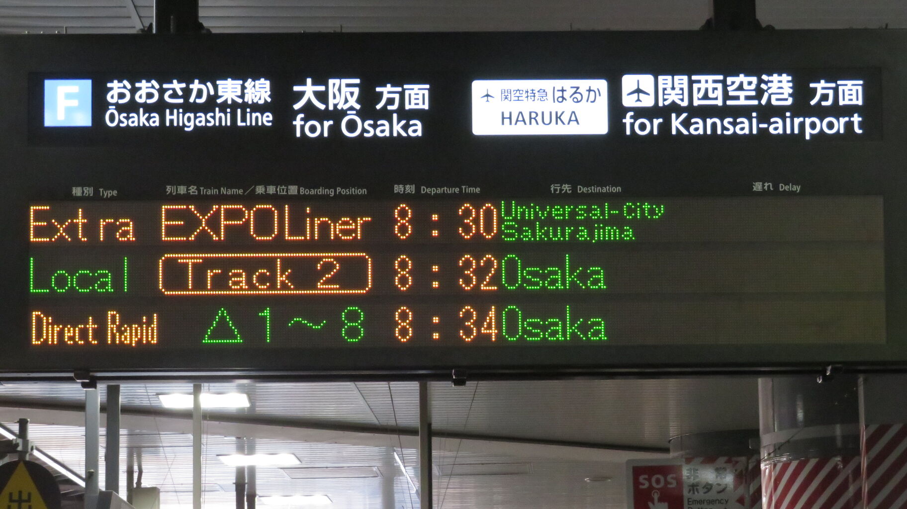 今回は、2025年3月に新大阪駅で撮影した、3番のりばから発車するエキスポライナーの発車標の表示をご紹介。