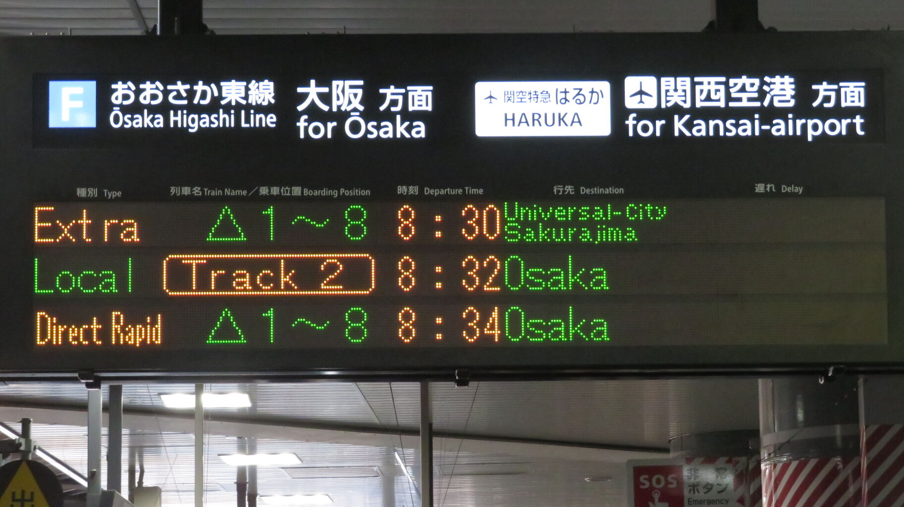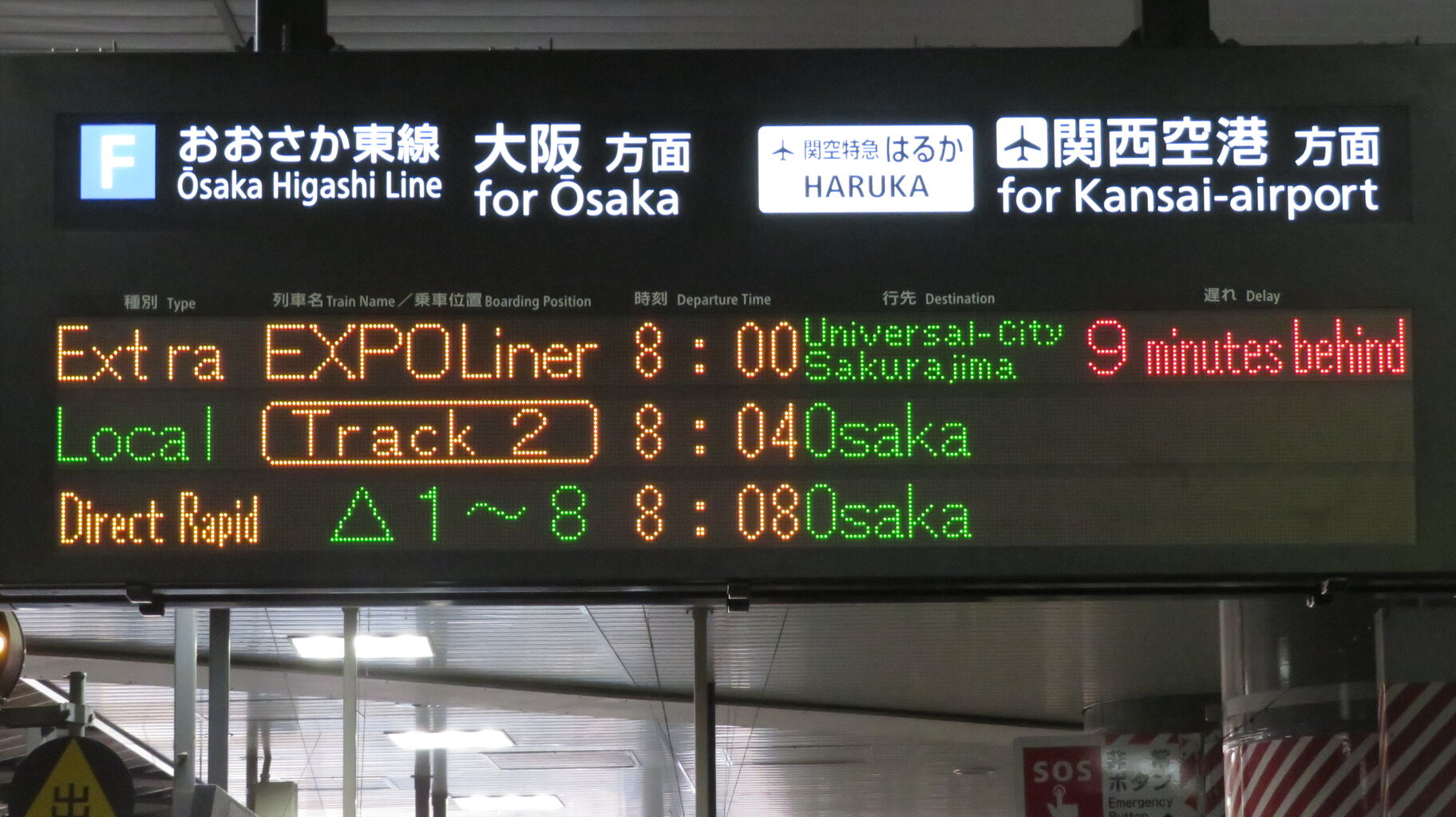 以上、新大阪駅で撮影した 3番のりばから発車するエキスポライナーの表示を紹介しました。