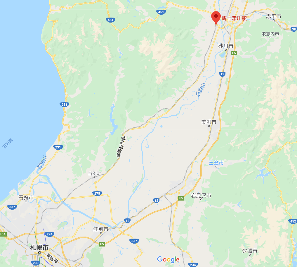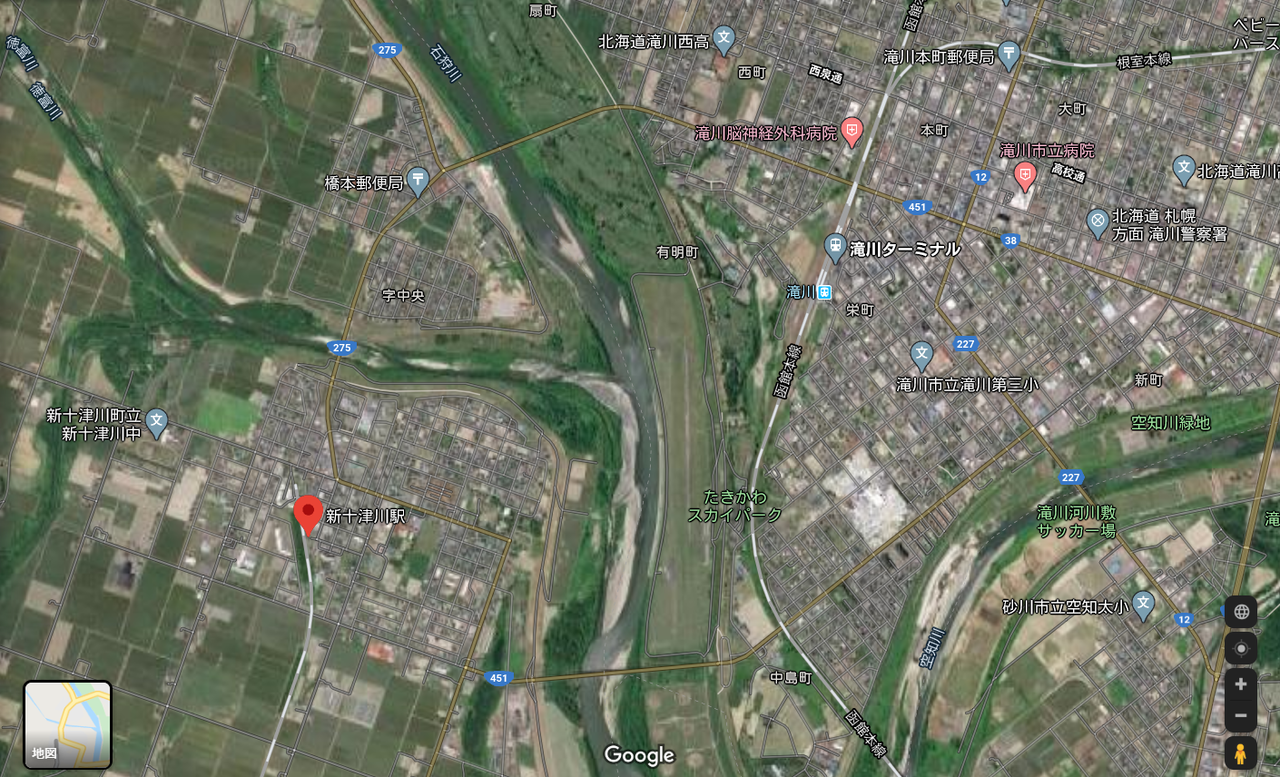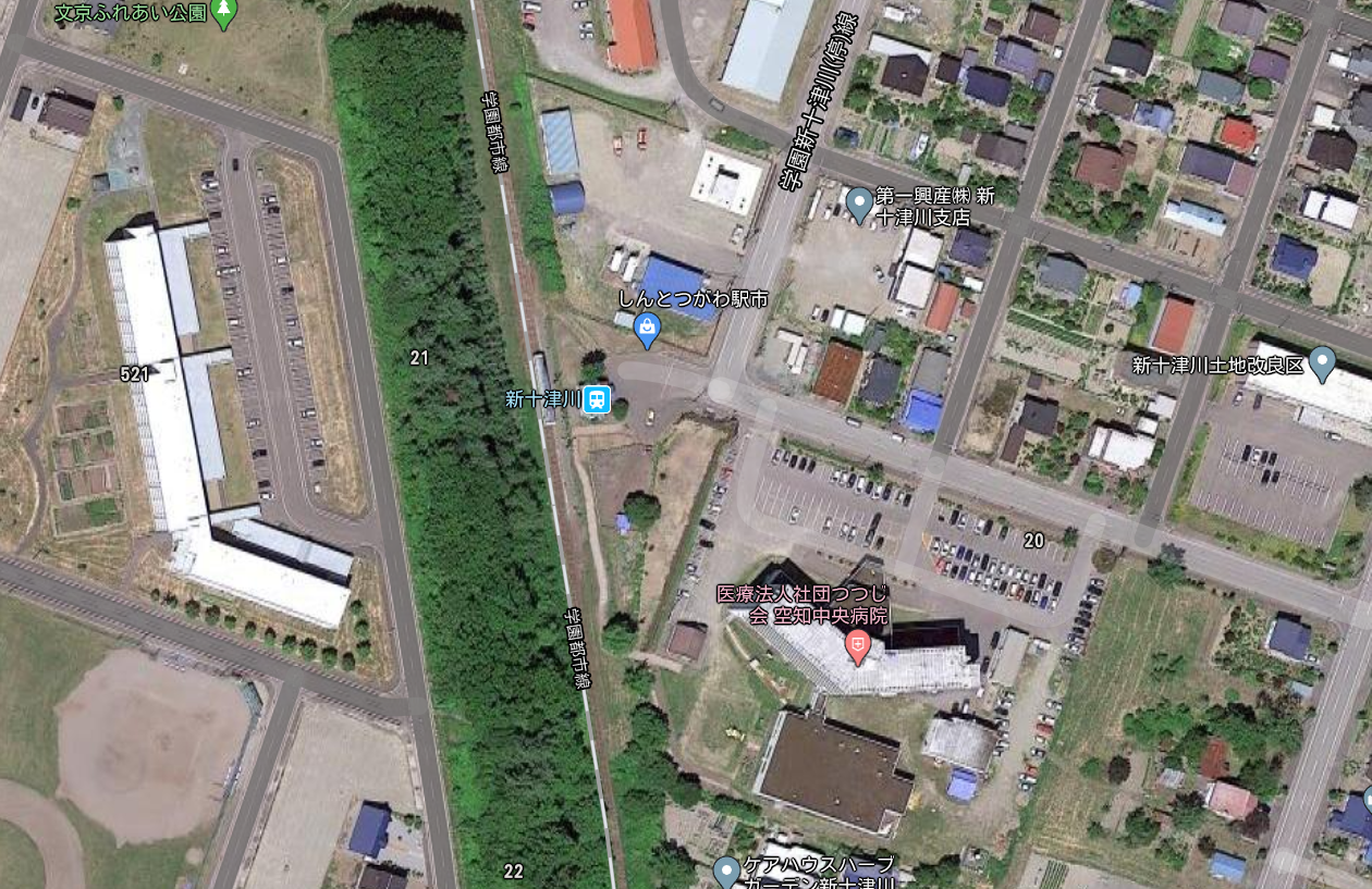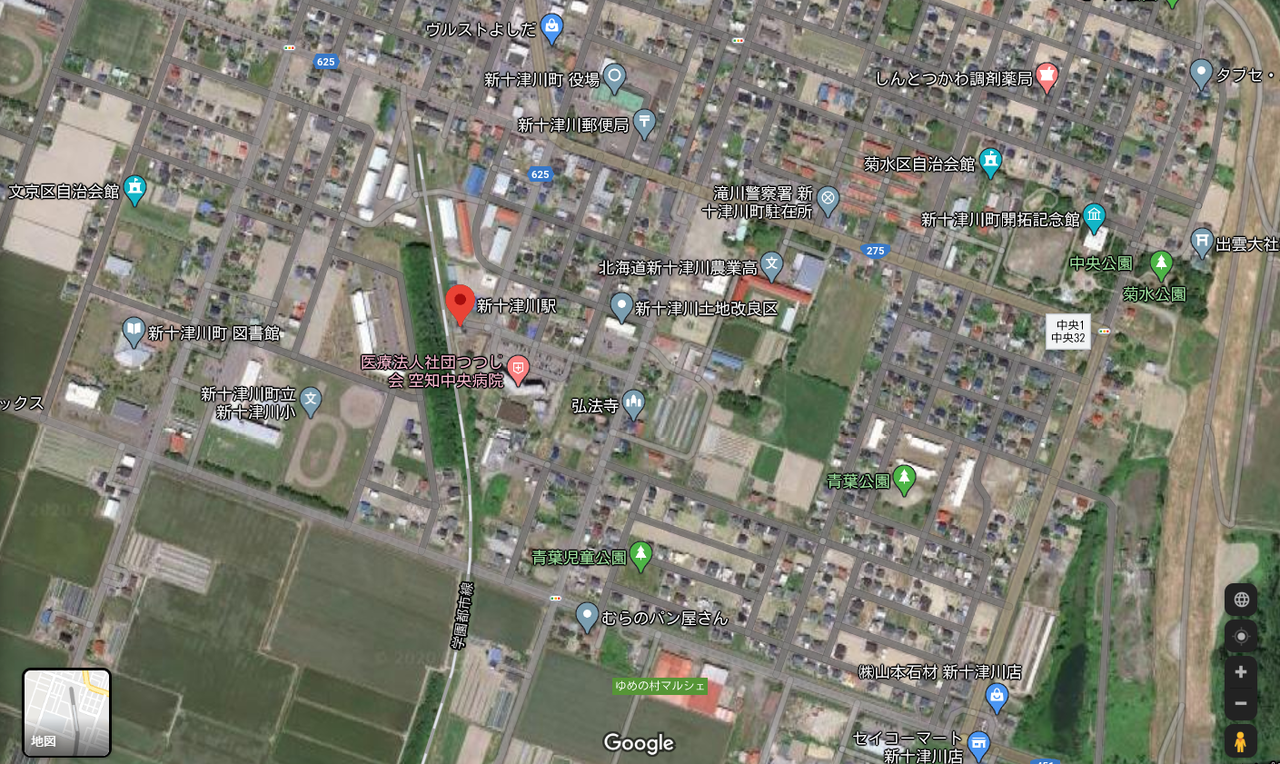 自分は昨年8月に新十津川駅を訪れましたが、今月になってグーグルマップを見て 駅裏の団地の存在や 駅周辺の建物の多さに驚いたので、今回記事にしてみました。