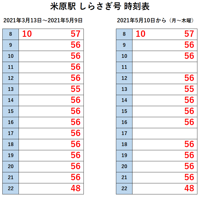 5月10日から当面の間、以下の列車が 月~木曜に運休となります。(祝日を除く)