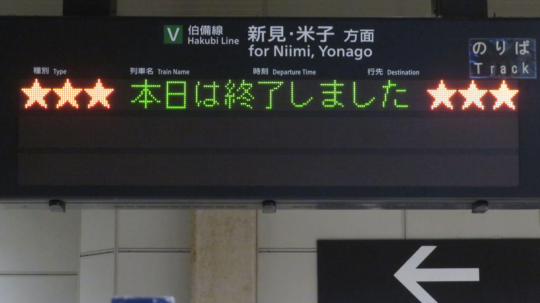 JR西日本の一部の駅では、最終列車の発車後、発車標に 「☆本日の運転は終了しました☆」 と ☆マーク付きで表示されます。