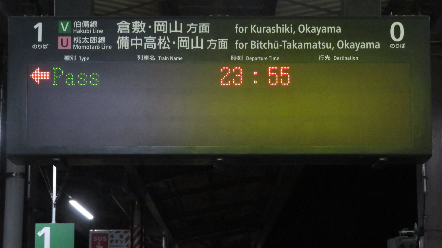 桃太郎線の最終列車は 22時56分発の普通 岡山行きです。