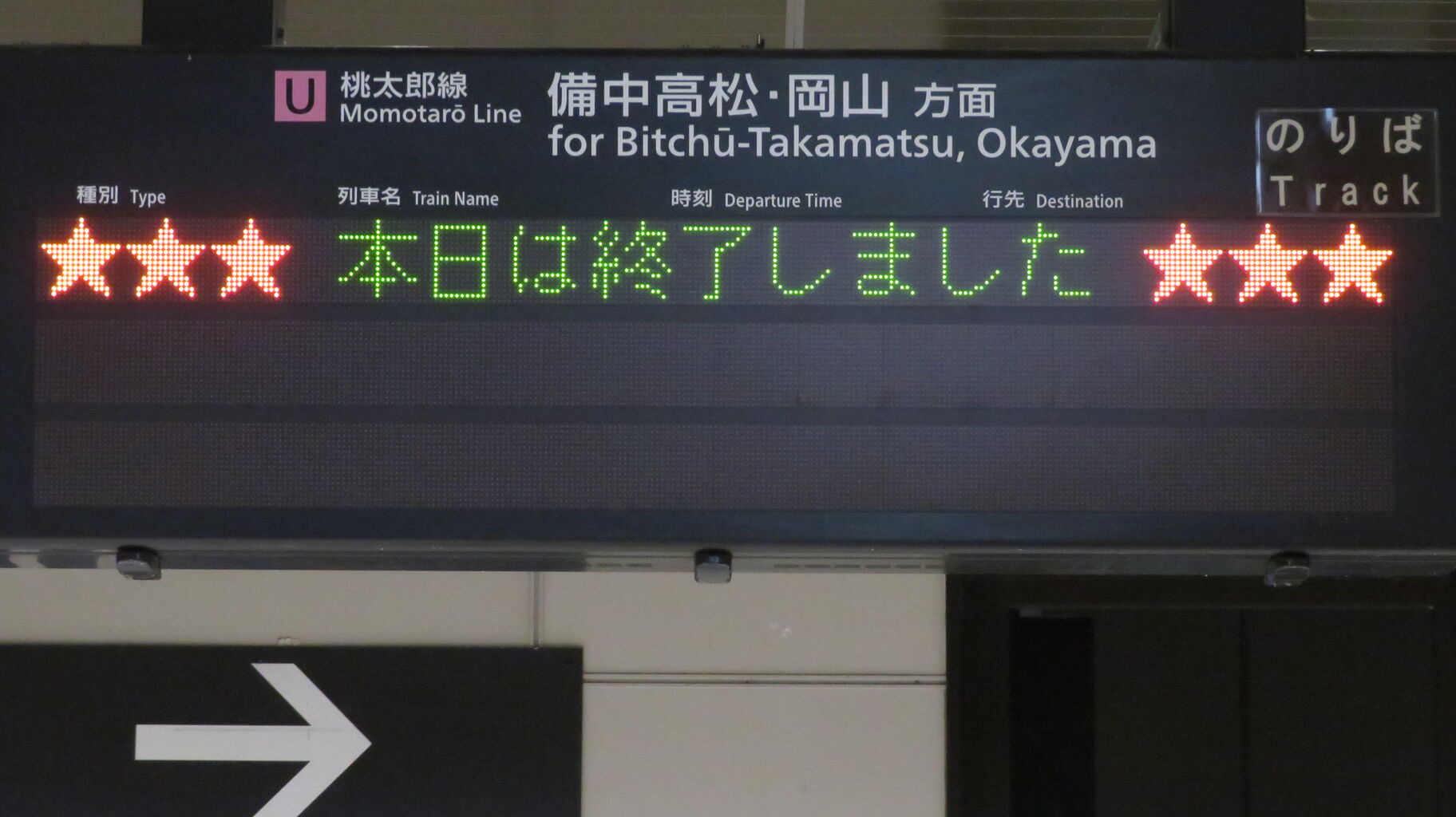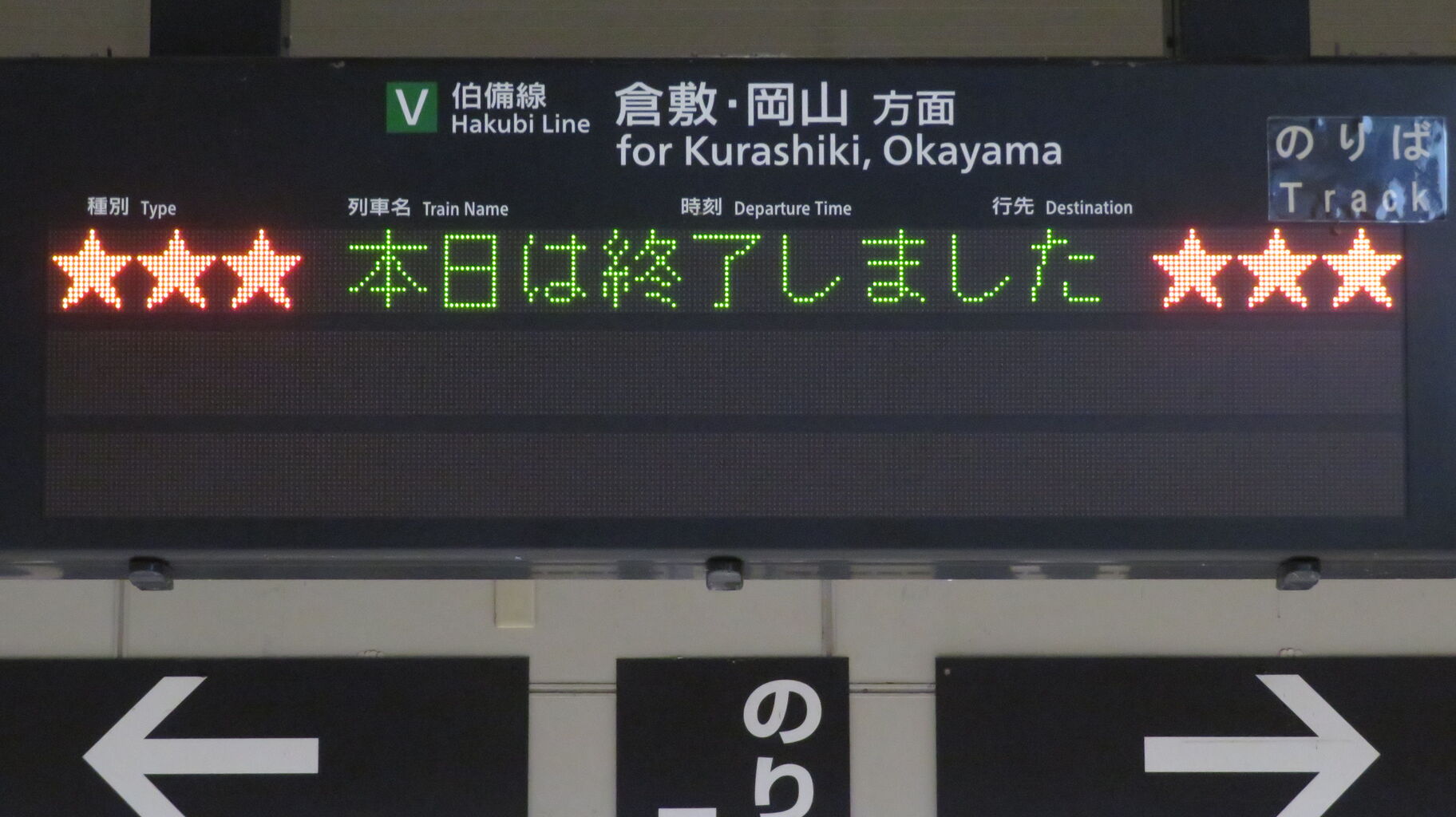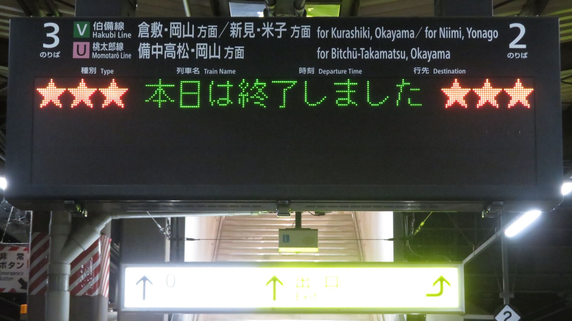 以上、総社駅で撮影した 「★★★本日は終了しました★★★」 表示を紹介しました。