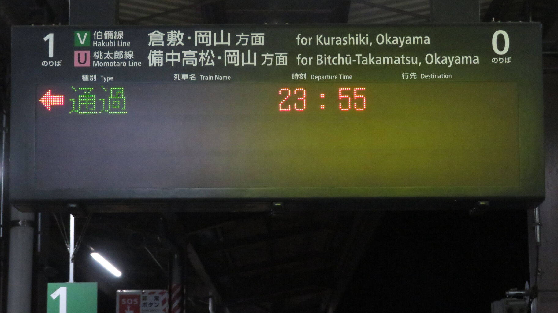 23時55分に貨物列車が通過するため、最終列車の発車後も 発車標に 「通過」 表示が出ていました。