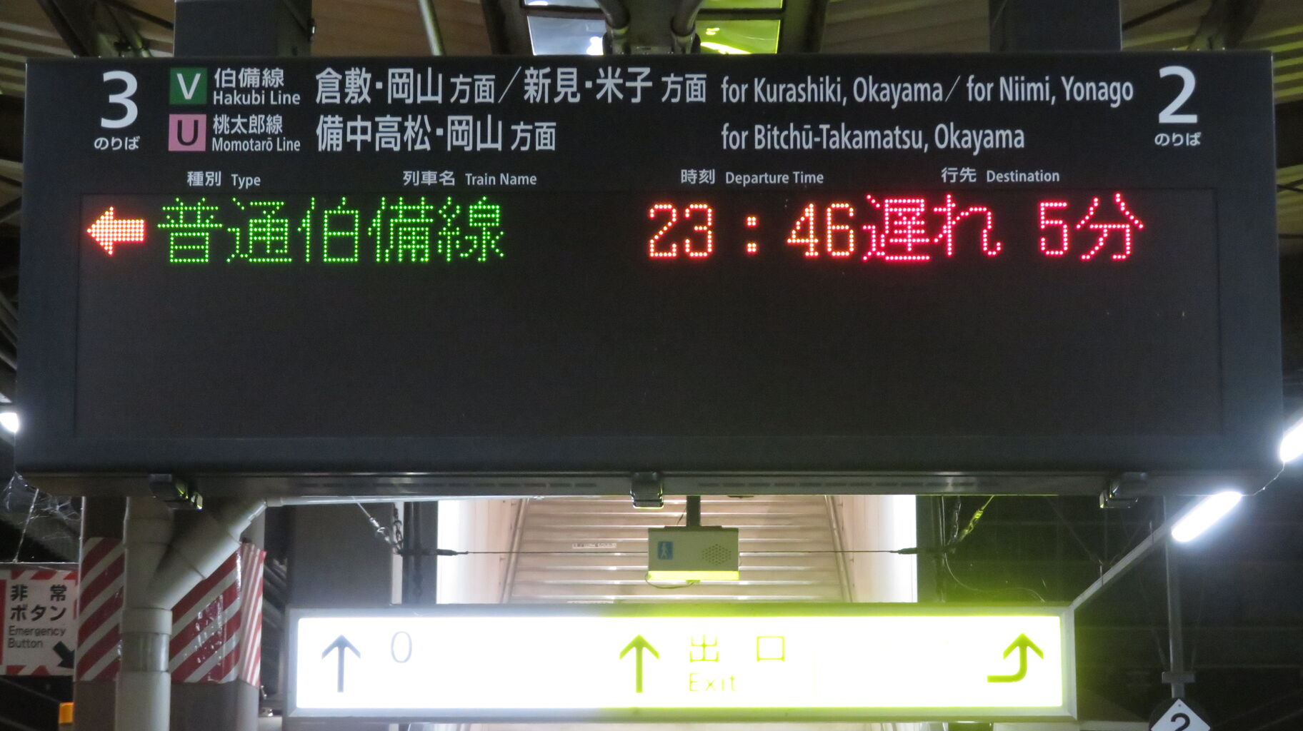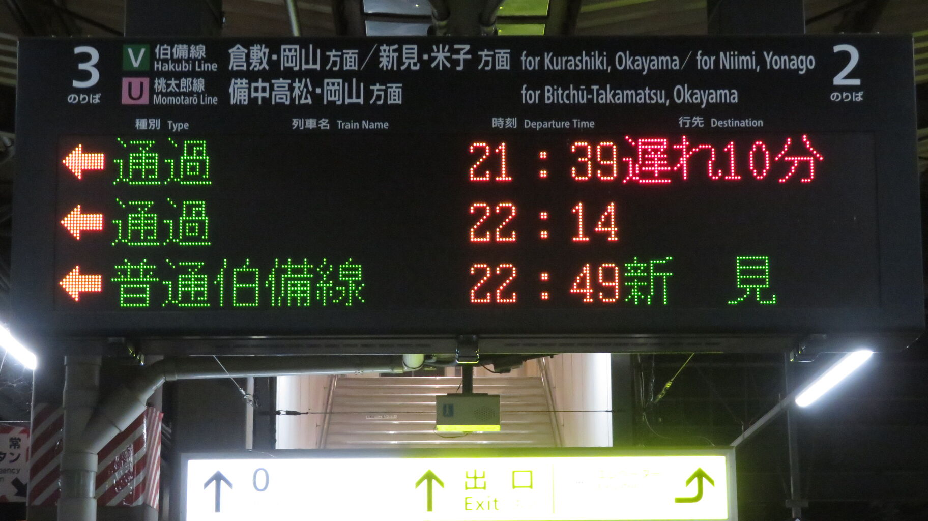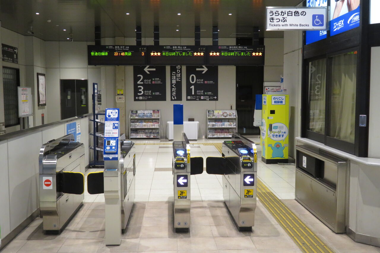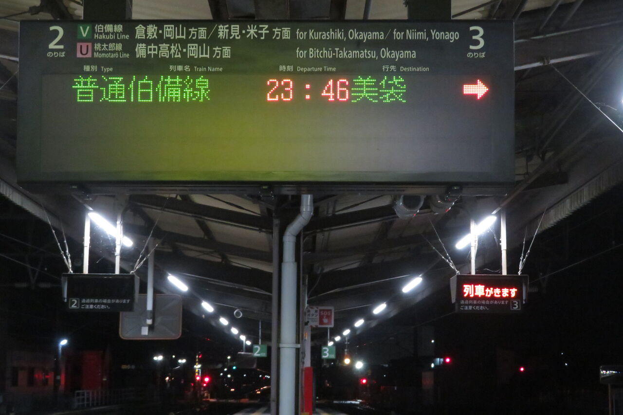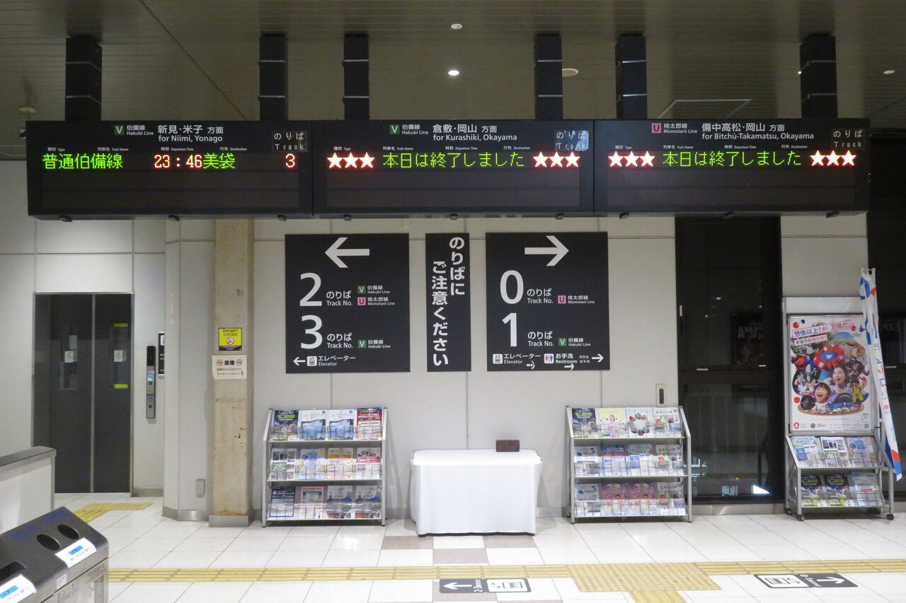 伯備線上りと桃太郎線は、最終列車が既に発車しており、「★★★本日は終了しました★★★」 表示が出ていました。