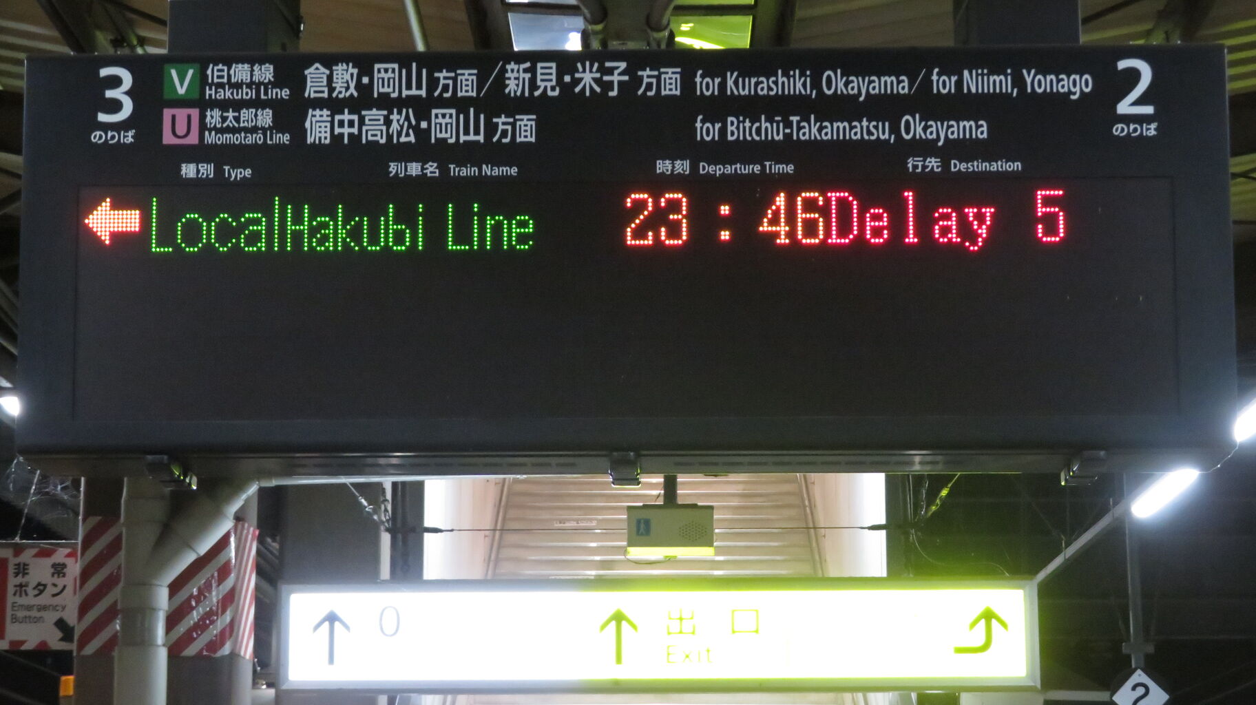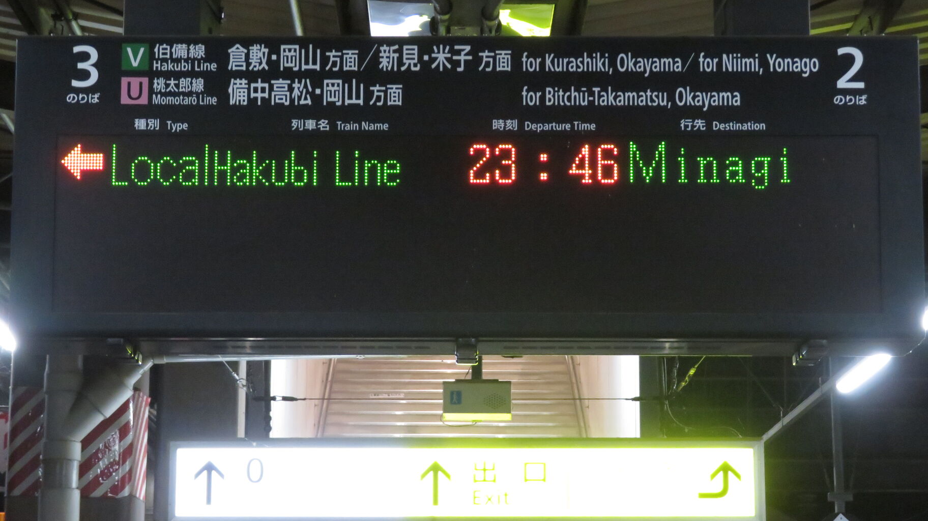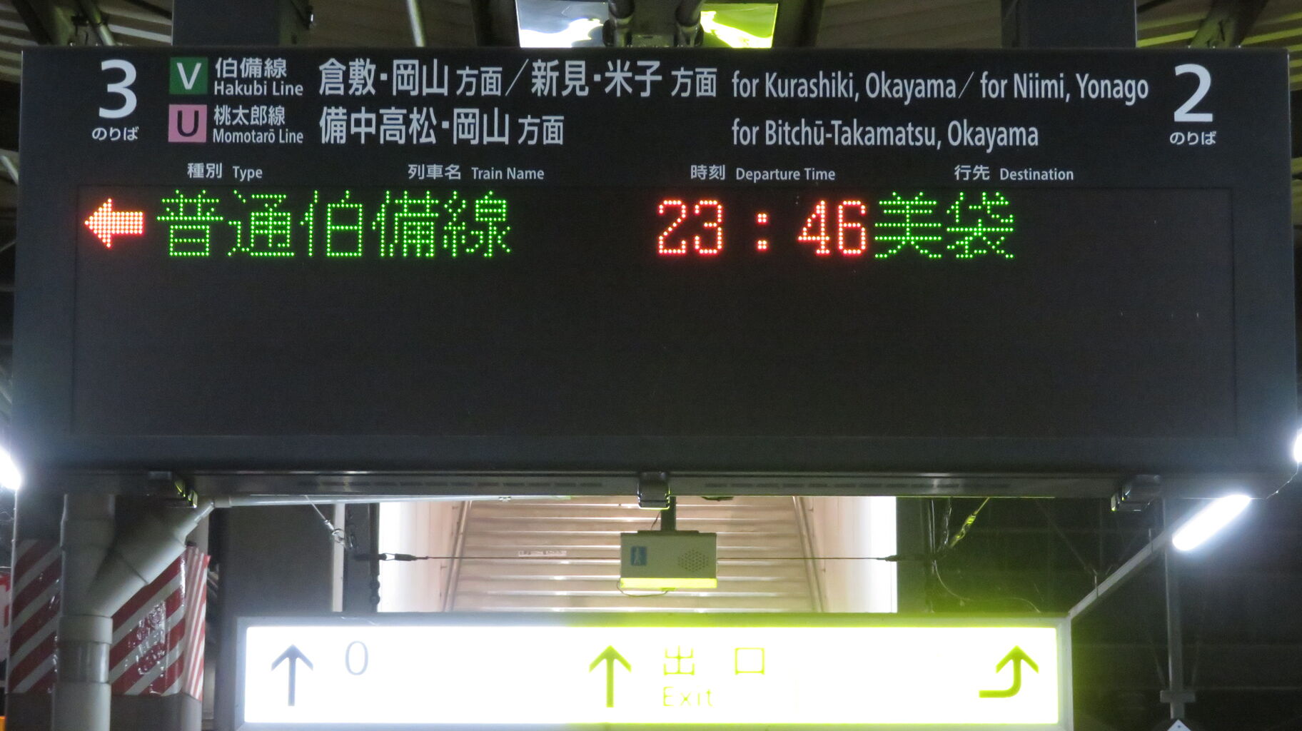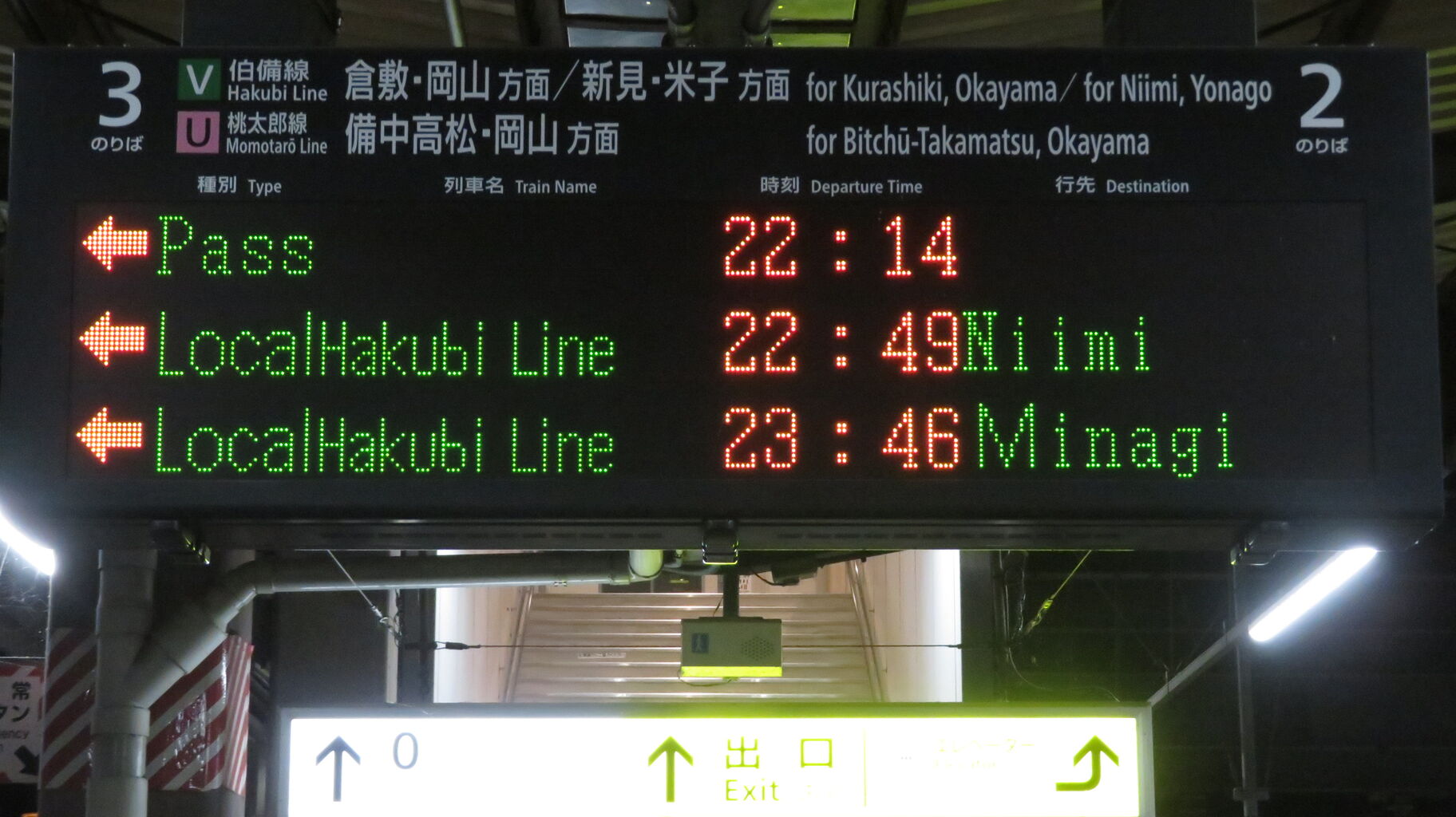 伯備線上りと桃太郎線は、最終列車が既に発車しており、「★★★本日は終了しました★★★」 表示が出ていました。
