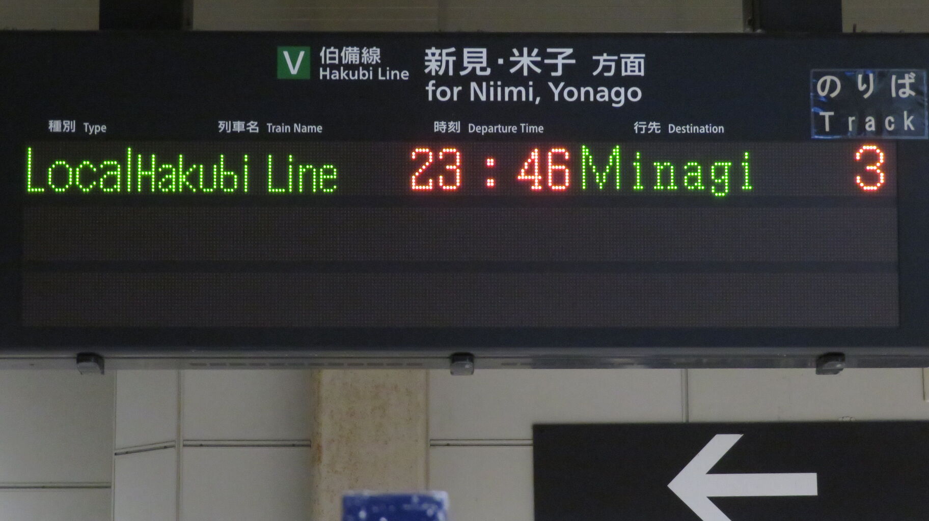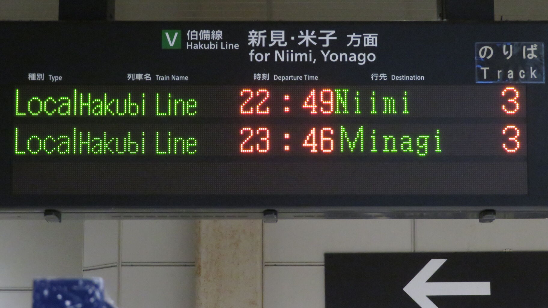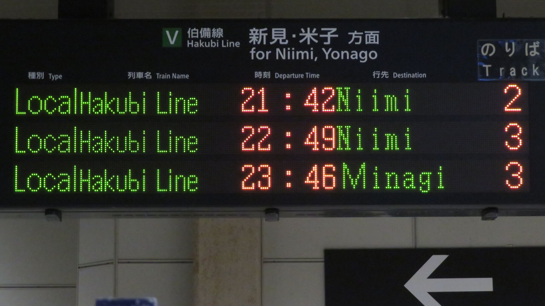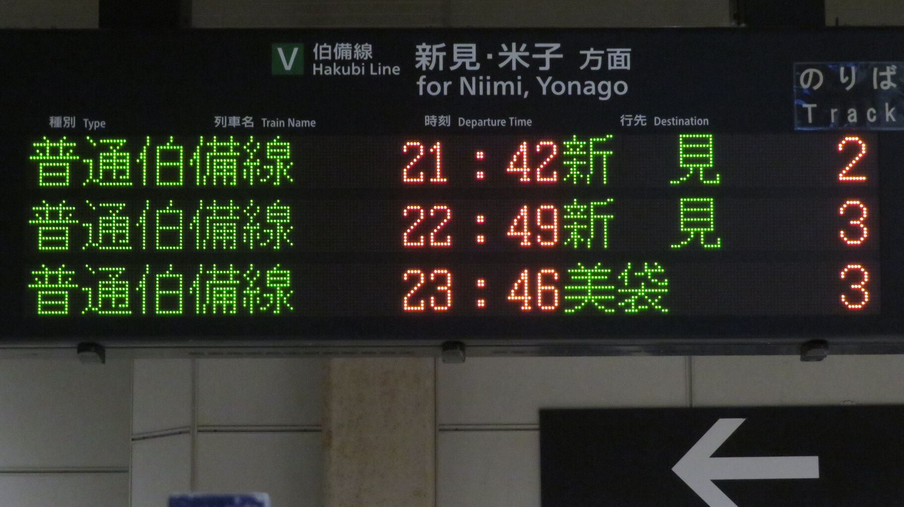 伯備線上りと桃太郎線は、最終列車が既に発車しており、「★★★本日は終了しました★★★」 表示が出ていました。