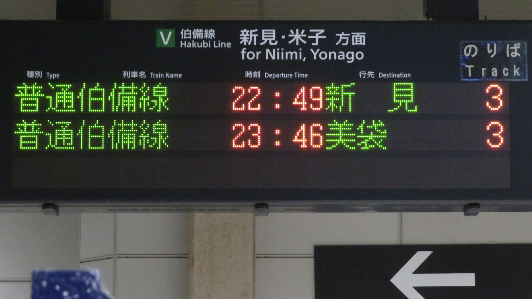 2・3番のりばの発車標も、普通 美袋行きのみ表示されています。