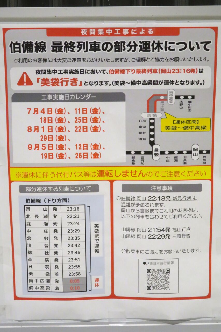 2025年7月以降のほぼ毎週金曜日、伯備線では夜間集中工事のため、岡山発 備中高梁行きの最終列車が、美袋(みなぎ)~備中高梁駅間で運転取り止めとなっています。