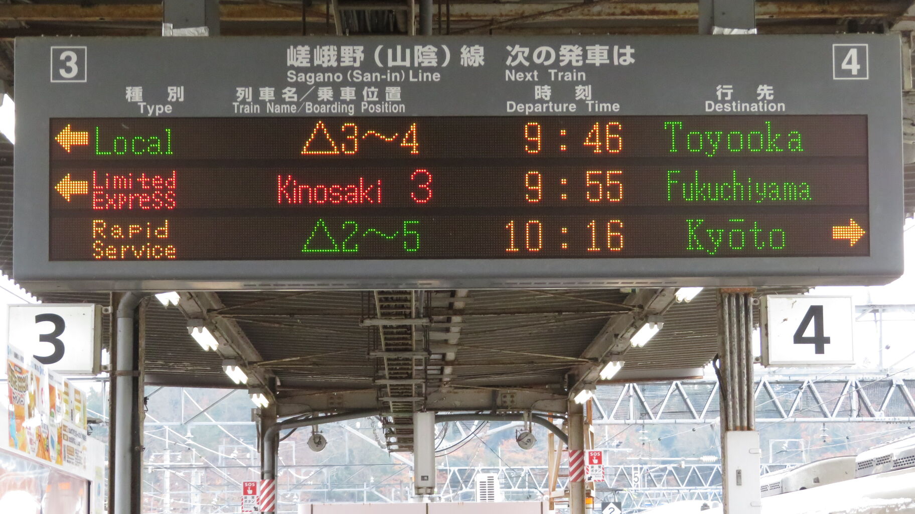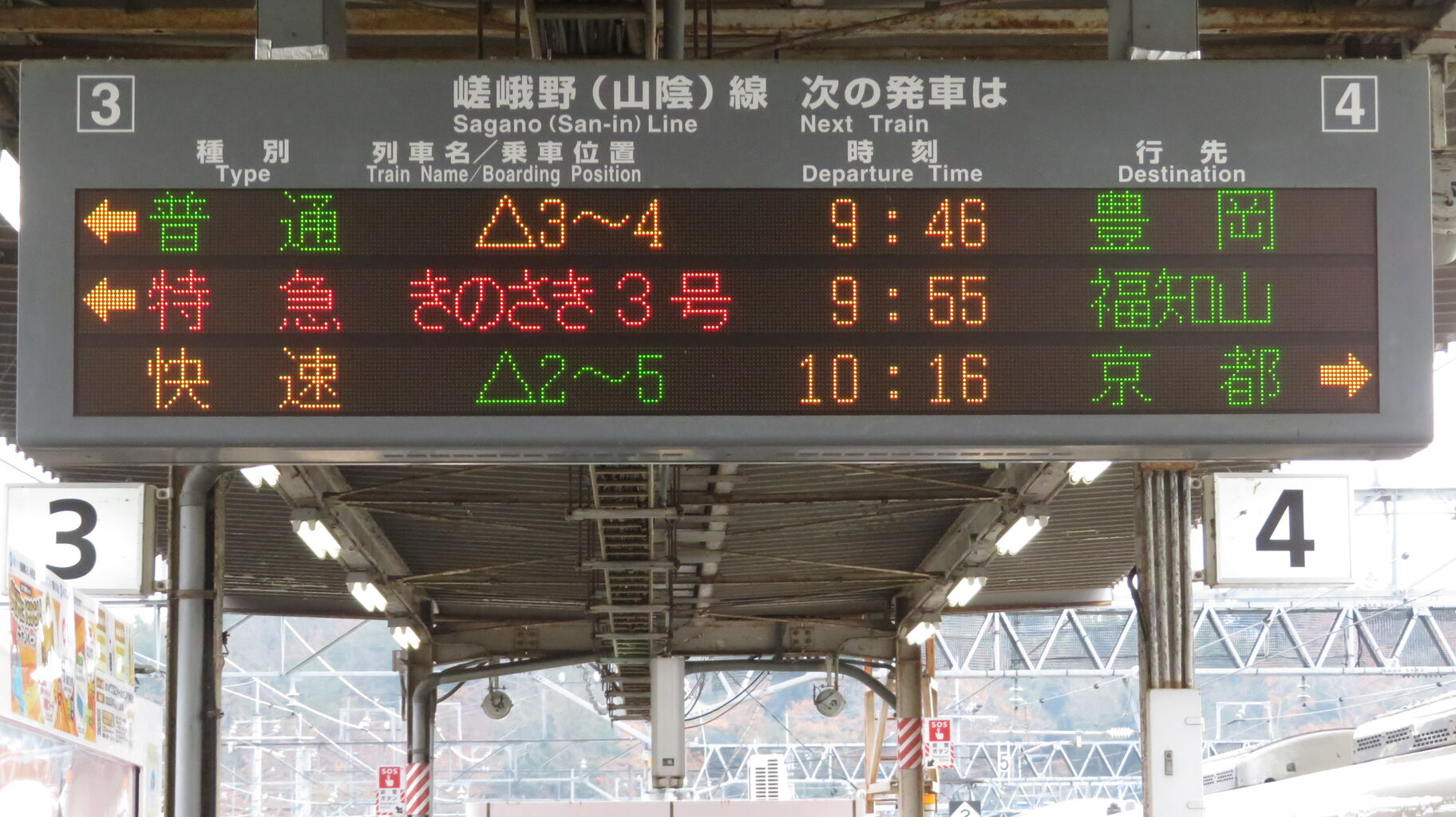 普通 豊岡行きと 快速 京都行きとで 乗車位置表示の色が異なっていますが、なぜなのかは分かりません。