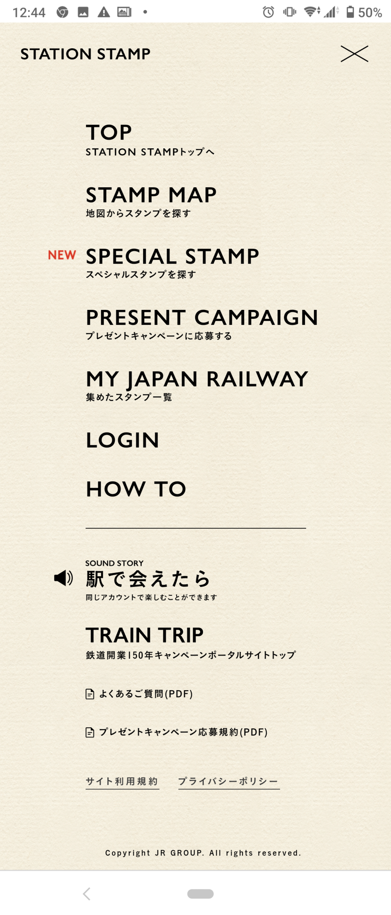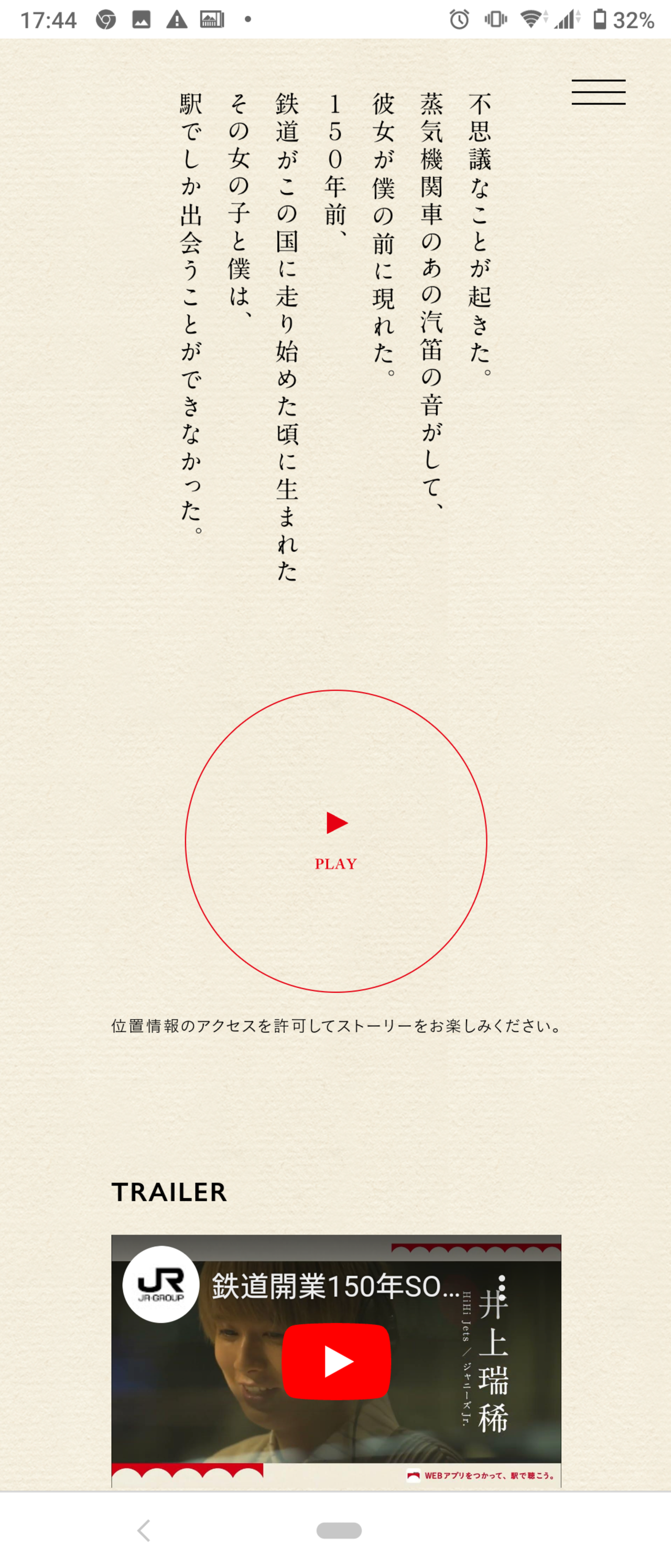 まずは、スマホで 鉄道開業150年キャンペーンのポータルサイト (TRAIN TRIP) にアクセスします。