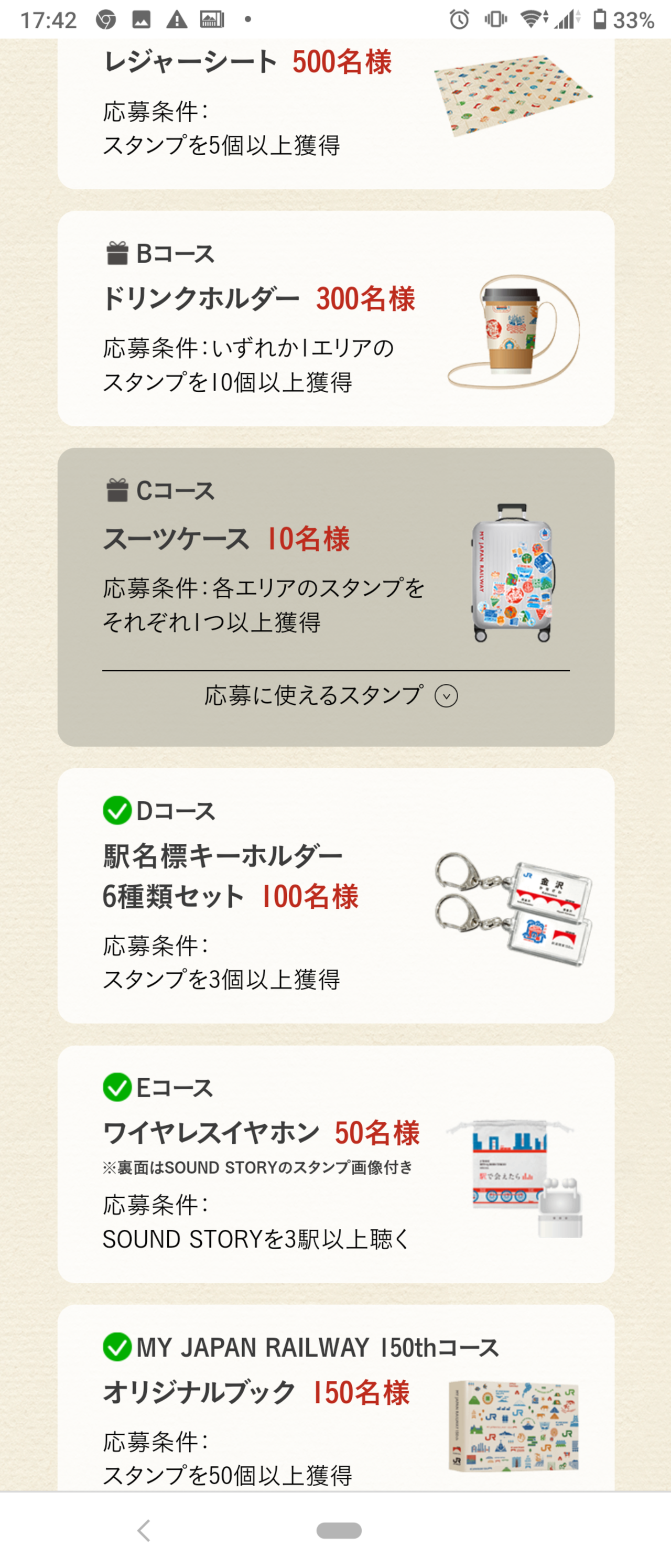 Eコース(ワイヤレスイヤホン)は、「駅で会えたら」 の音声ストーリーを3駅以上再生すると、応募できるようになります。