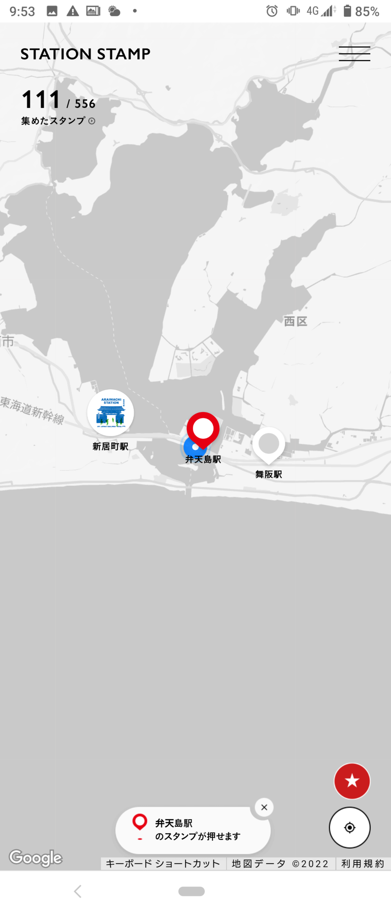 STAMP MAPが表示され、今いる場所が青い円で表示されます。