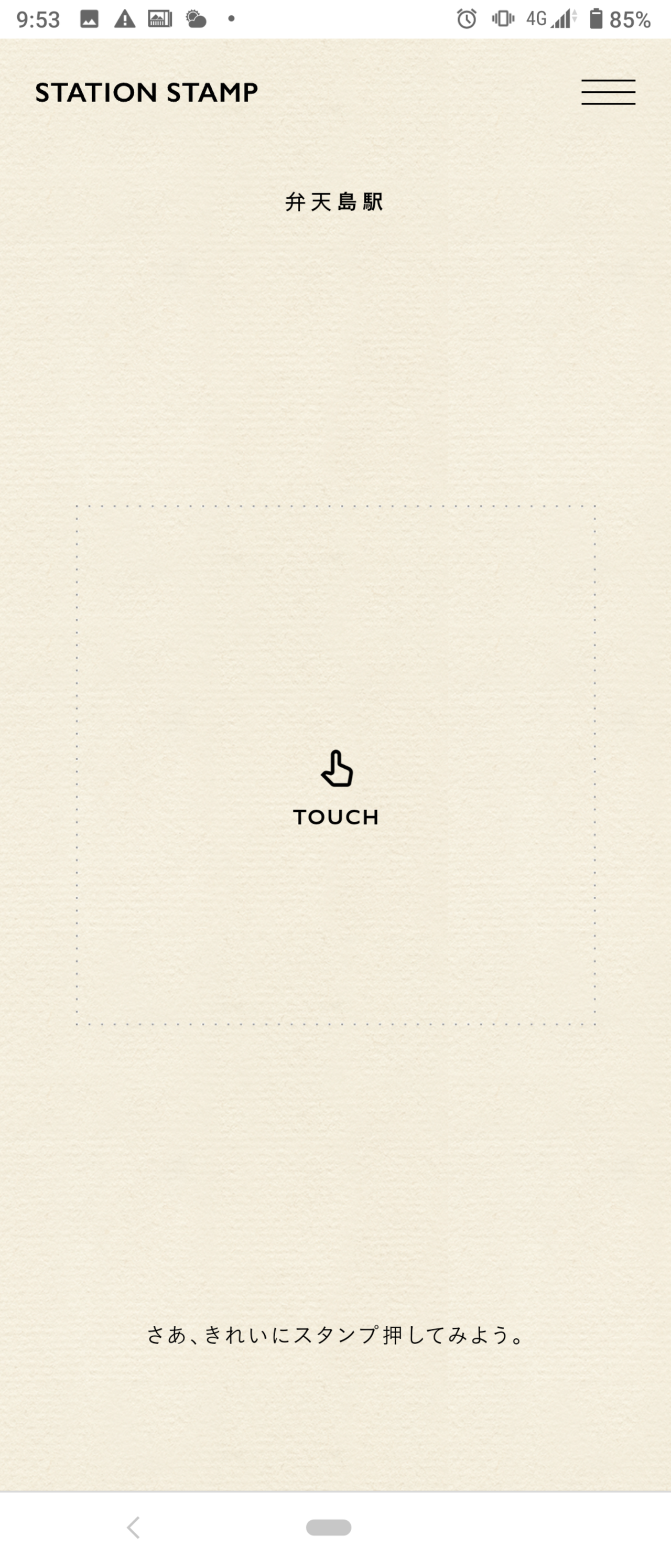 「STATION STAMP」 の画面で 右上の三本線をタップし、メニュー画面を開きます。