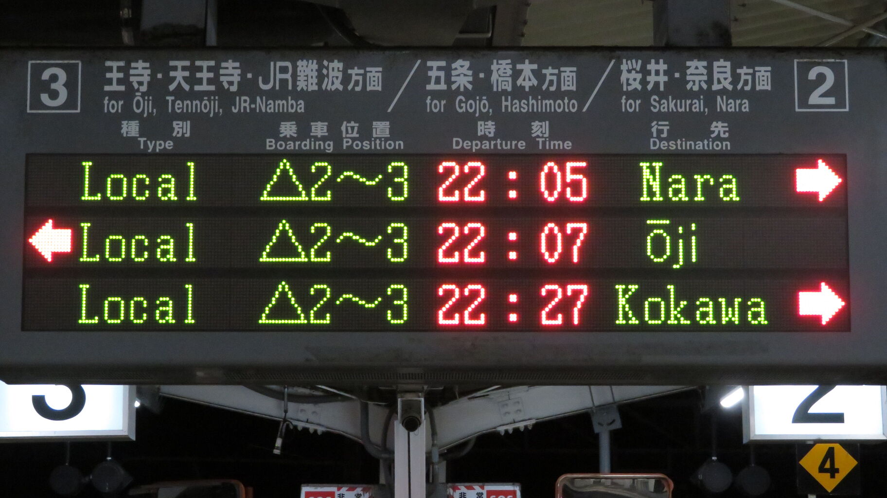 22時5分発の奈良行きが最終列車となっています。
