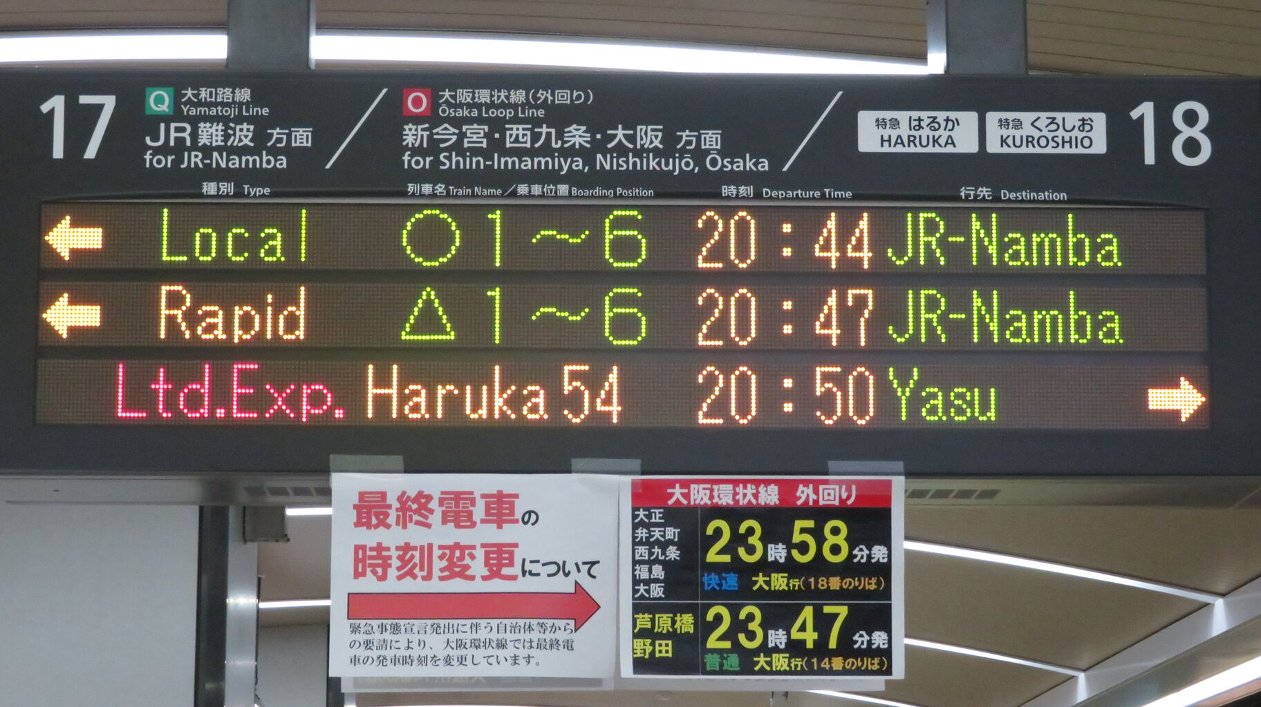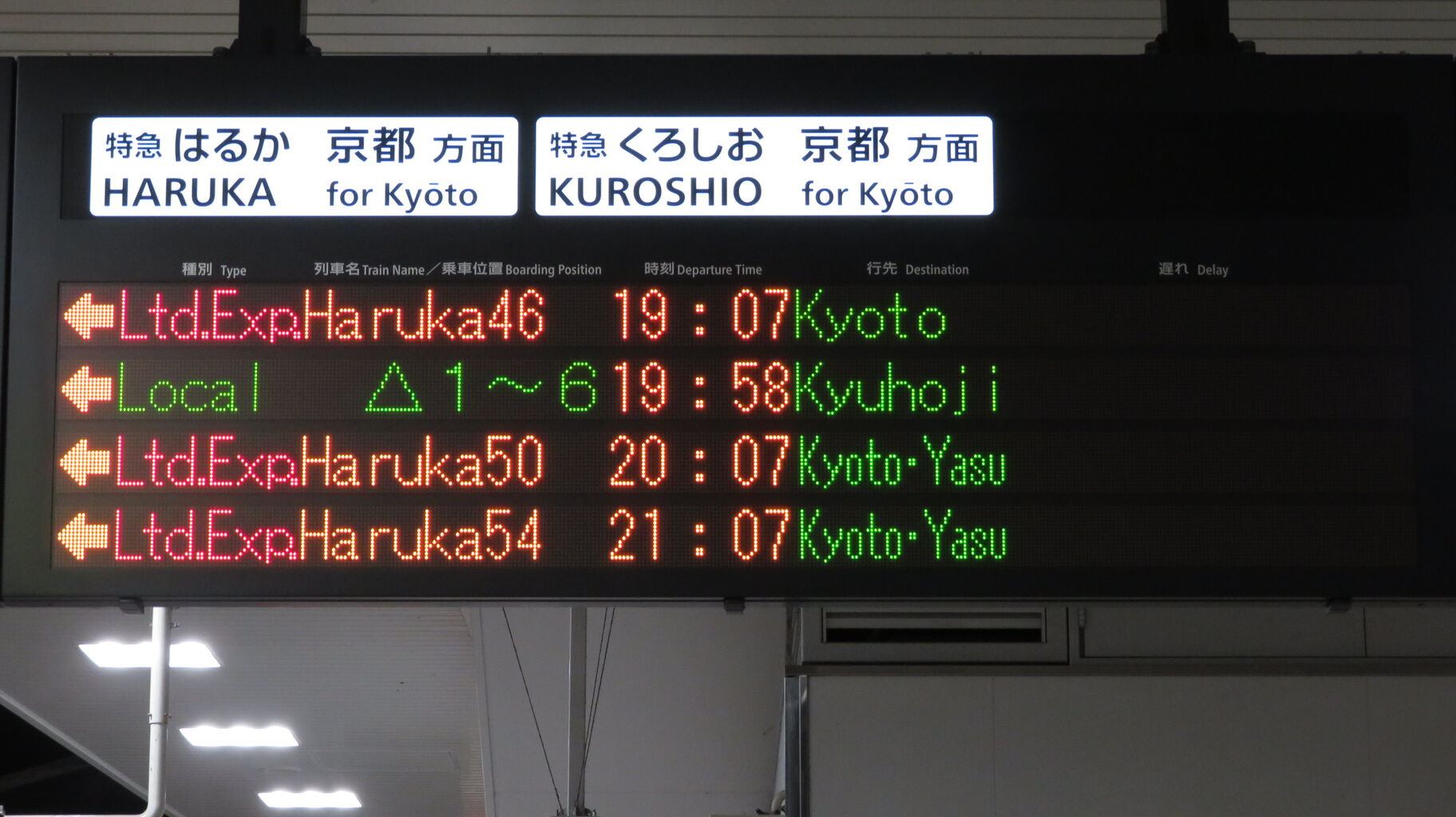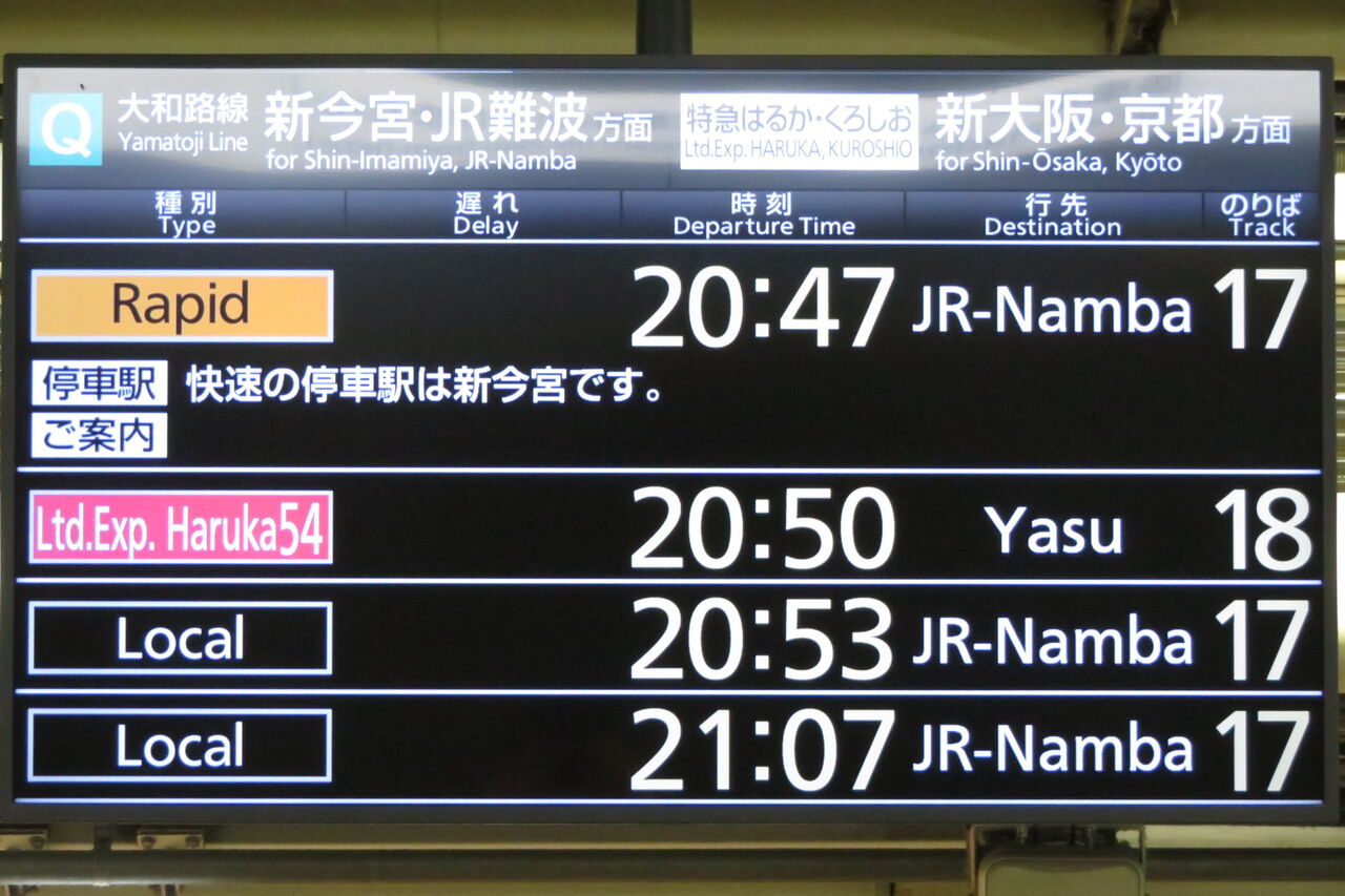 2022年4月に新大阪駅を訪れて確認したところ、特急はるかの野洲行きは 「京都方面 野洲」 「Kyoto・Yasu」 と表示されていました。