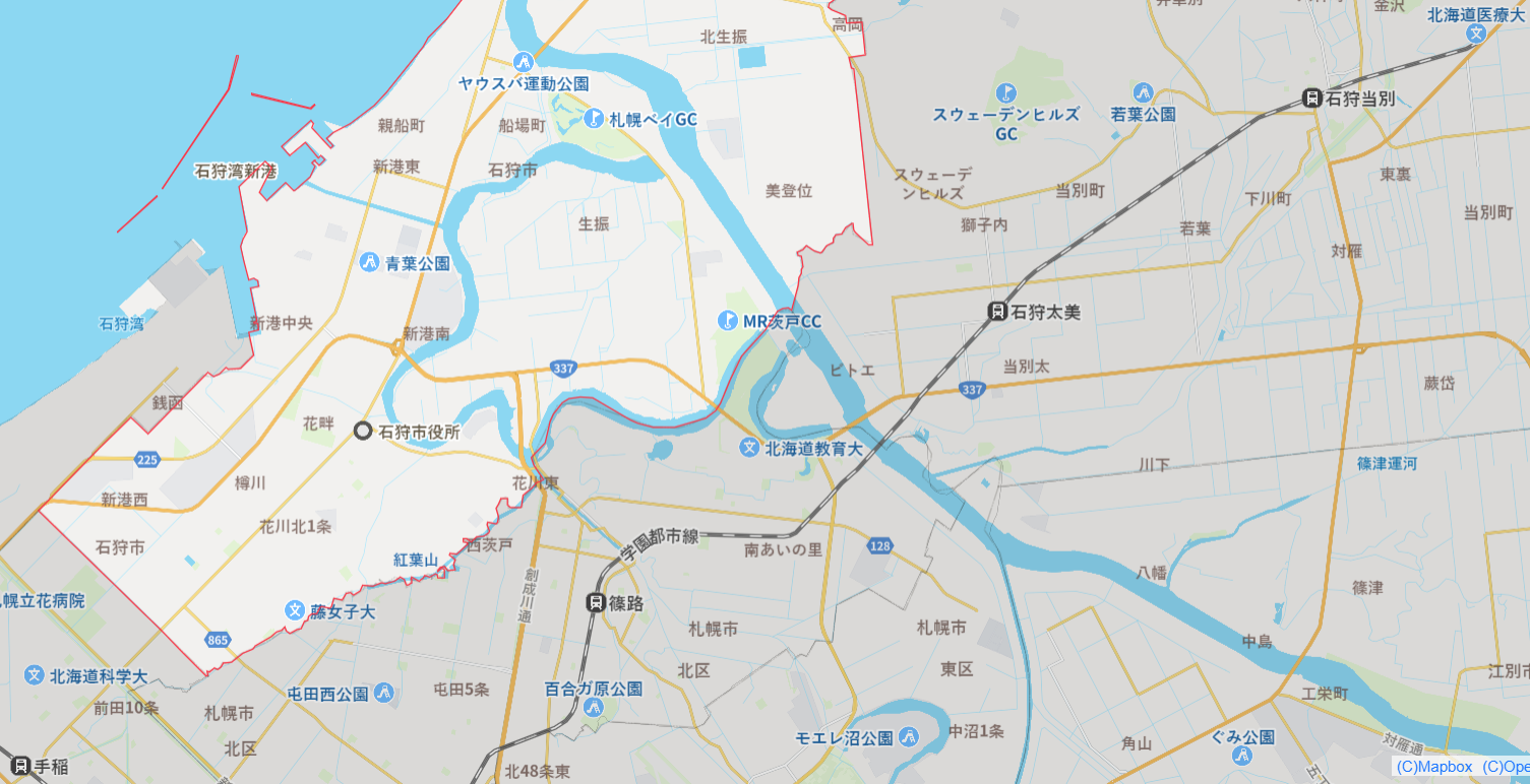 ※Yahoo!地図より引用。白くなっているエリアが石狩市。