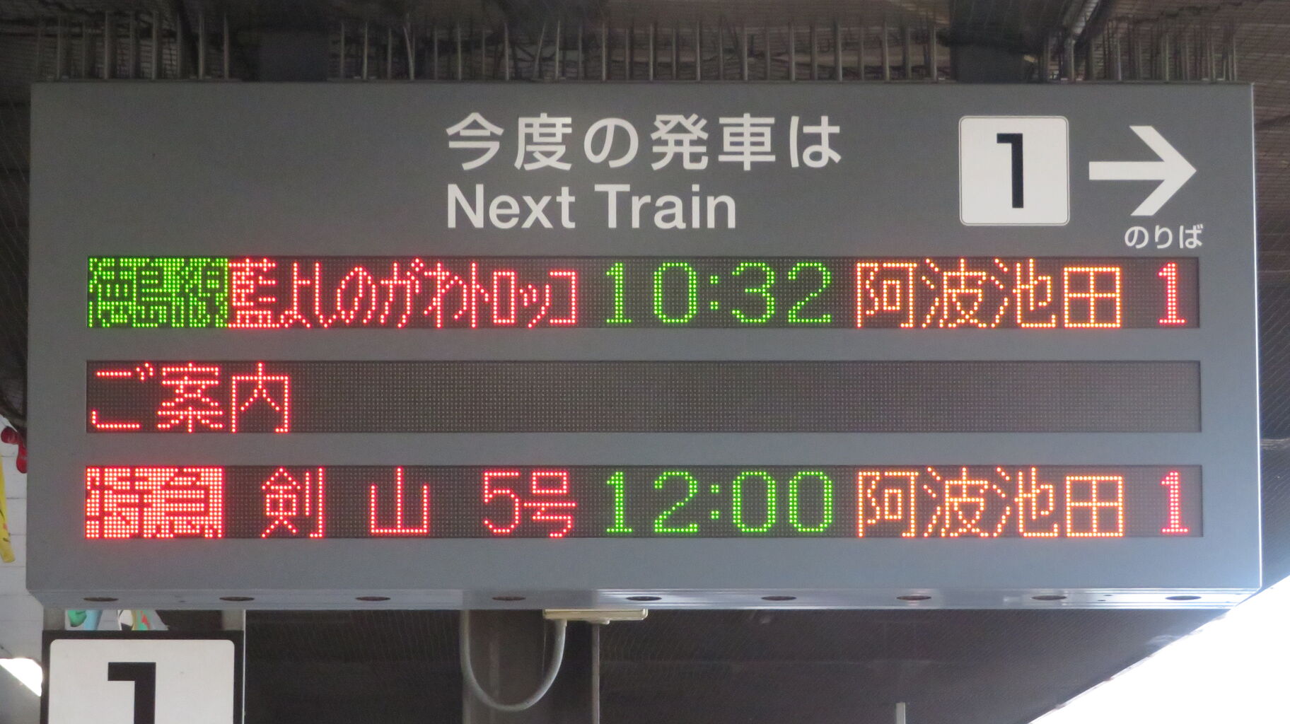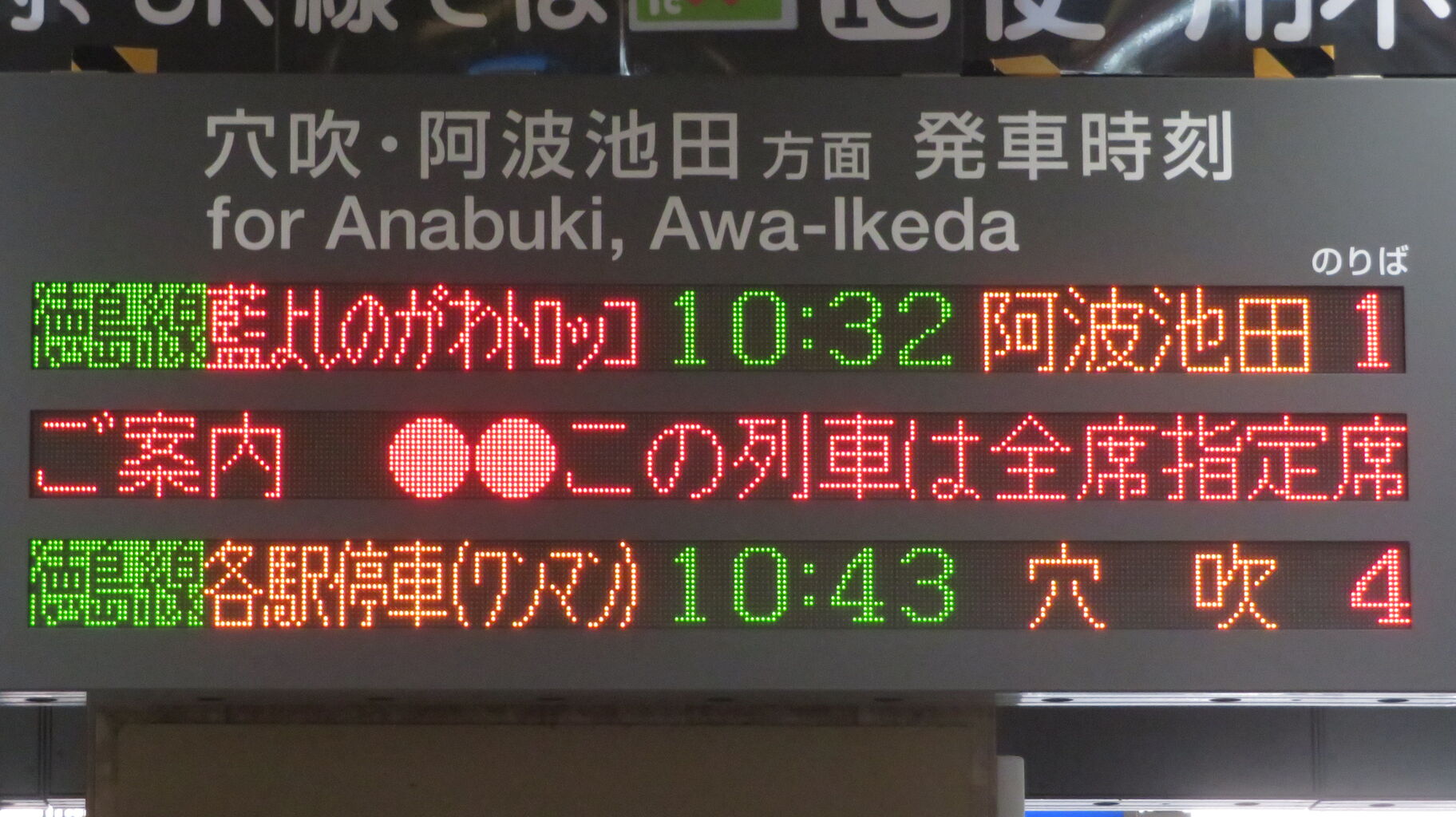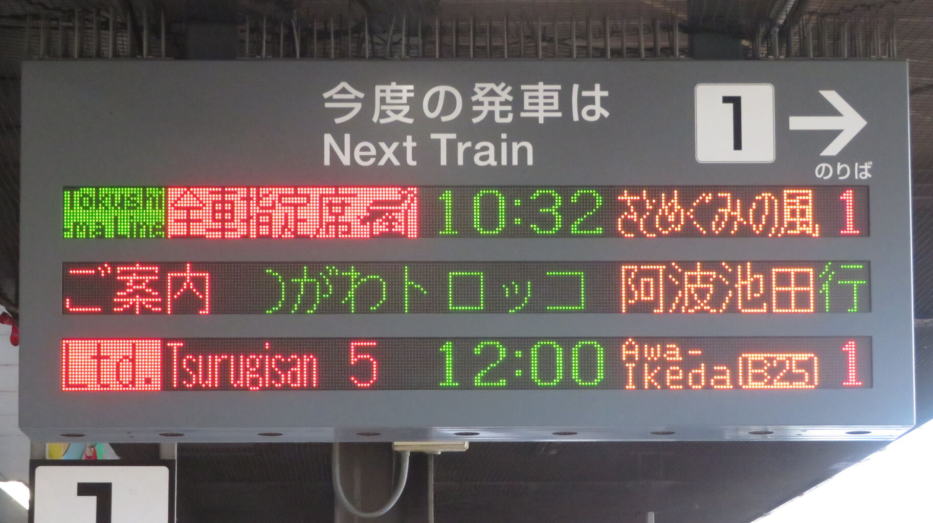 一番上の段に、「藍よしのがわトロッコ」 阿波池田行きの表示が出ていました。