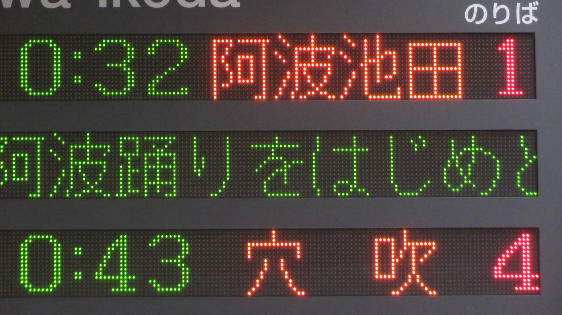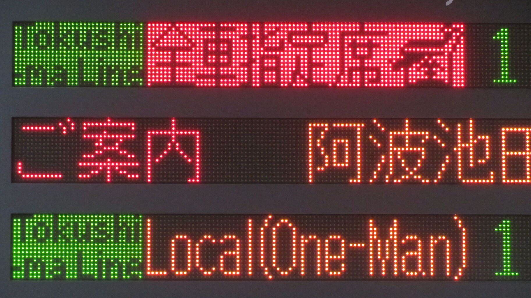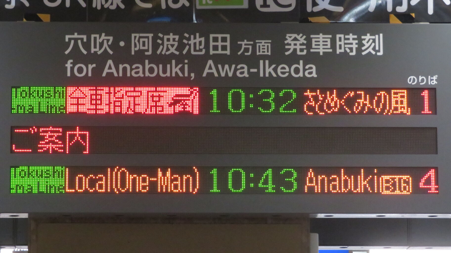 一番上の段に、「藍よしのがわトロッコ」 阿波池田行きの表示が出ていました。