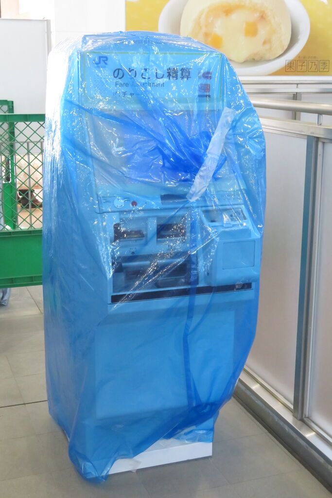 ただし、ICカードのチャージなどは ICOCAエリアが拡大されるまで できないため、白い紙を貼って 案内表記を隠してありました。