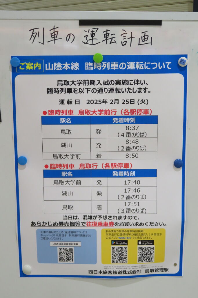 2025年2月25日、鳥取大学 前期入試の実施に伴い、山陰本線 鳥取~宝木(ほうぎ)駅間で臨時列車が1往復運転されました。