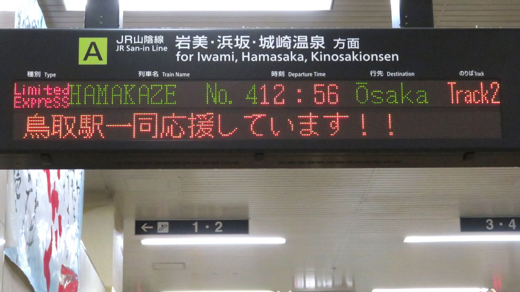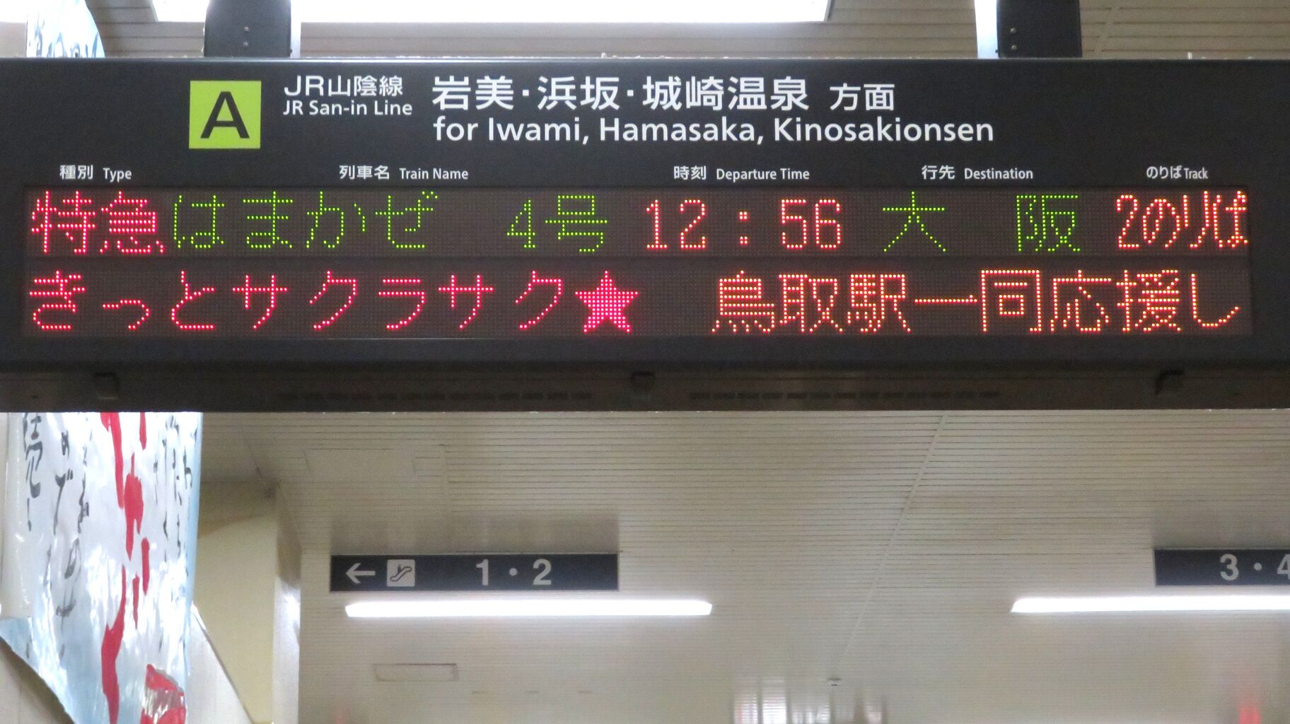 ちなみに、この日は 山陰線上りの発車標で、「★★★受験生のみなさまへ★★★ 今までの努力を発揮する時がきましたね。自信を持って行ってらっしゃい!きっとサクラサク★ 鳥取駅一同応援しています!!」 とメッセージが流れ続けていました。