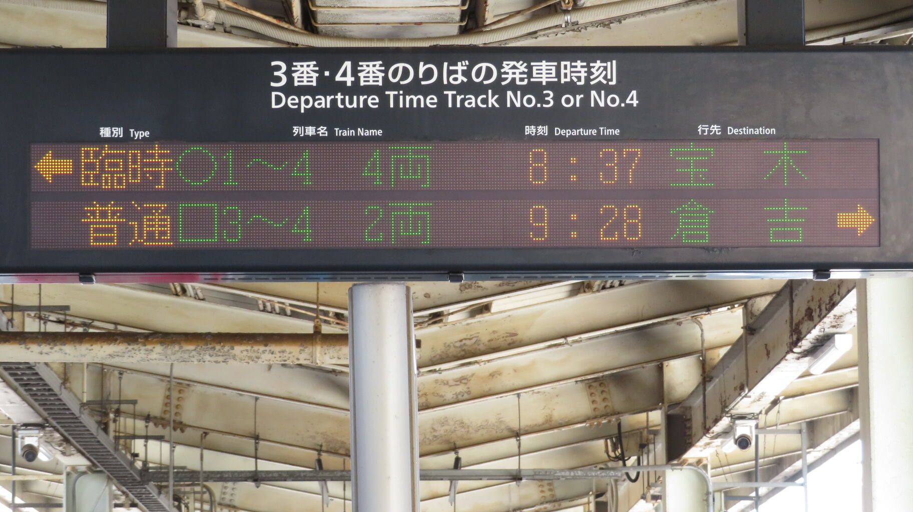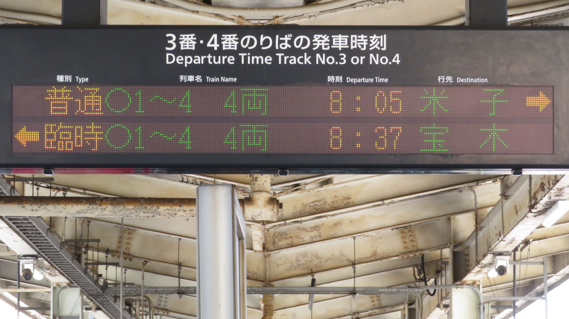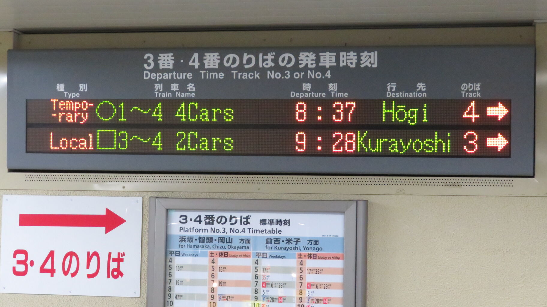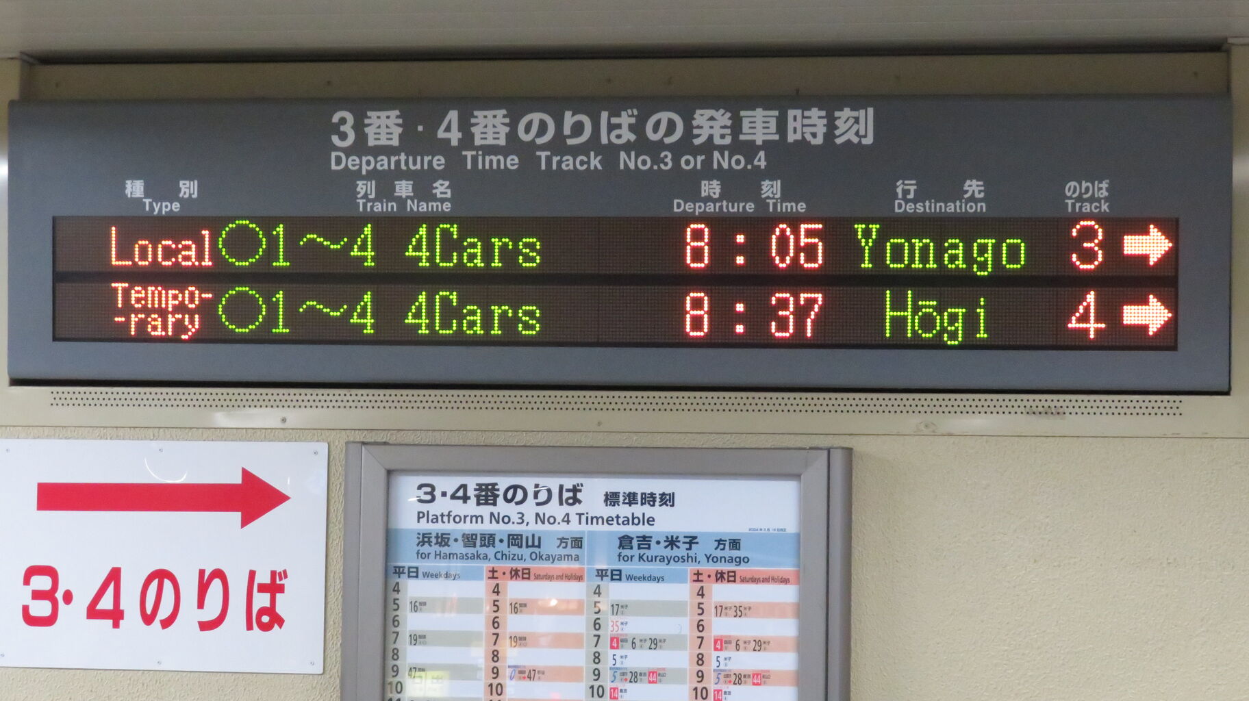 3・4番のりばの発車標にも、臨時列車 「宝木行き」 が表示されています。