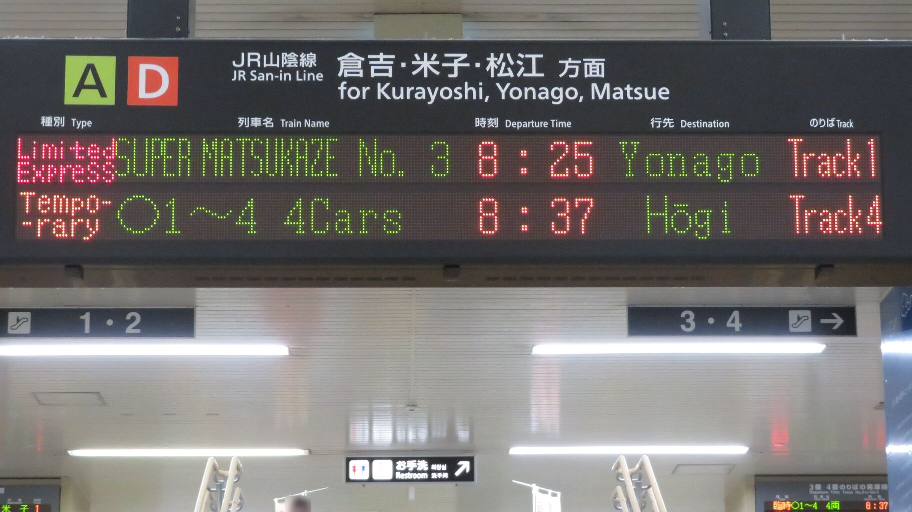 8時25分発の特急スーパーまつかぜ1号 米子行きは、1番のりばからの発車です。